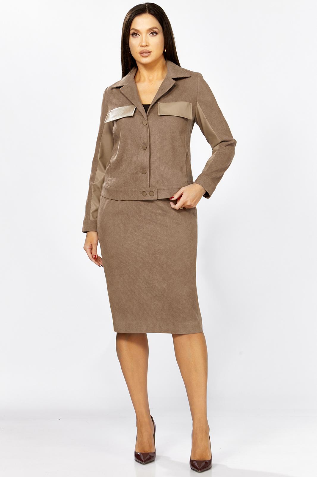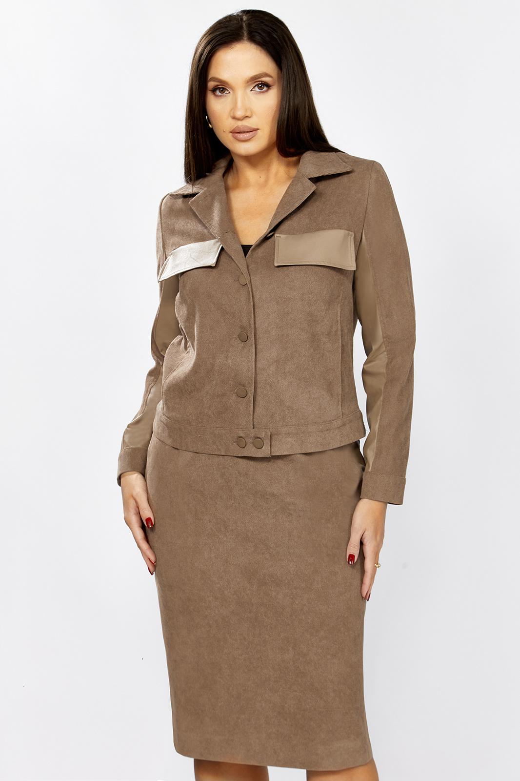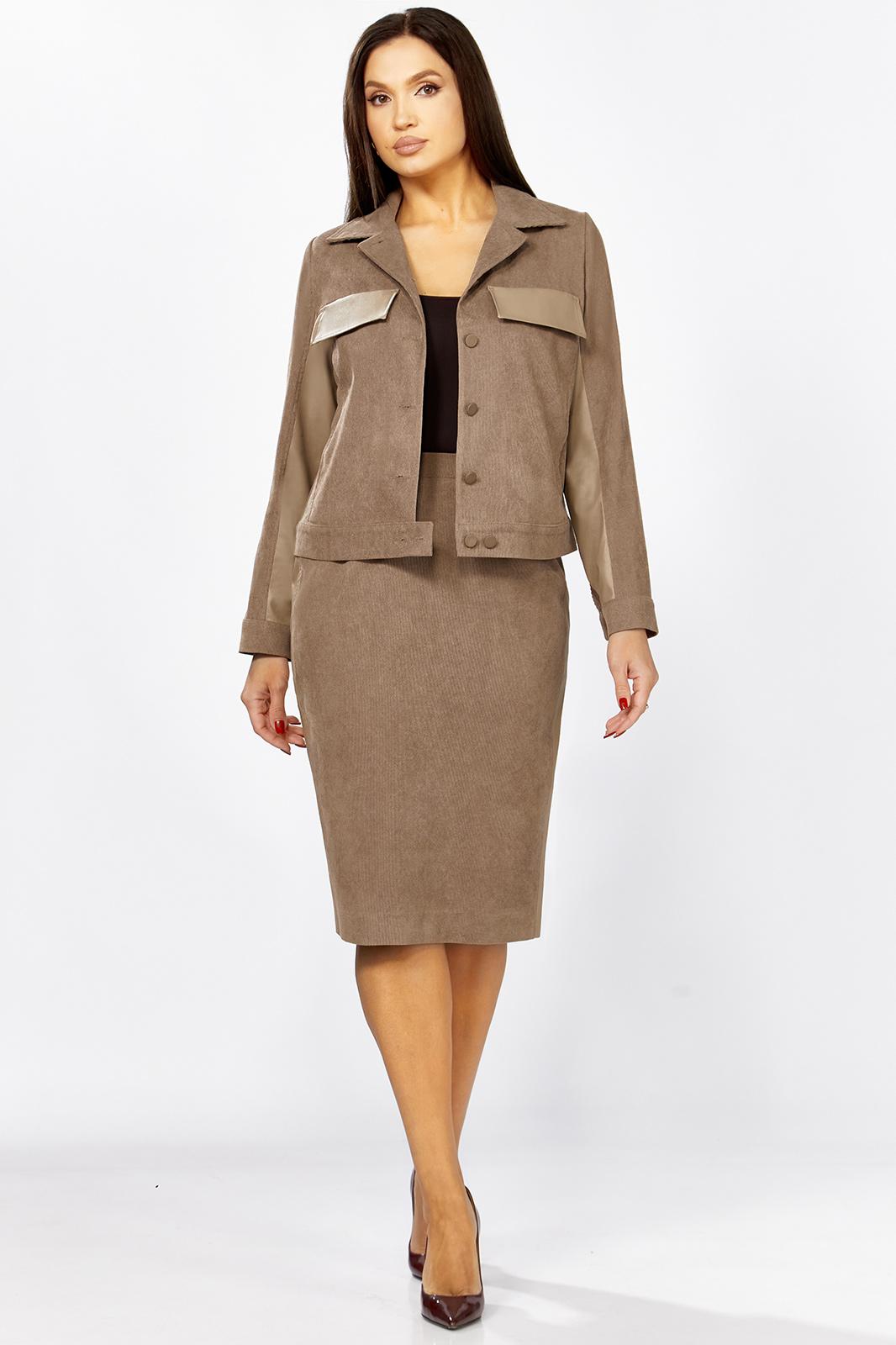 Комплект женский 2-х предметный состоящий из жакета и юбки выполненного из вельвета в мелкий рубчик. Жакет прямого силуэта с нагрудными клапанами из экокожи. В рельефе вертикальные прорезные функциональные карманы. Спинка с отрезной кокеткой и средним шмом. Рубашечный воротник. Рукав втачной двухшовный с вставкой из экокожи, по низу рукава манжета с 1 пуговицей и петлей. Застежка центральная на 6 пуговиц и петель. По низу спинки паты с 1 пуговицей. Жакет без подкладки. Длина рукава - 60 см, длина по спинке-55см. Юбка прямого силуэта с разрезом сзади, на подкладке. По бокам вставка из экокожи. Юбка на притачном поясе, по бокам эластичная резинка. Застежка сзади на потайную тесьму-молнию и пуговицу. Длина юбки по боковому шву- 64 см.