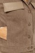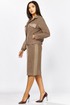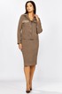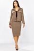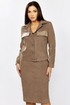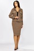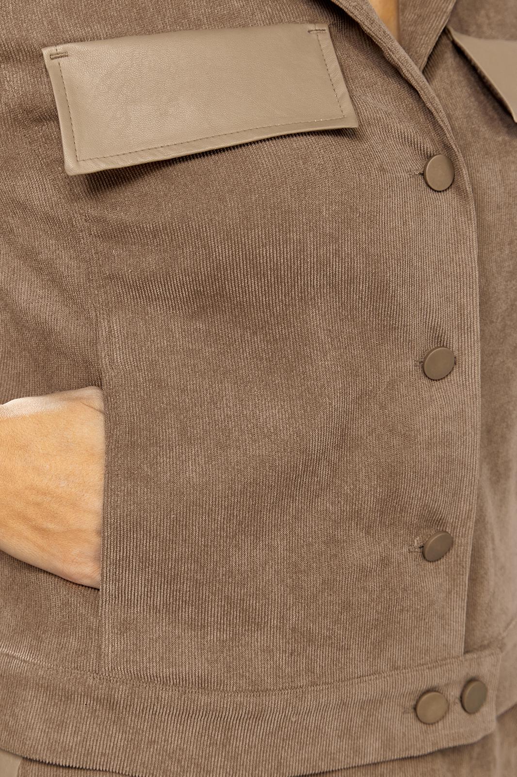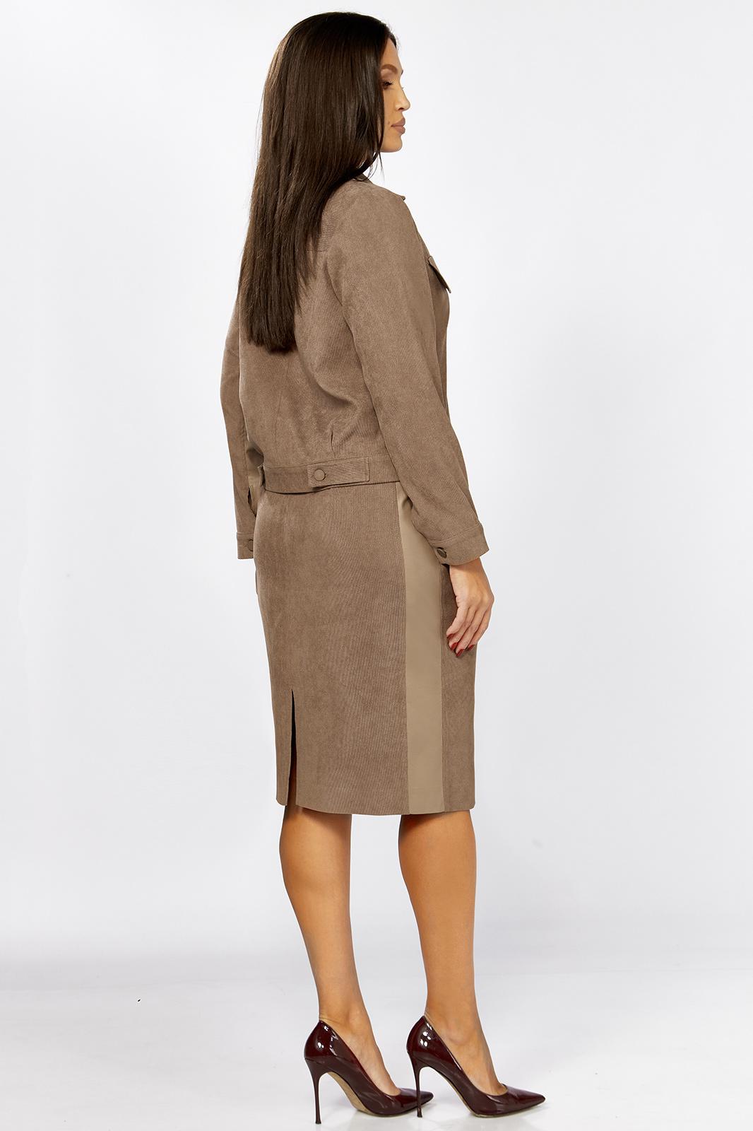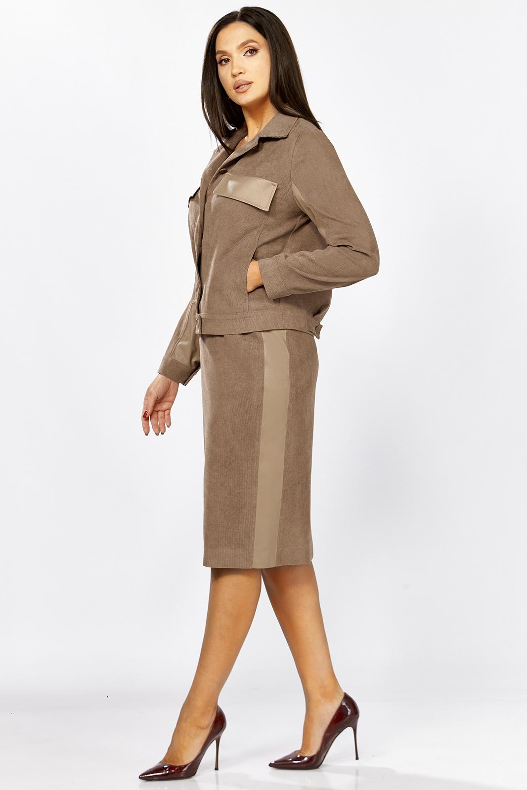Комплект женский 2-х предметный состоящий из жакета и юбки выполненного из вельвета в мелкий рубчик. Жакет прямого силуэта с нагрудными клапанами из экокожи. В рельефе вертикальные прорезные функциональные карманы. Спинка с отрезной кокеткой и средним шмом. Рубашечный воротник. Рукав втачной двухшовный с вставкой из экокожи, по низу рукава манжета с 1 пуговицей и петлей. Застежка центральная на 6 пуговиц и петель. По низу спинки паты с 1 пуговицей. Жакет без подкладки. Длина рукава - 60 см, длина по спинке-55см. Юбка прямого силуэта с разрезом сзади, на подкладке. По бокам вставка из экокожи. Юбка на притачном поясе, по бокам эластичная резинка. Застежка сзади на потайную тесьму-молнию и пуговицу. Длина юбки по боковому шву- 64 см.