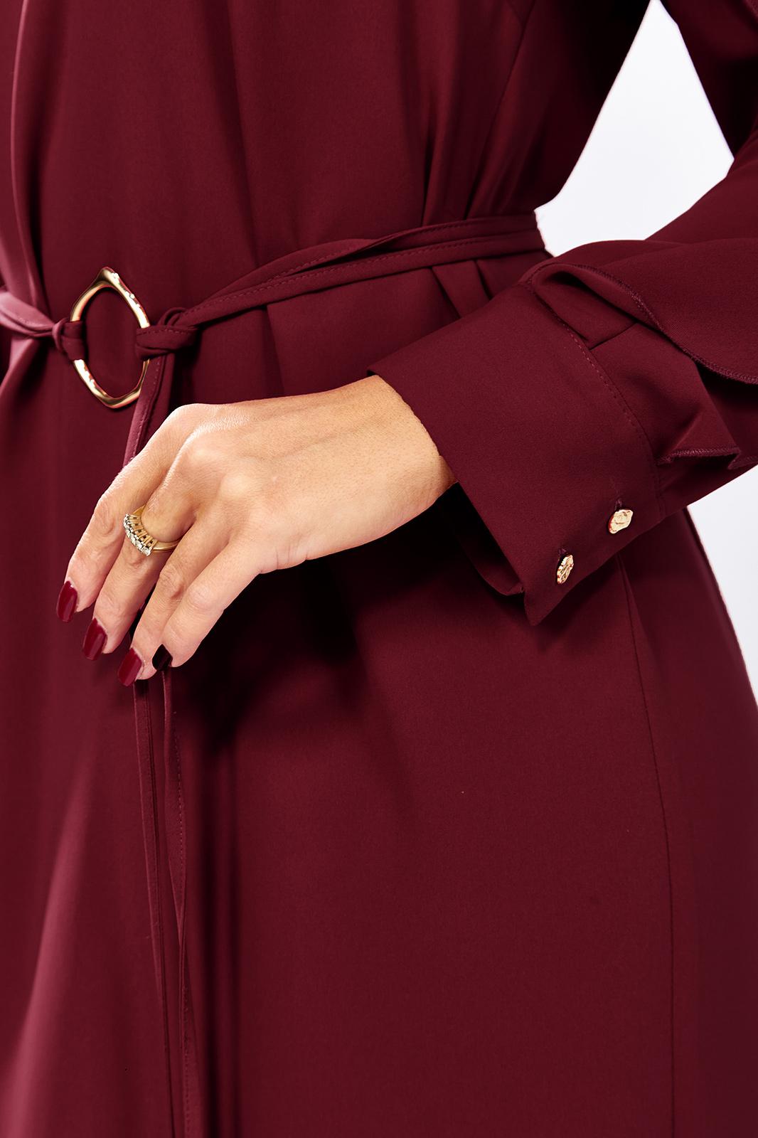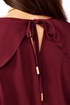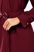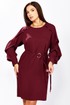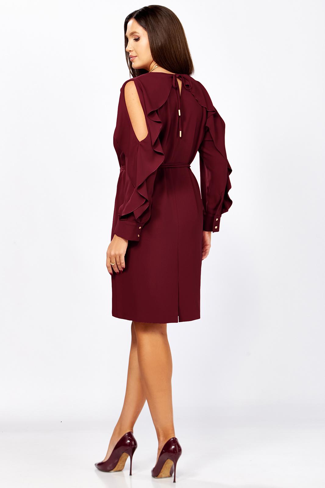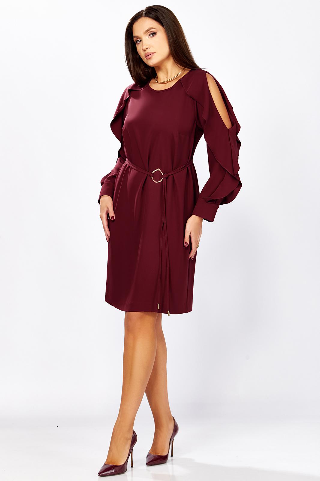 Романтичное платье прямого силуэта, без подкладки. Округлый вырез горловины обработан бейкой. Перед с нагрудной вытачкой. Рукав реглан с вырезом и двумя рюшами. Рукав с манжетой по низу. застегивается на 2 пуговицы и петли. Спинка со средним швом и вырезом «капелька» с завязками на концах с наконечниками. Имеется съемный пояс-завязки с кольцом и наконечниками на концах. Длина рукава от горловины- 69см, длина по синке-97см.
