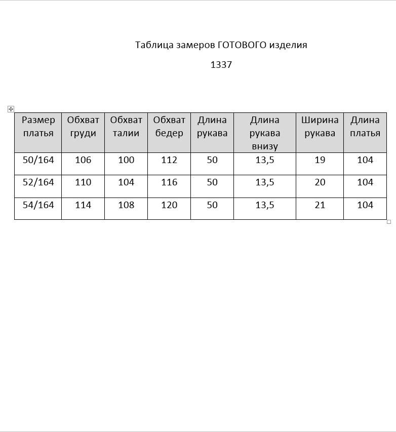 Нарядное платье А- силуэта, без подкладки. Округлый вырез горловины обработан бейкой. Перед с фигурным подрезом и разрезом по низу. По правой стороне переда легкая драпировка с декоративной пряжкой и двумя вырезами. Рукав втачной, двухшовный с вертикальным разрезом в локтевом шве. Спинка со средним швом и застежкой сзади на потайную тесьму-молнию. Длина рукава от горловины- 50 см, длина по синке-104 см.
