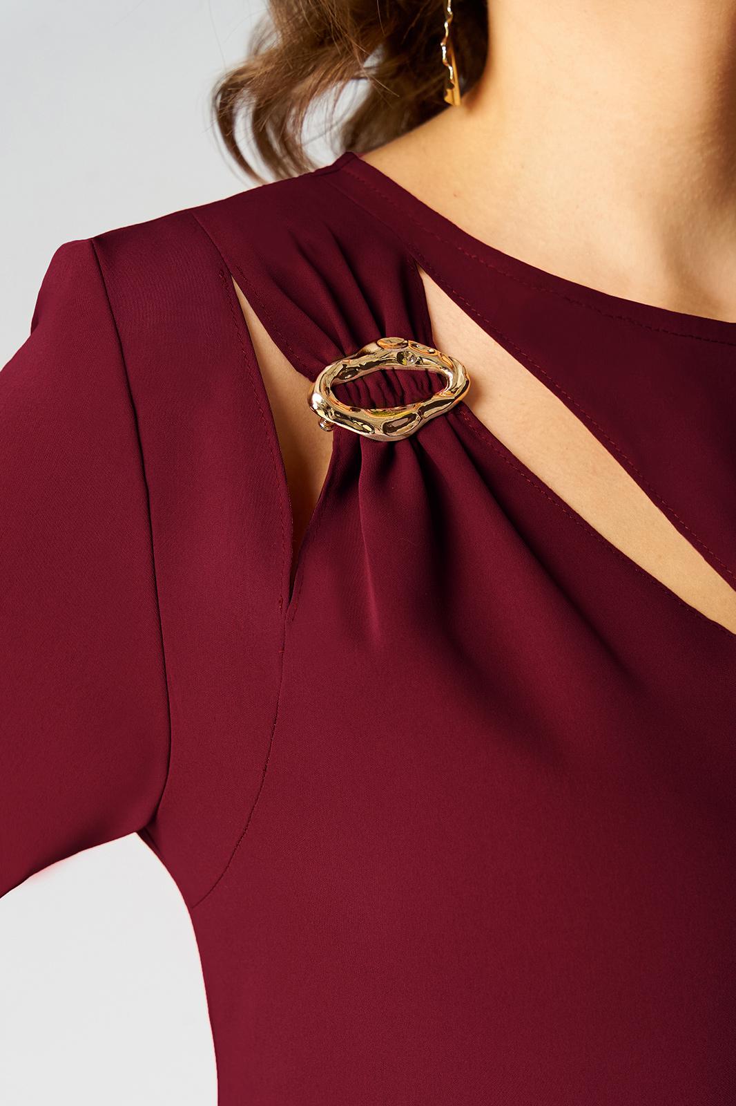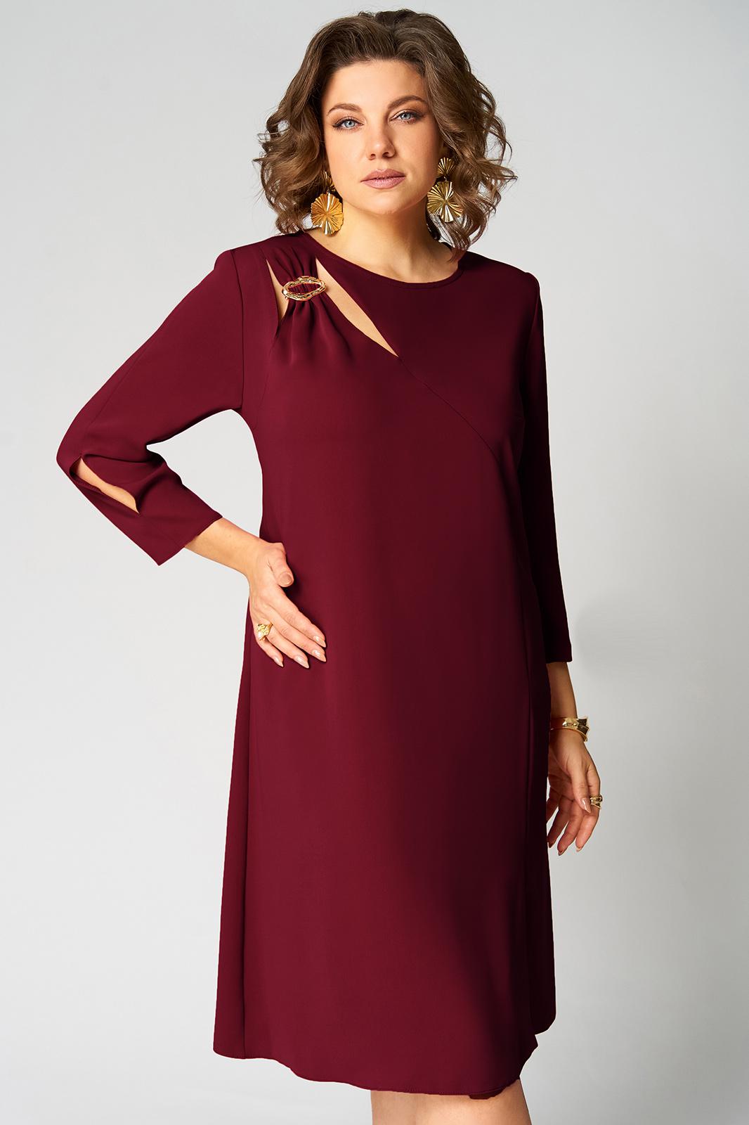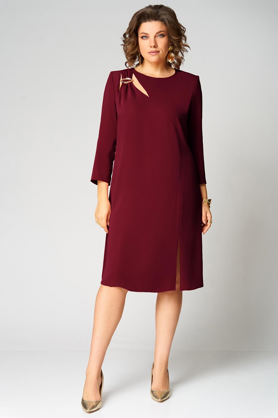 Нарядное платье А- силуэта, без подкладки. Округлый вырез горловины обработан бейкой. Перед с фигурным подрезом и разрезом по низу. По правой стороне переда легкая драпировка с декоративной пряжкой и двумя вырезами. Рукав втачной, двухшовный с вертикальным разрезом в локтевом шве. Спинка со средним швом и застежкой сзади на потайную тесьму-молнию. Длина рукава от горловины- 50 см, длина по синке-104 см.