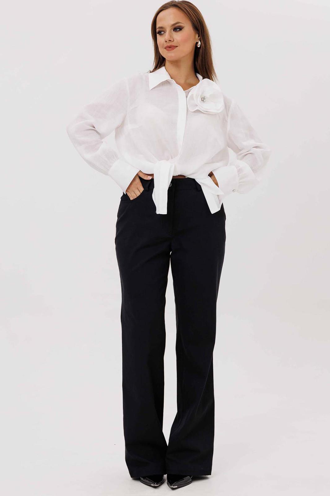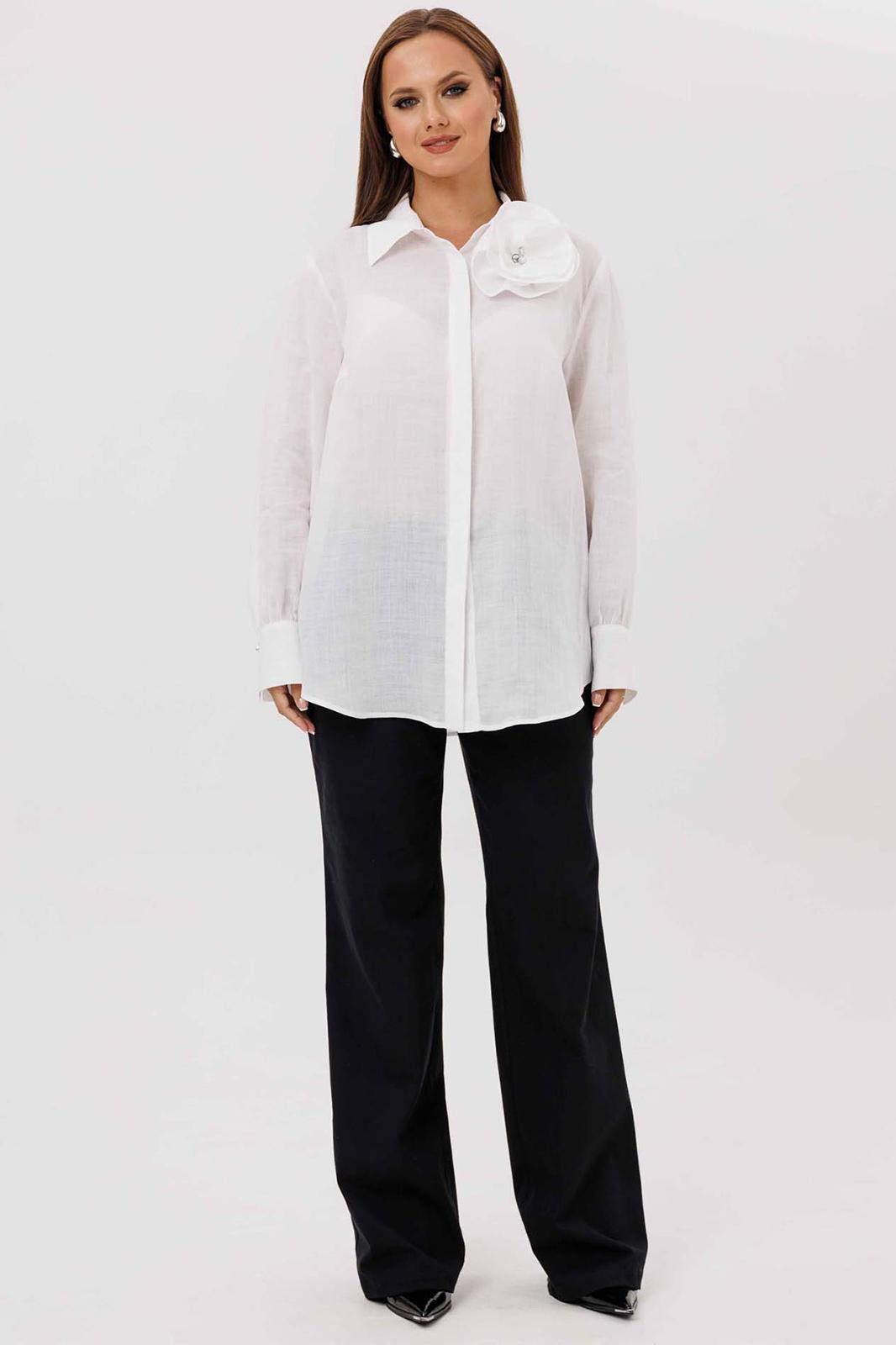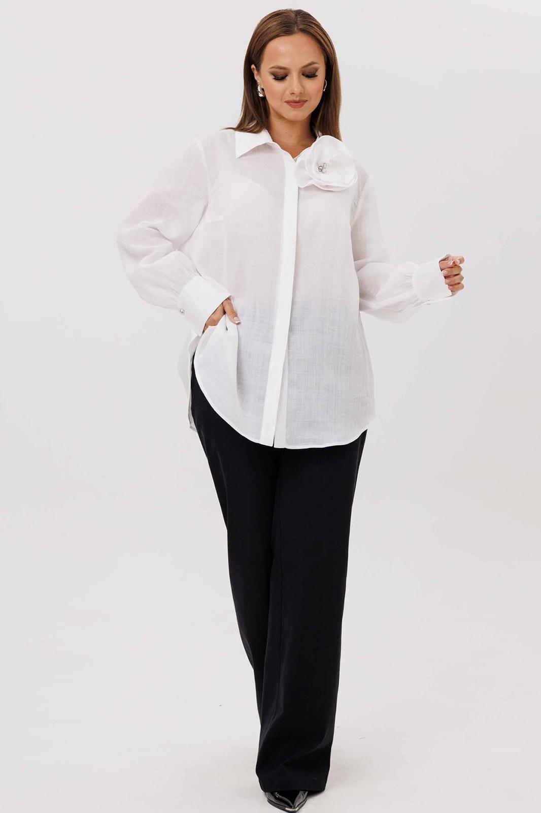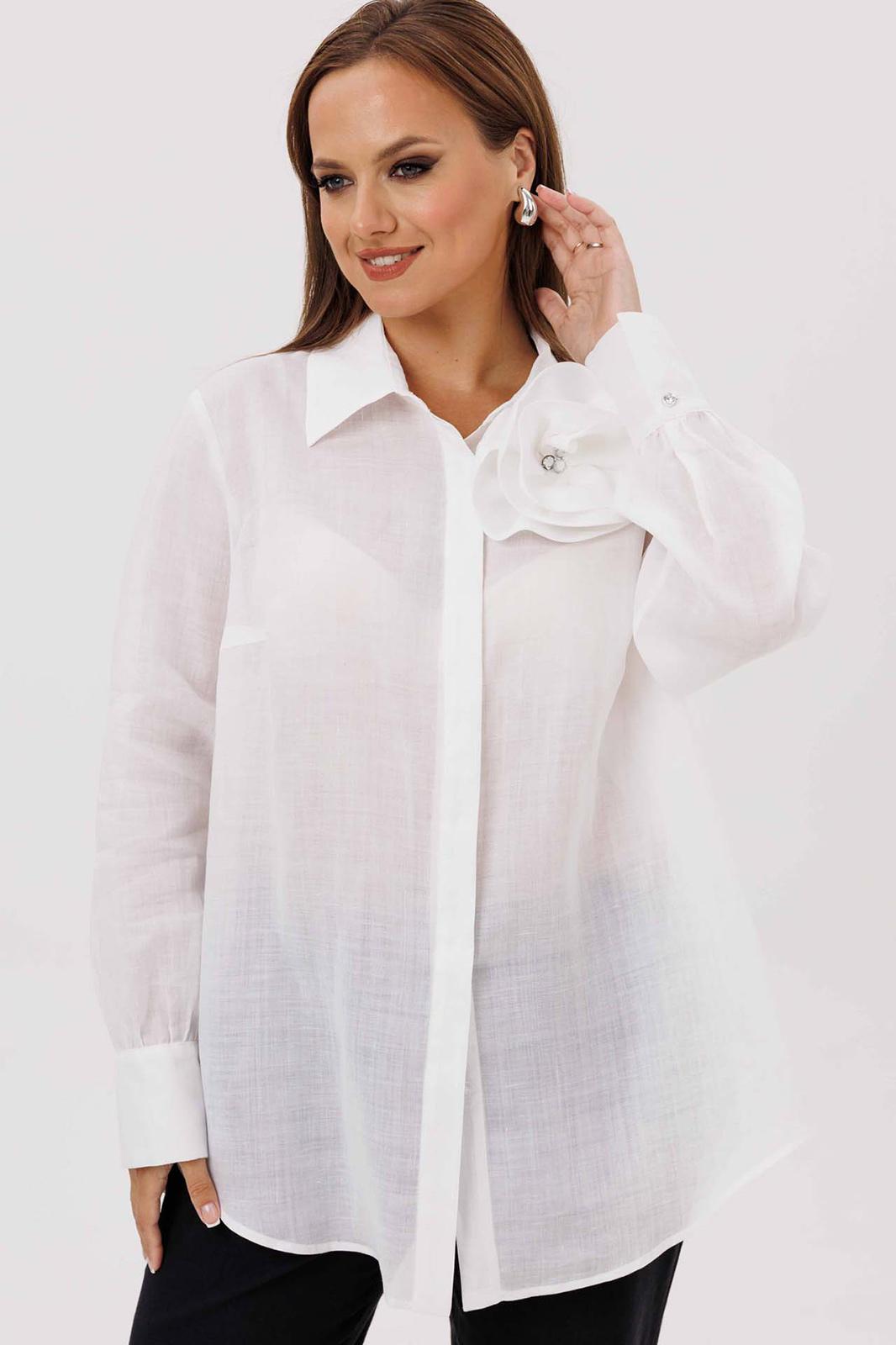 Блуза женская, прямого силуэта с потайной застежкой. Перед с нагрудными вытачками. Спинка с отрезной кокеткой. Воротник рубашечного типа, с отрезной стойкой. Рукав тачной, одношовный, с манжетой по низу. Низ фигурный. Дополняет модель декоративный цветок (съемный, пуговица)