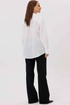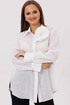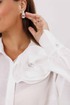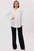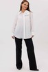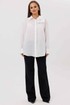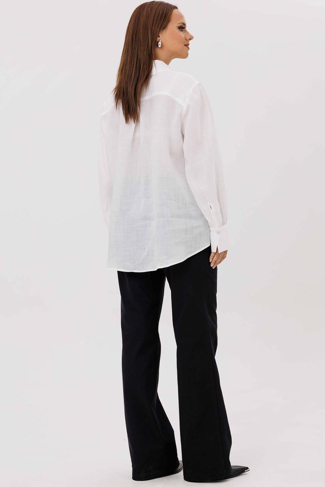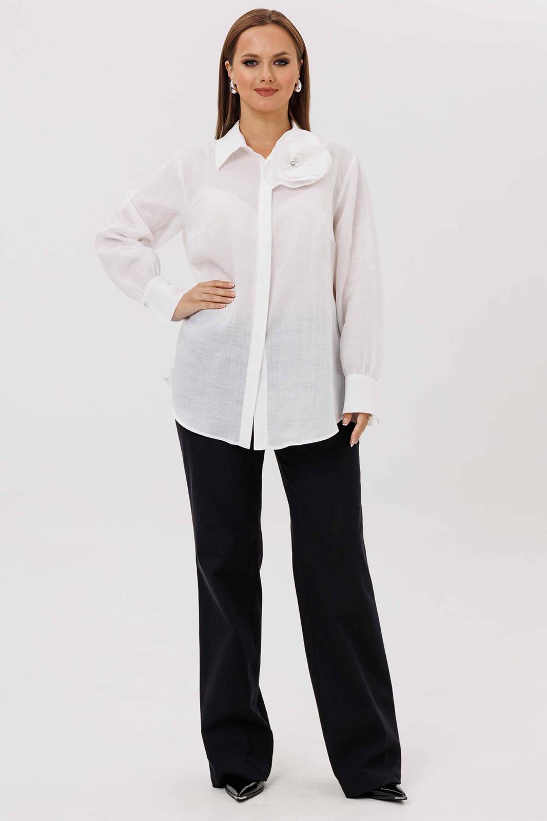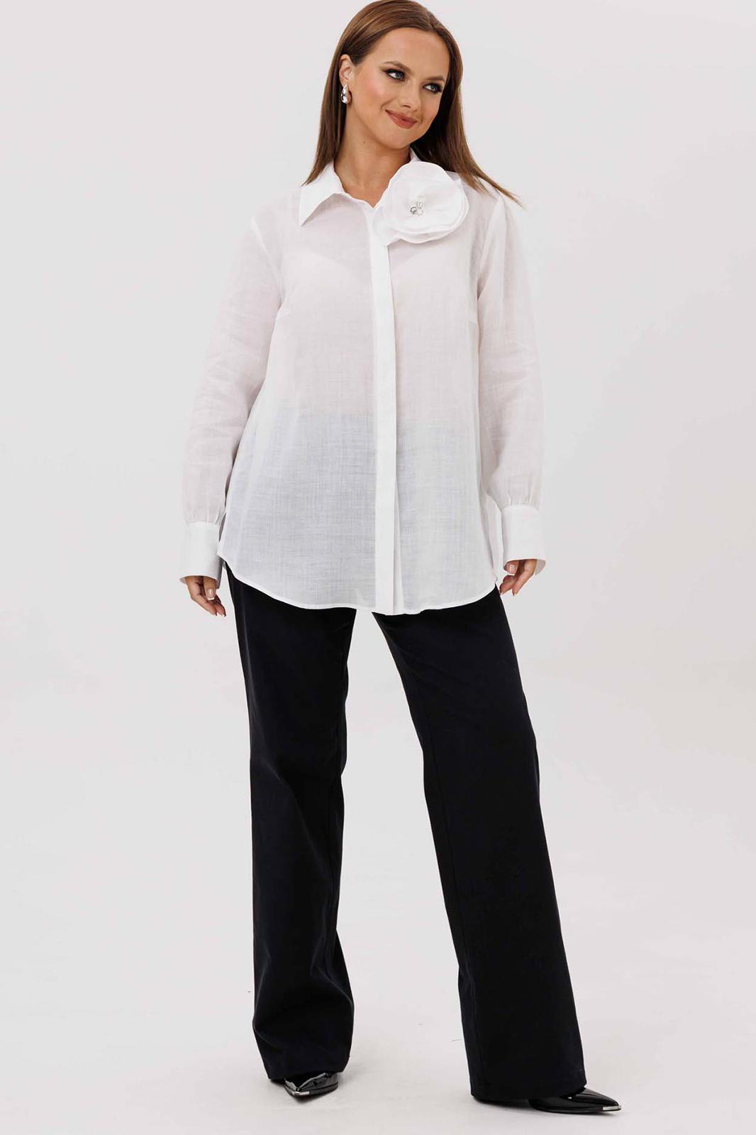 Блуза женская, прямого силуэта с потайной застежкой. Перед с нагрудными вытачками. Спинка с отрезной кокеткой. Воротник рубашечного типа, с отрезной стойкой. Рукав тачной, одношовный, с манжетой по низу. Низ фигурный. Дополняет модель декоративный цветок (съемный, пуговица)