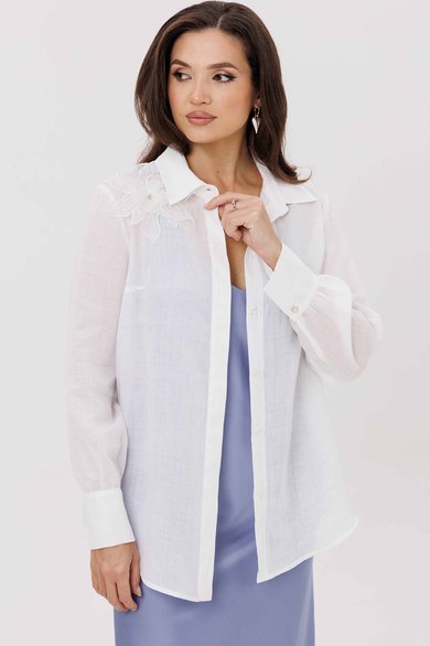 Блуза женская, прямого силуэта с потайной застежкой. Перед с нагрудными вытачками. Спинка с отрезной кокеткой. Воротник рубашечного типа, с отрезной стойкой. Рукав тачной, одношовный, с манжетой по низу. Низ фигурный. Украшает блузу декоративный цветок (не съемный).
