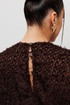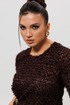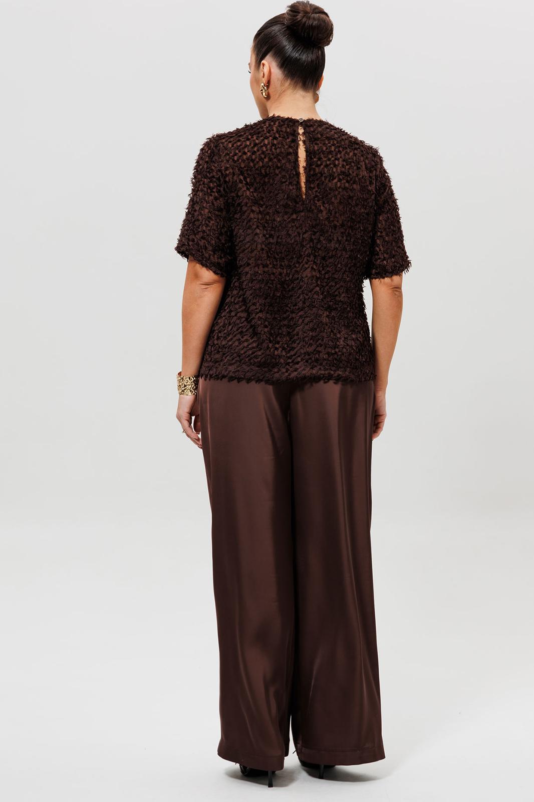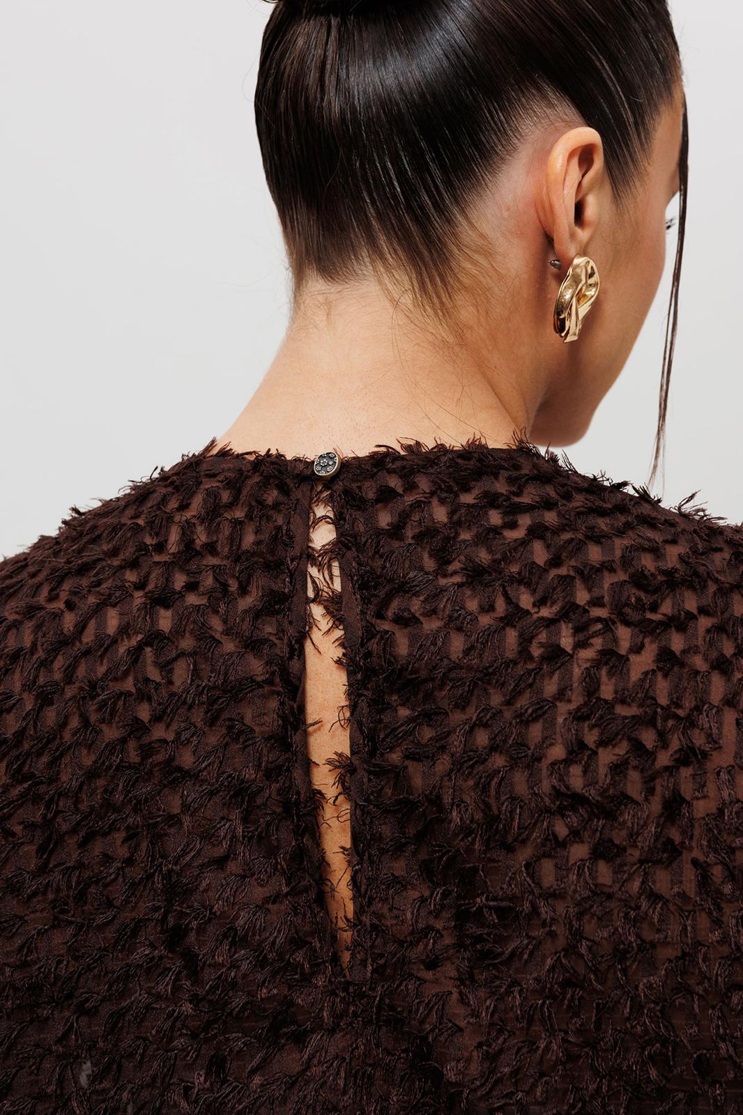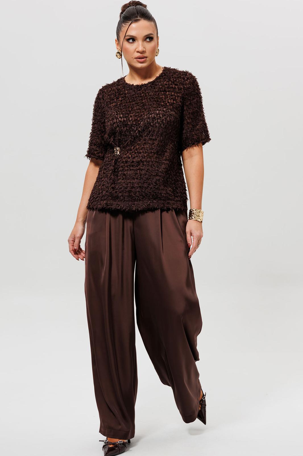 Блуза представлена в трендовом шоколадном оттенке, выполнена из лёгкой ткани травка на шифоновой основе, прямого силуэта. Перед с нагрудными вытачками и декоративным элементом: небольшие складки, которые фиксируются пришивным декоративным элементом. На спинке обработана застёжка на петлю и пуговицу. Рукав втачной. Эта коричневая блузка из ткани-травка — образец уникального дизайна и внимания к деталям. Модель с коротким рукавом украшена изящной золотой пришивной брошью и изысканной сборкой на боку, создающей мягкий объем. Особенность фасона — элегантная застежка-капелька на пуговице на спинке, которая добавляет образу индивидуальности. Блузка выполнена из фактурной ткани, которая выглядит дорого и современно. Идеальный выбор для офиса, деловой встречи или романтического ужина, чтобы подчеркнуть ваш безупречный вкус.