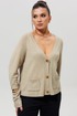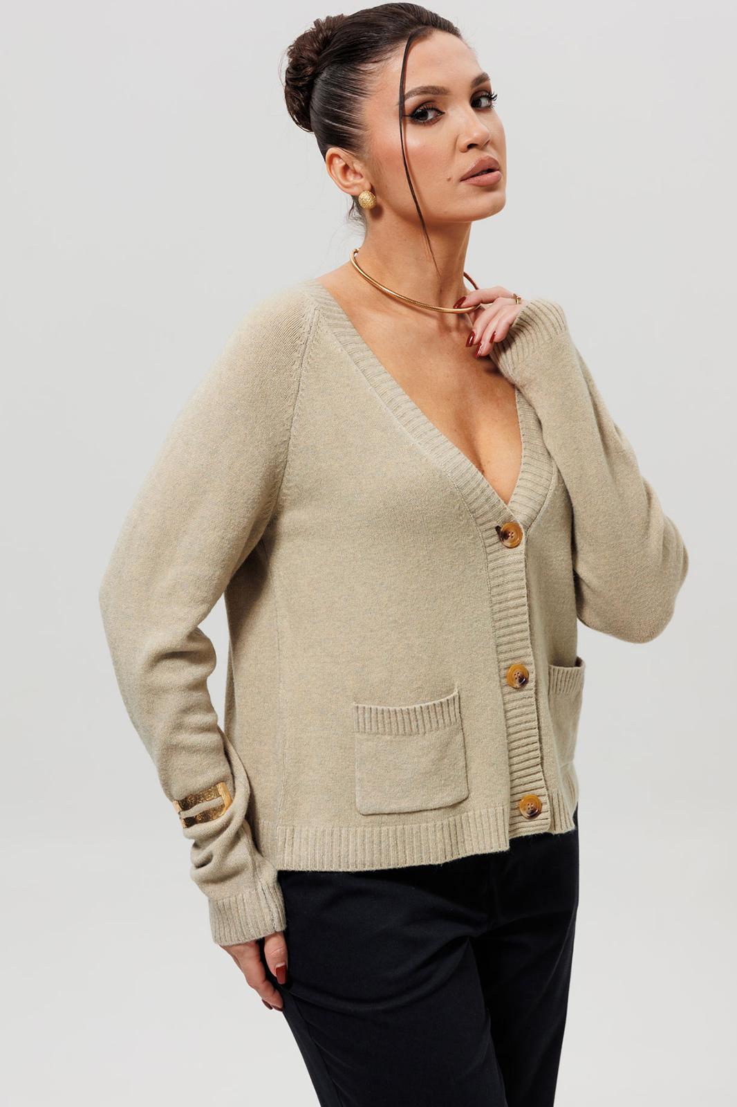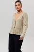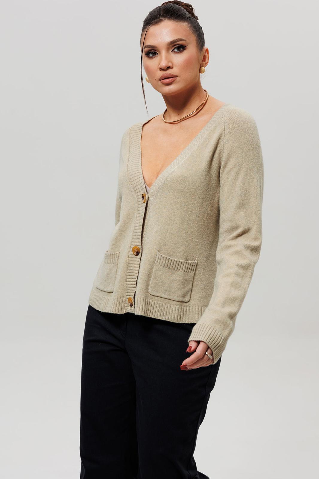 Кардиган дополнен двумя накладными карманами на передней части, что добавляет практичности и стиля. Застежка на пуговицы позволяет регулировать посадку и создавать разнообразные образы.