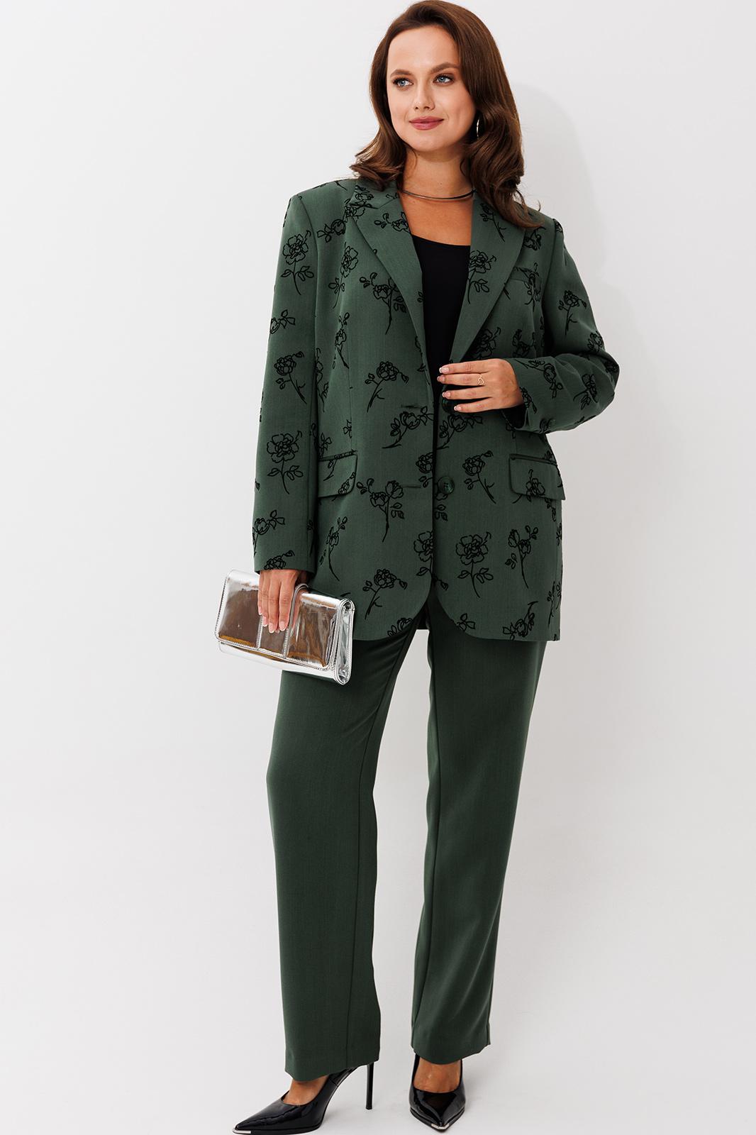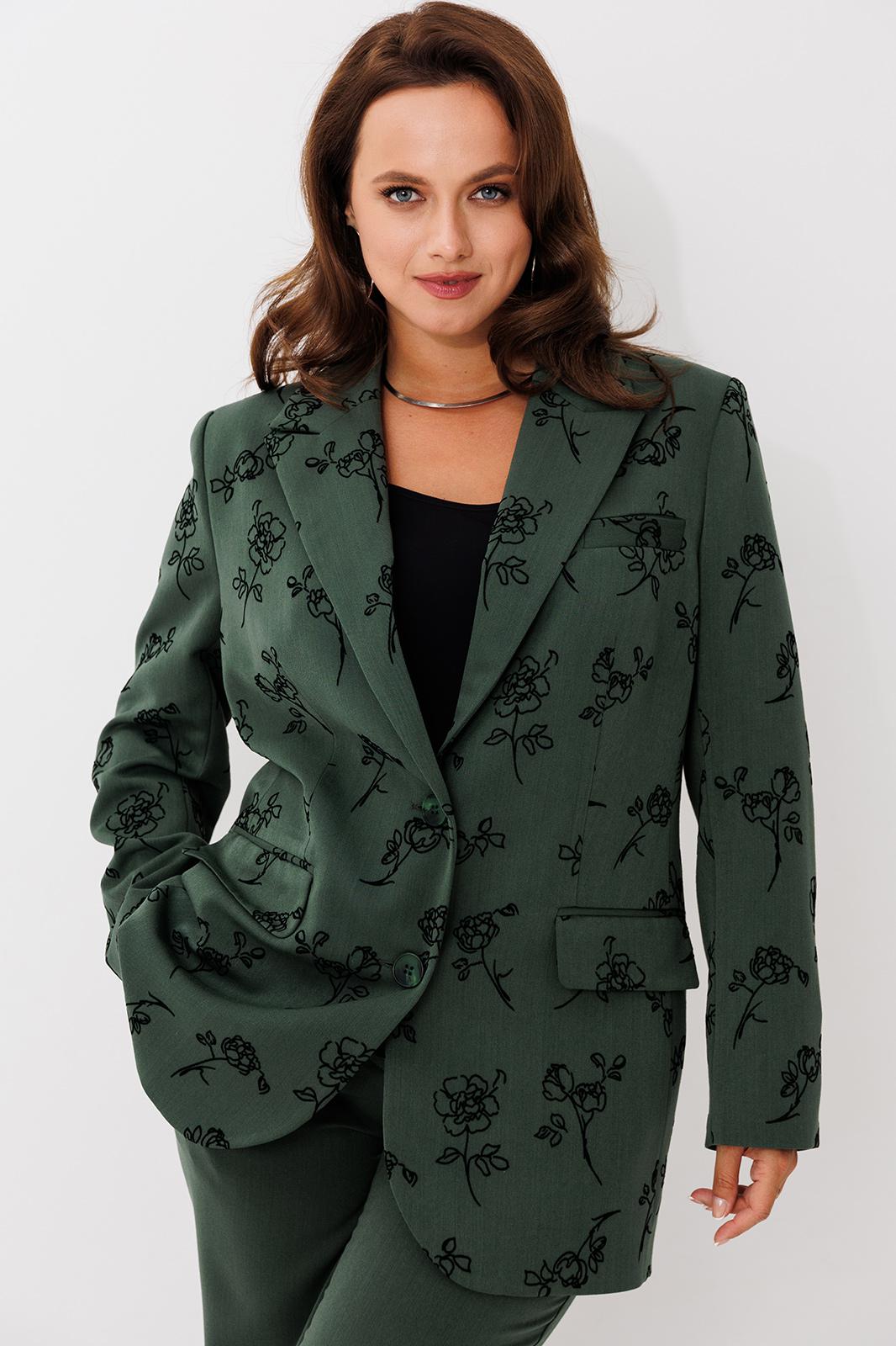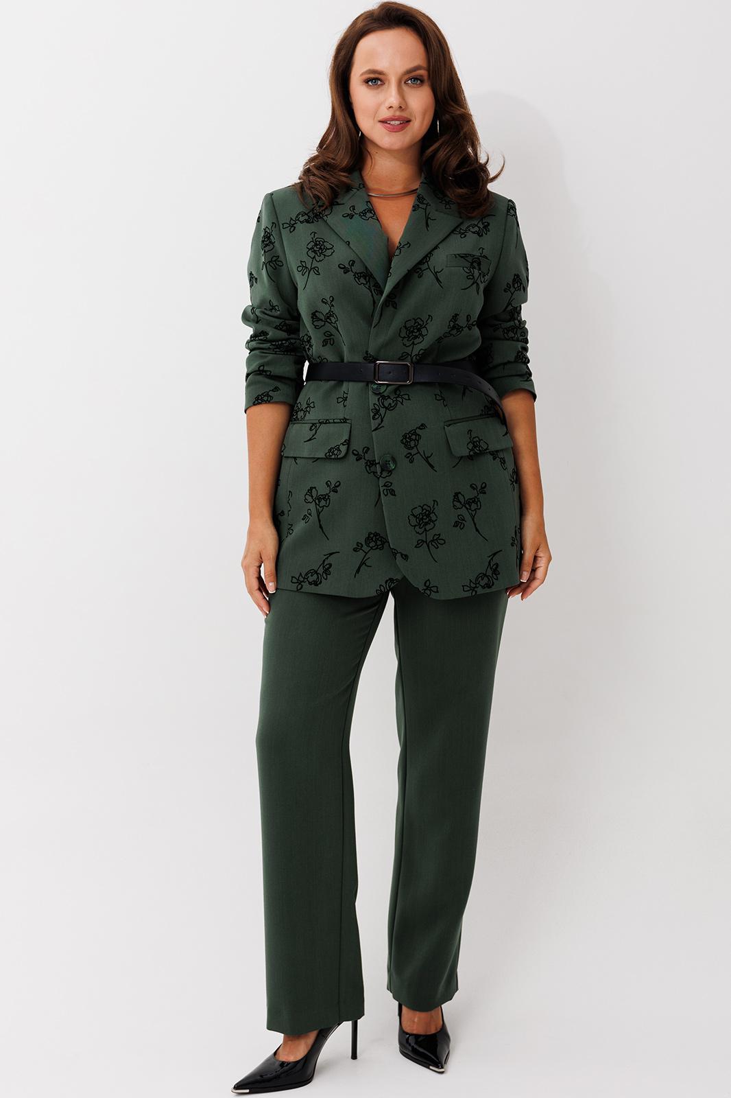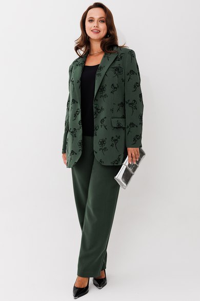 Элегантный женский костюм, состоящий из жакета и прямых брюк, выполнен из костюмной ткани с флоковым напылением — материал стабилизирован, не растягивается и отлично держит форму. Жакет однобортный, на петлях и пуговицах, с английским воротником и клапанами по бокам. Рукав втачной, длина — полная. Посадка свободная, что обеспечивает комфорт и стильный силуэт. Брюки прямого кроя, на частичной резинке по поясу для удобной посадки и идеального прилегания.