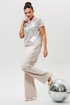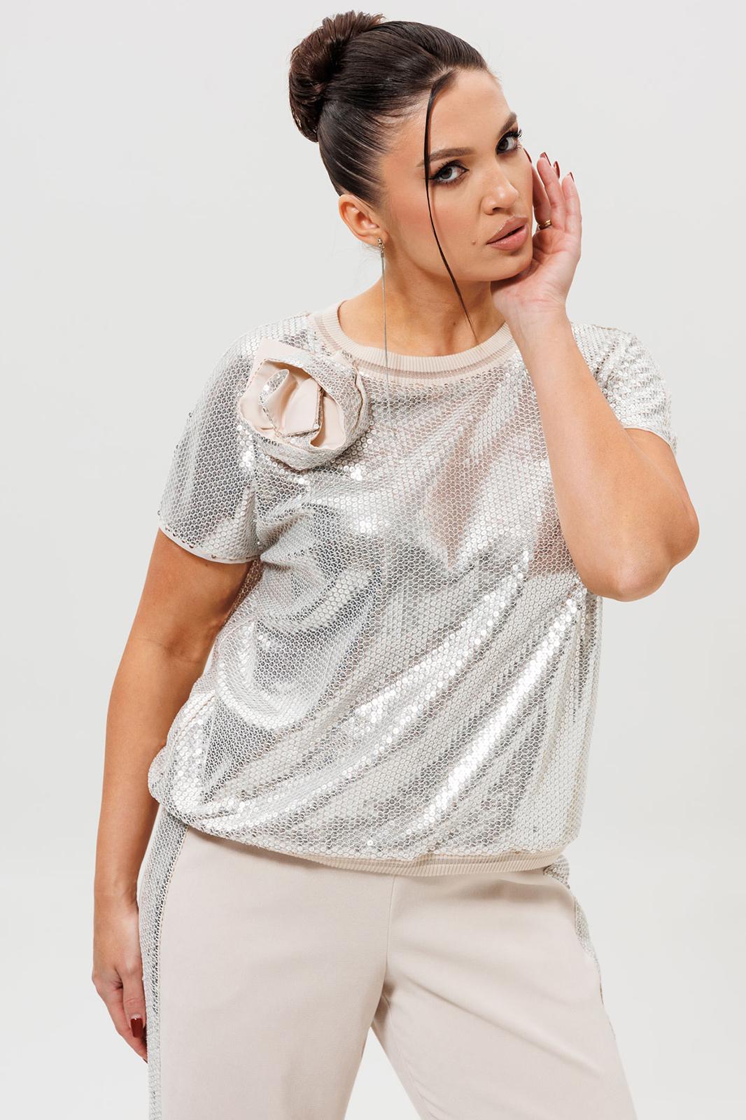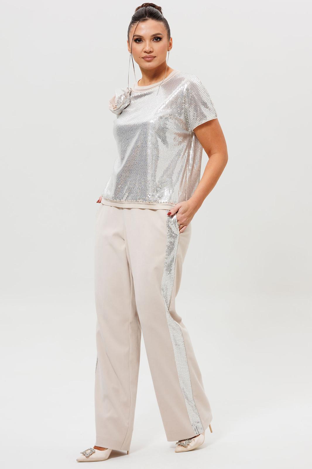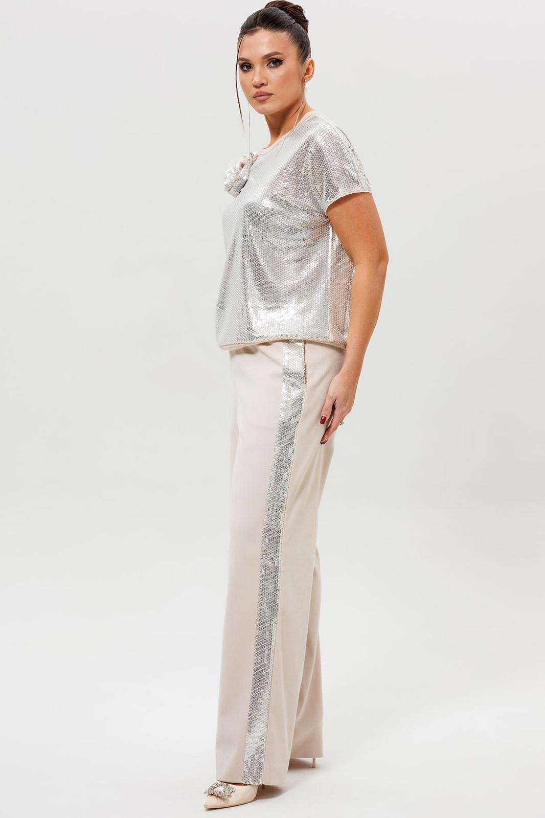 Серебристый костюм состоит из жакета с пайетками и брюк с декоративными лампасами. Этот роскошный серебристый костюм (Арт. 1277) создан для того, чтобы вы сияли на любом торжестве. Комплект включает в себя жакет и элегантные брюки с декоративными лампасами, которые зрительно вытягивают силуэт и добавляют образу строгости и шика. Особый шарм костюму придает цветок-брошь из той же ткани, которая может быть использована как на лацкане жакета, так и в прическе. Костюм с пайетками и лампасами — это готовое решение для новогодней ночи, свадьбы, выпускного вечера или любого события, где ваш образ должен быть безупречным. Размеры 48-54.