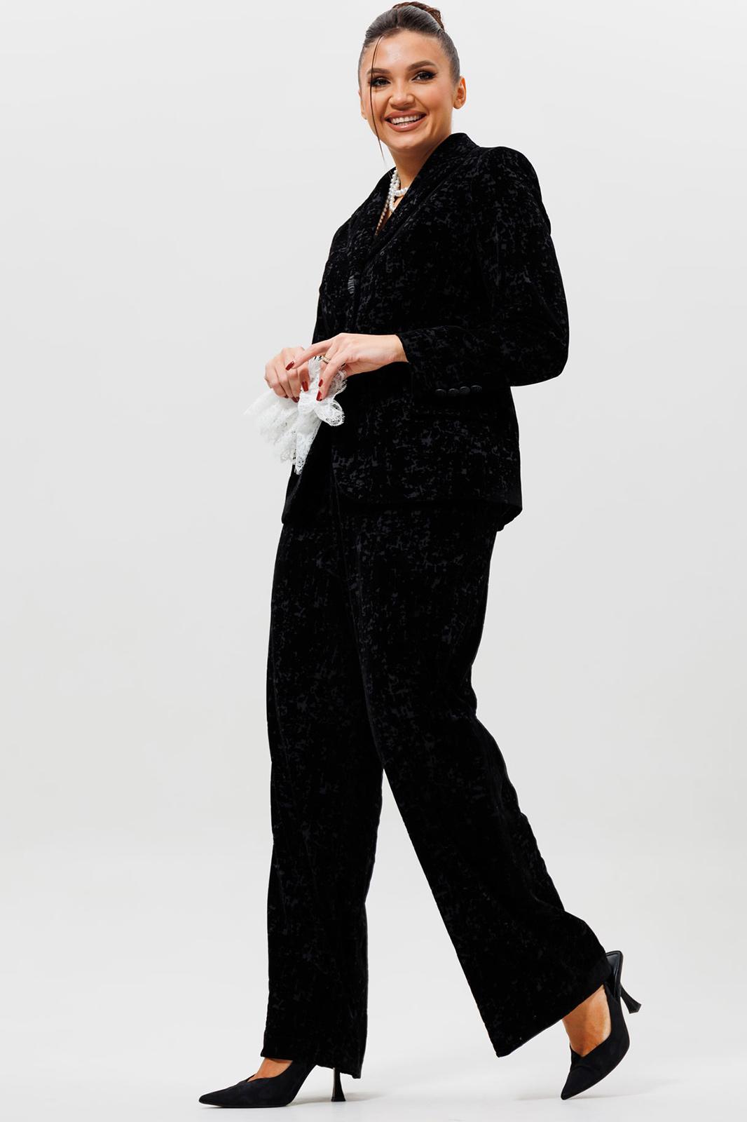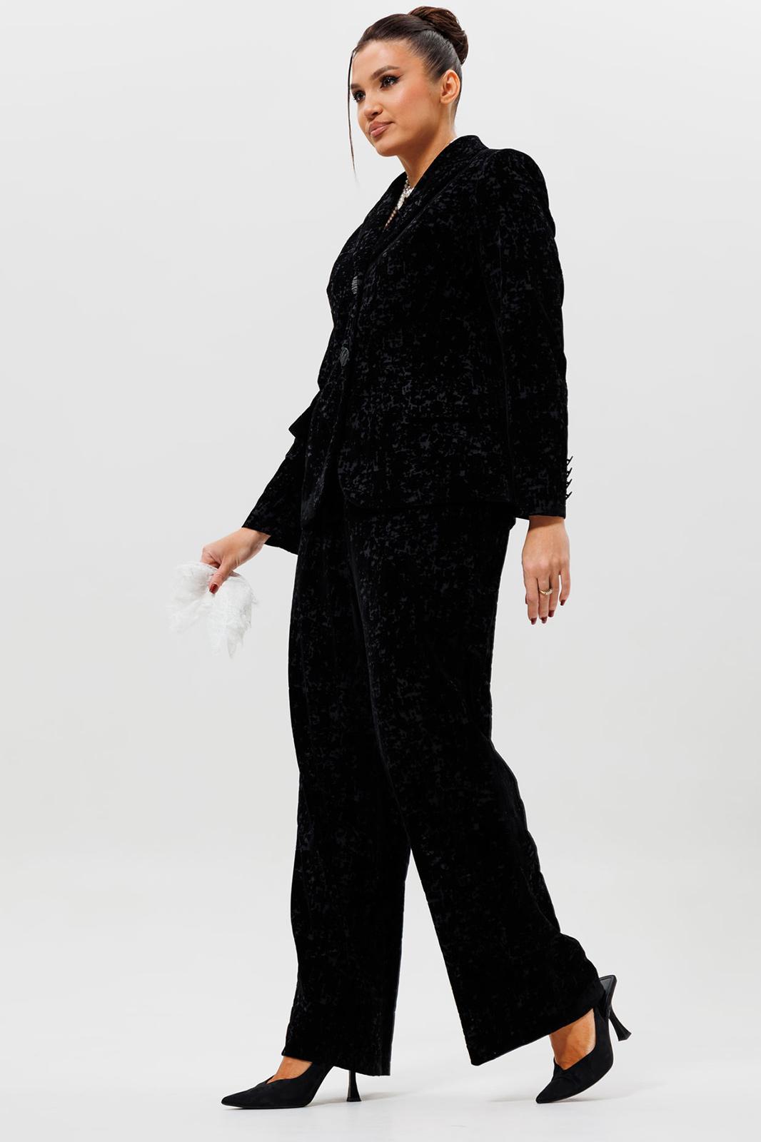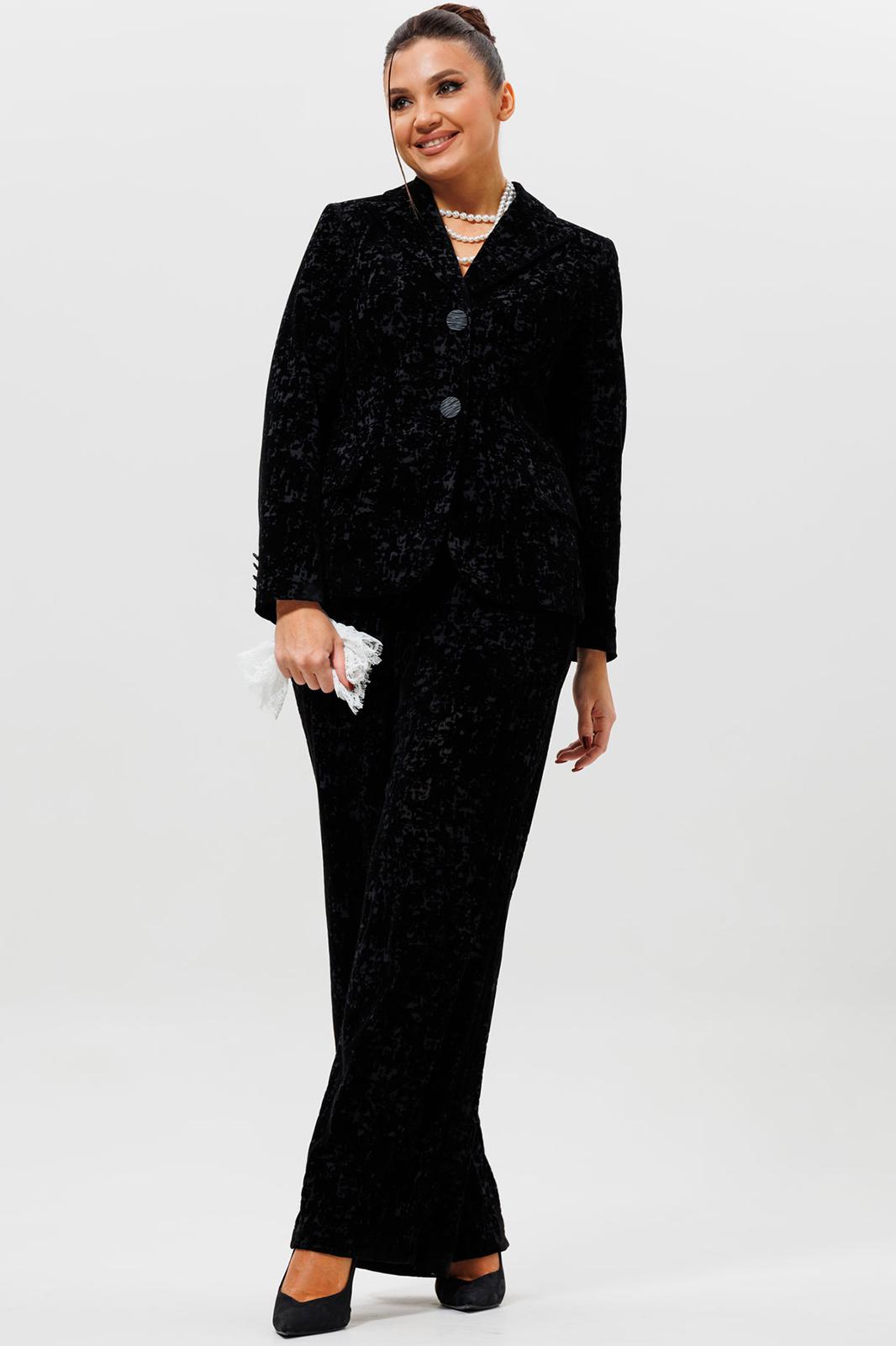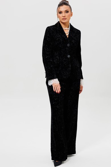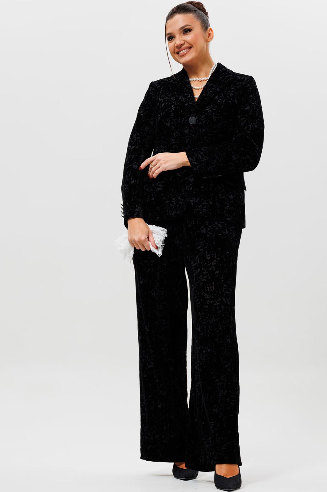Этот черный бархатный костюм (жакет и брюки) — воплощение вечерней элегантности. Комплект из жакета и чуть прямых брюк на подкладке станет основой для безупречного праздничного образа. Жакет с притягивает взгляды и красиво переливается при свете софитов и вечерних огней, делая его идеальным выбором для выхода в ресторан, театр или на новогодний корпоратив. Крой жакета позволяет комбинировать его с брюками и юбками с высокой талией, визуально вытягивая силуэт. Бархатные брюки (на резинке) прямого кроя выгодно оттеняют нарядный верх и обеспечивают комфорт. Такой костюм для праздника можно носить с кружевной или шелковой блузкой, создавая разные стилистические вариации. Этот элегантный костюм подчеркнет ваш безупречный вкус и станет выигрышной инвестицией в гардероб. Модель можно дополнить кружевными манжетами (арт. 1285м).
