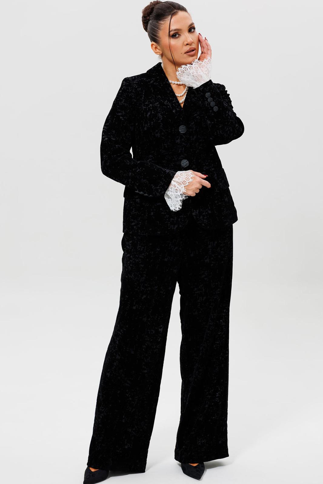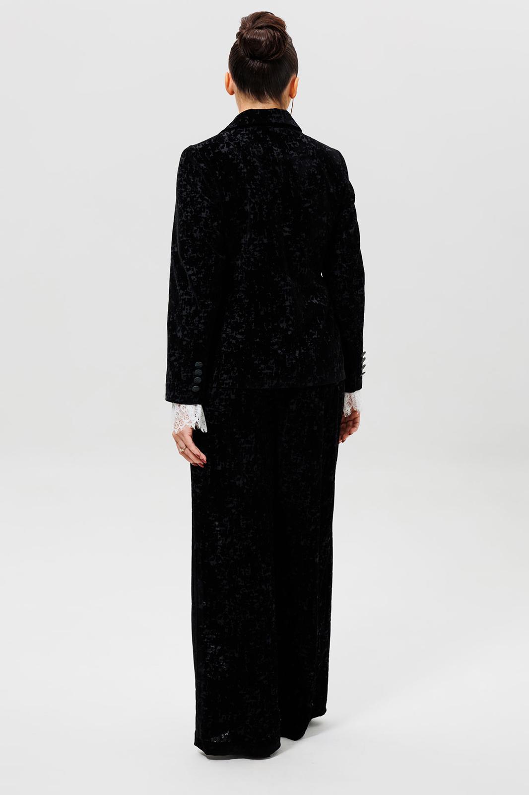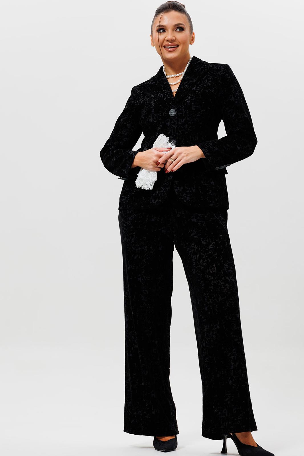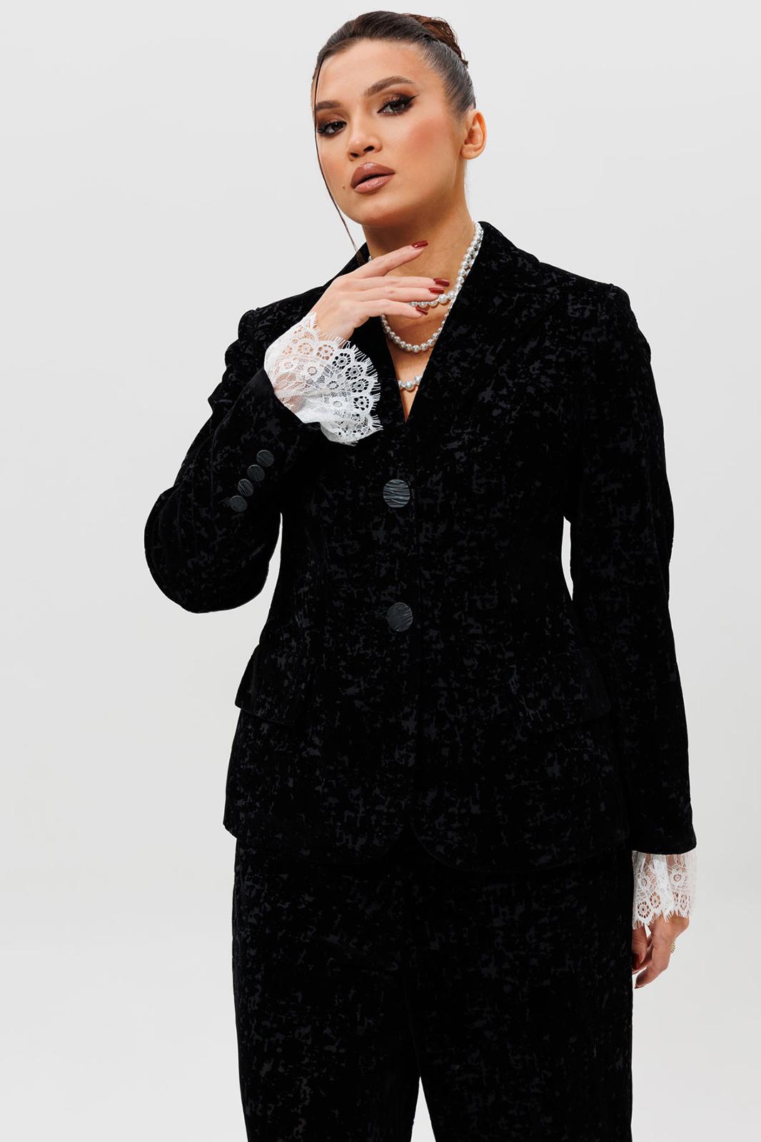 Этот черный бархатный костюм (жакет и брюки) — воплощение вечерней элегантности. Комплект из жакета и чуть прямых брюк на подкладке станет основой для безупречного праздничного образа. Жакет с притягивает взгляды и красиво переливается при свете софитов и вечерних огней, делая его идеальным выбором для выхода в ресторан, театр или на новогодний корпоратив. Крой жакета позволяет комбинировать его с брюками и юбками с высокой талией, визуально вытягивая силуэт. Бархатные брюки (на резинке) прямого кроя выгодно оттеняют нарядный верх и обеспечивают комфорт. Такой костюм для праздника можно носить с кружевной или шелковой блузкой, создавая разные стилистические вариации. Этот элегантный костюм подчеркнет ваш безупречный вкус и станет выигрышной инвестицией в гардероб. Модель можно дополнить кружевными манжетами (арт. 1285м).