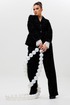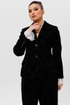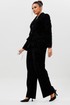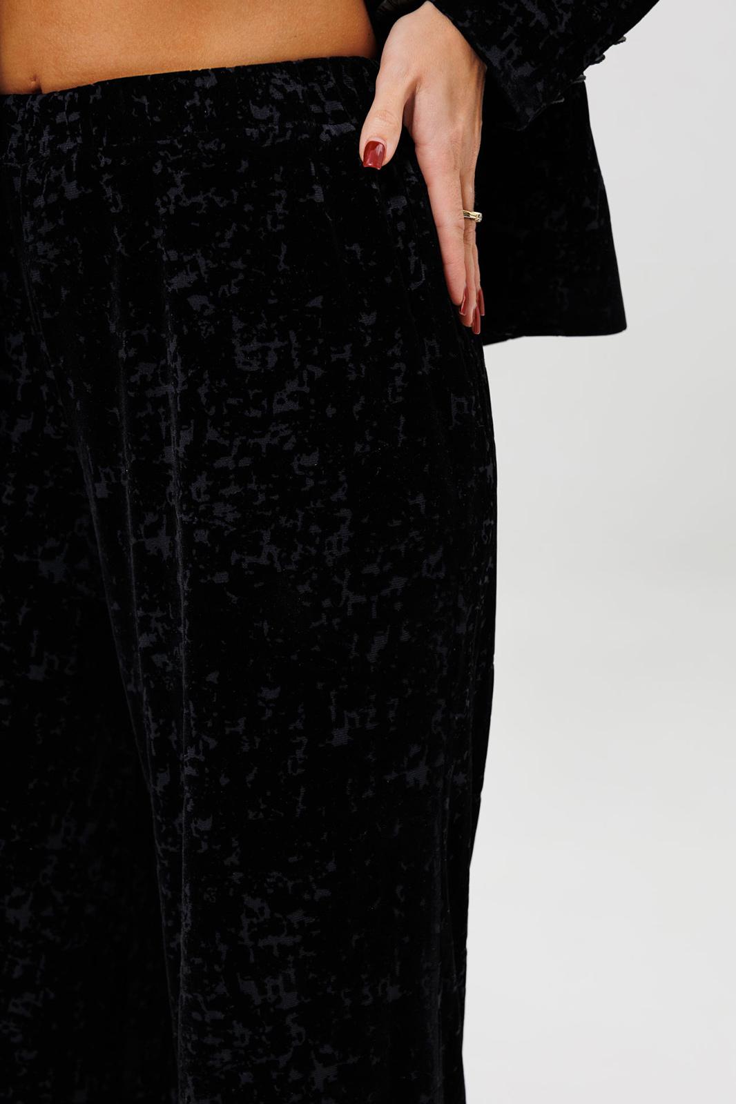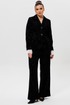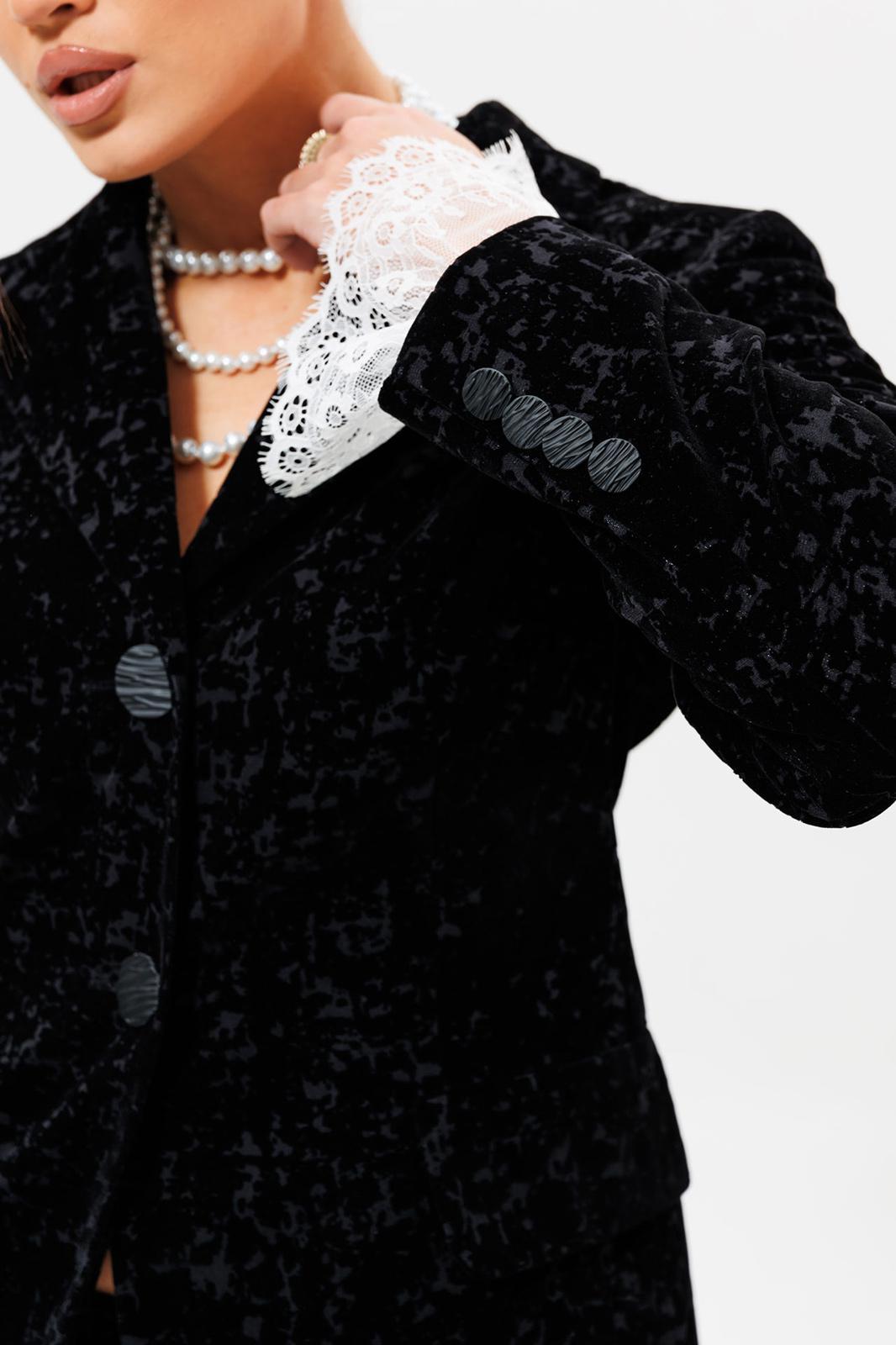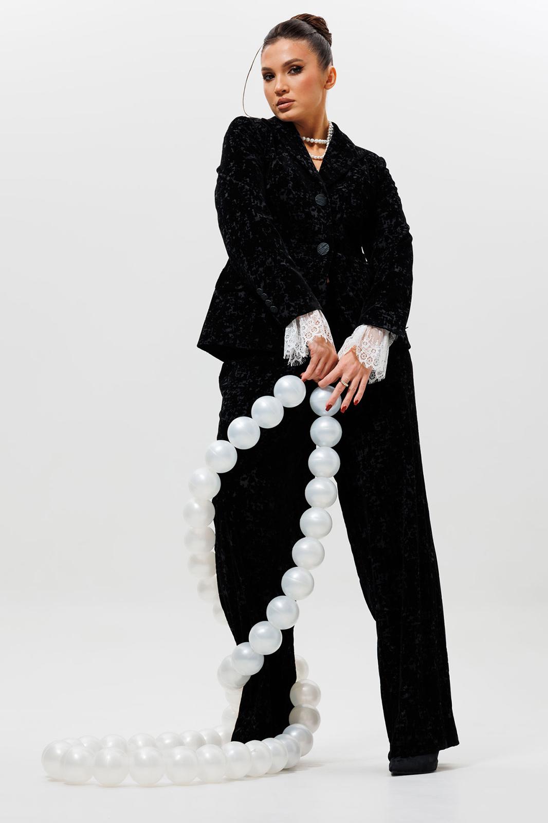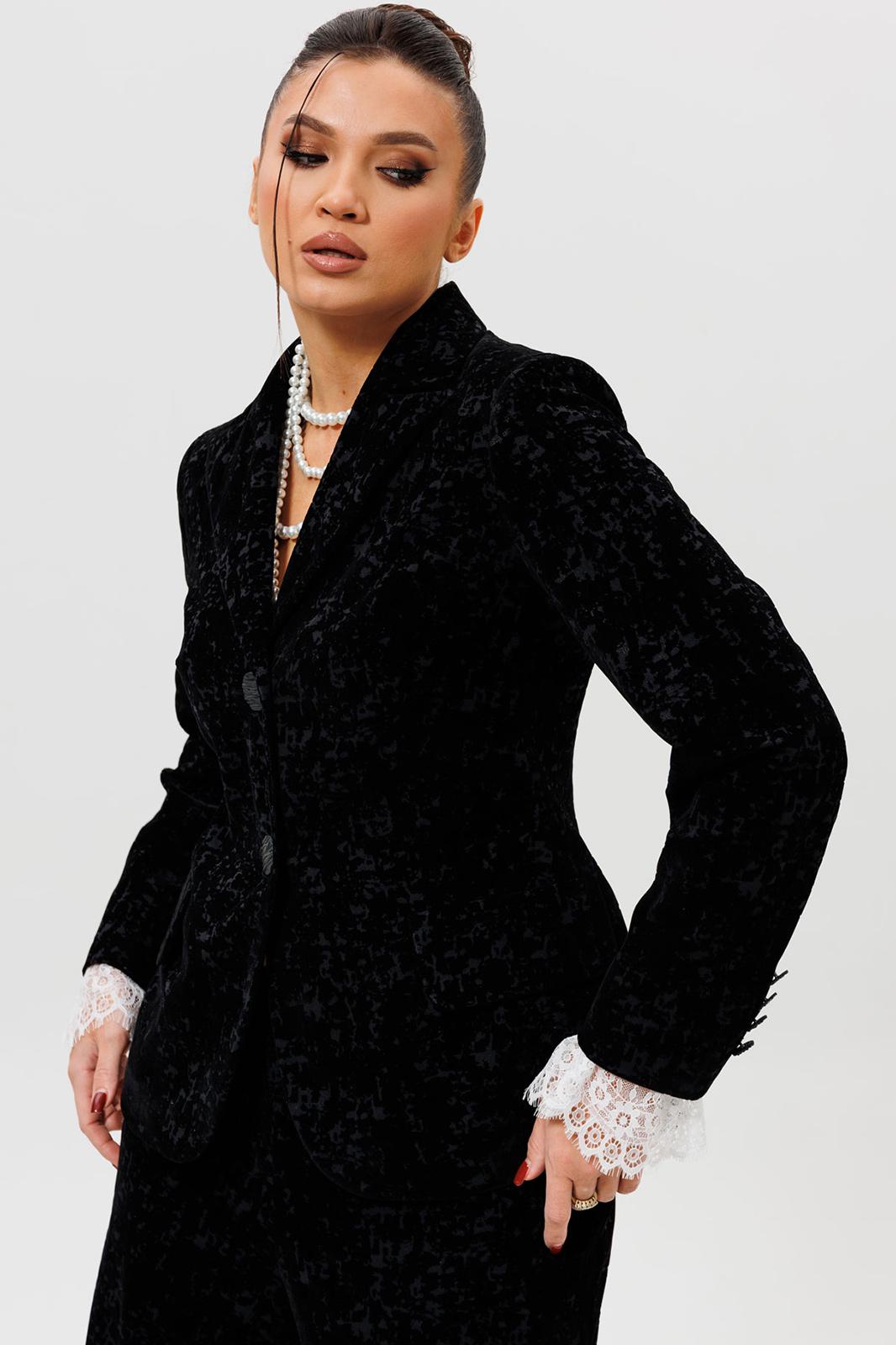 Этот черный бархатный костюм (жакет и брюки) — воплощение вечерней элегантности. Комплект из жакета и чуть прямых брюк на подкладке станет основой для безупречного праздничного образа. Жакет с притягивает взгляды и красиво переливается при свете софитов и вечерних огней, делая его идеальным выбором для выхода в ресторан, театр или на новогодний корпоратив. Крой жакета позволяет комбинировать его с брюками и юбками с высокой талией, визуально вытягивая силуэт. Бархатные брюки (на резинке) прямого кроя выгодно оттеняют нарядный верх и обеспечивают комфорт. Такой костюм для праздника можно носить с кружевной или шелковой блузкой, создавая разные стилистические вариации. Этот элегантный костюм подчеркнет ваш безупречный вкус и станет выигрышной инвестицией в гардероб. Модель можно дополнить кружевными манжетами (арт. 1285м).