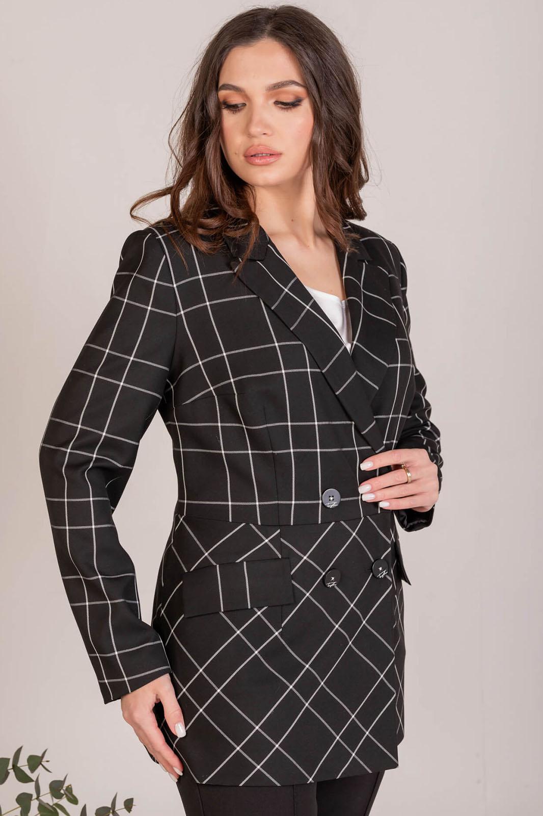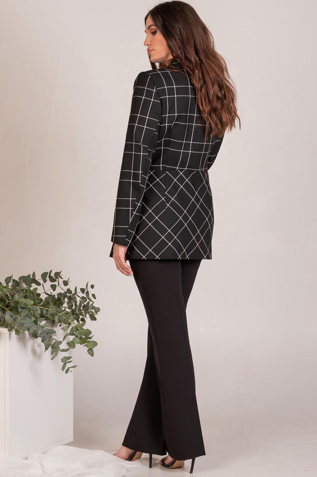 Жакет женский, двубортный, полуприлегающего силуэта, отрезной по линии талии, выполнен из поливискозной костюмной ткани в клетку. По переду нагрудные и талевые вытачки, прорезные карманы с листочкой и клапанами, застёжка на две прорезные петли и пуговицы. Спинка с талевыми вытачками. Воротник отложной с лацканами классической формы. Рукава двух шовные втачные. Жакет на подкладке.
