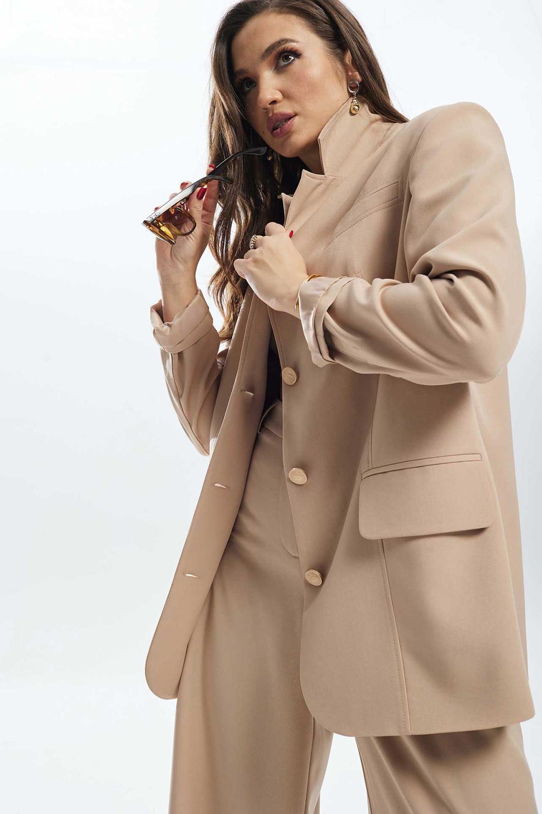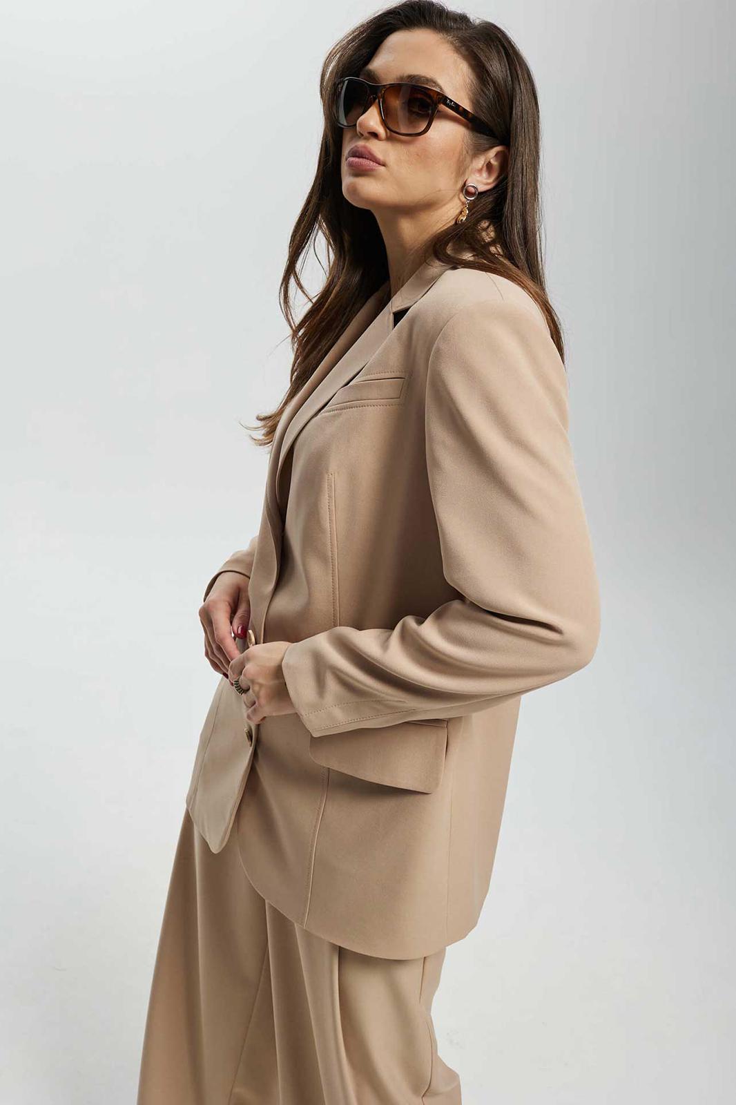 Жакет полуприлегающего силуэта удлинённый, с центральной застёжкой на три прорезные петли и пуговицы. Перёд жакета с талевыми вытачками, прорезными карманами в рамку с клапанами, декоративной листочкой. Лацканы классической формы. По спинке притачная вертикальная планка и плечевые вытачки. Рукава втачные двух шовные. Жакет на подкладке. Украшением служат отделочные строчки.