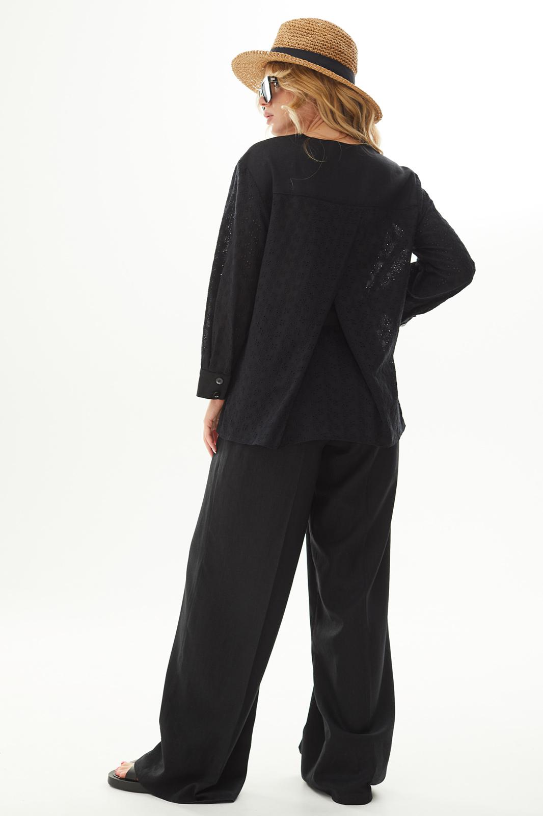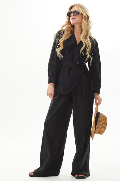 Костюм женский полуприлегающего силуэта состоит из жакета и брюк. Жакет комбинированный из двух различных по фактуре тканей, двубортной застёжкой на две прорезные петли и пуговицы. Перёд с талевыми вытачками, кокеткой, настроченными деталями в виде накладных карманов, листочек, пат. По спинке кокетка, глубокая складка. Рукава одношовные втачные на манжете с застёжкой на две прорезные петли и пуговицы. Брюки женские свободного силуэта с высокой посадкой, максимальным расширением от бедра (палаццо), с боковыми карманами и поясом, в который продета тесьма резинка.