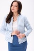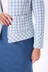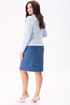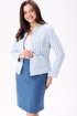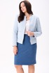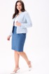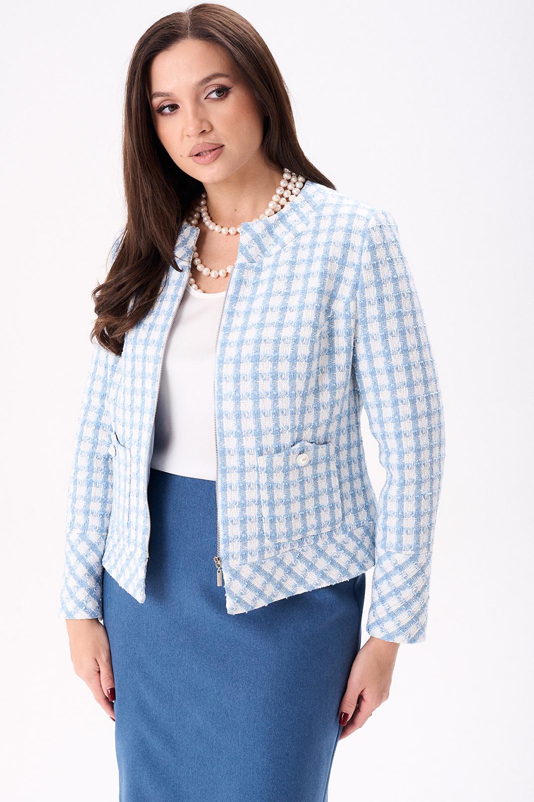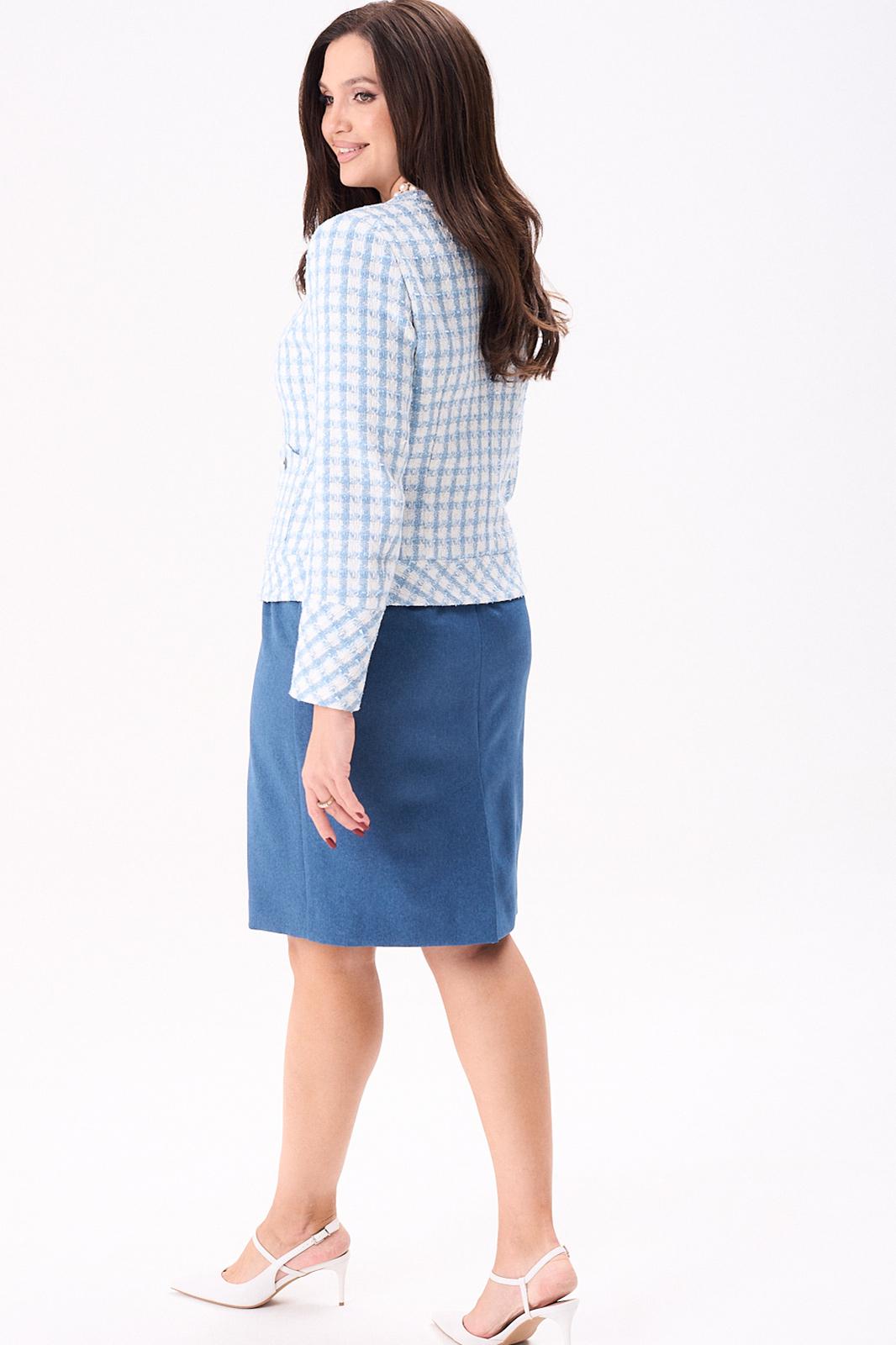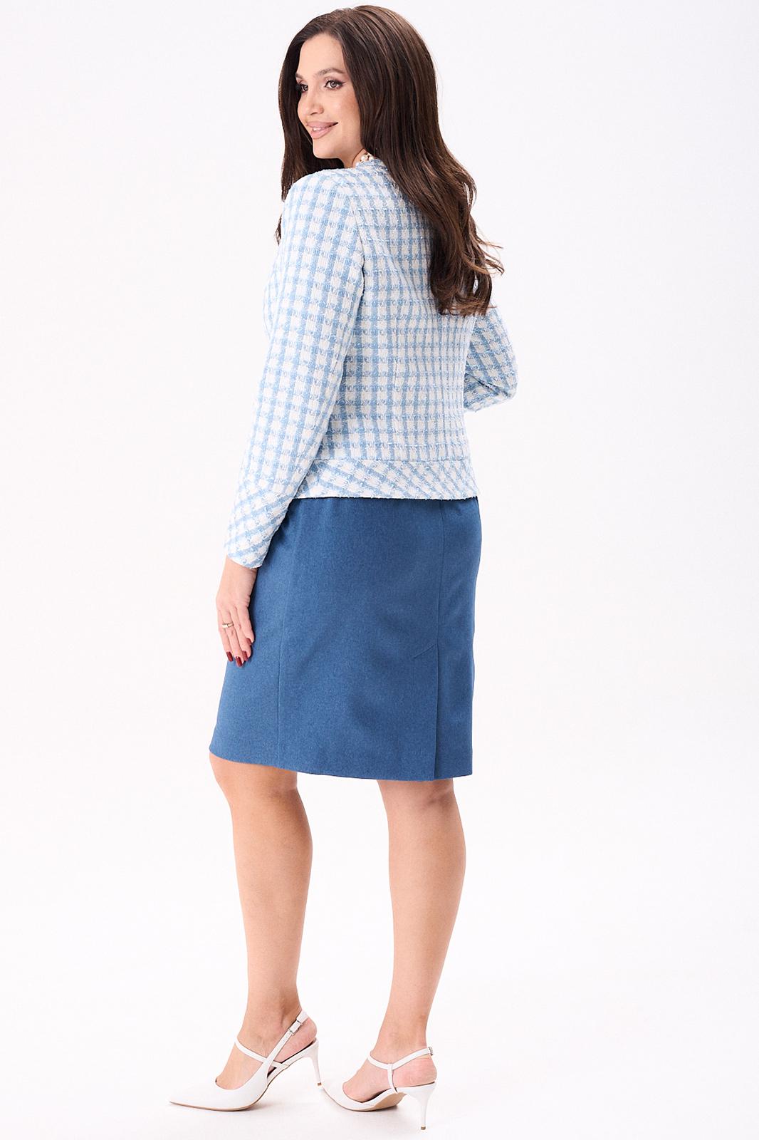 Костюм женский полуприлегающего силуэта состоит из жакета и юбки. Жакет на подкладке. По переду нагрудные вытачки, накладные фигурные карманы, застёжка на тесьму молния. Спинка с талевыми вытачками и центральным швом. По горловине и низу жакета притачная планка. Горловина круглая. Рукава двухшовные втачные на широкой манжете. Юбка, слегка зауженная к низу, без пояса, на обтачке. По переду талевые вытачки. По спинке талевые вытачки. Застёжка потайная тесьма молния расположена в центральном шве спинки. Юбка на подкладке.