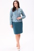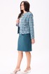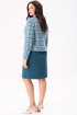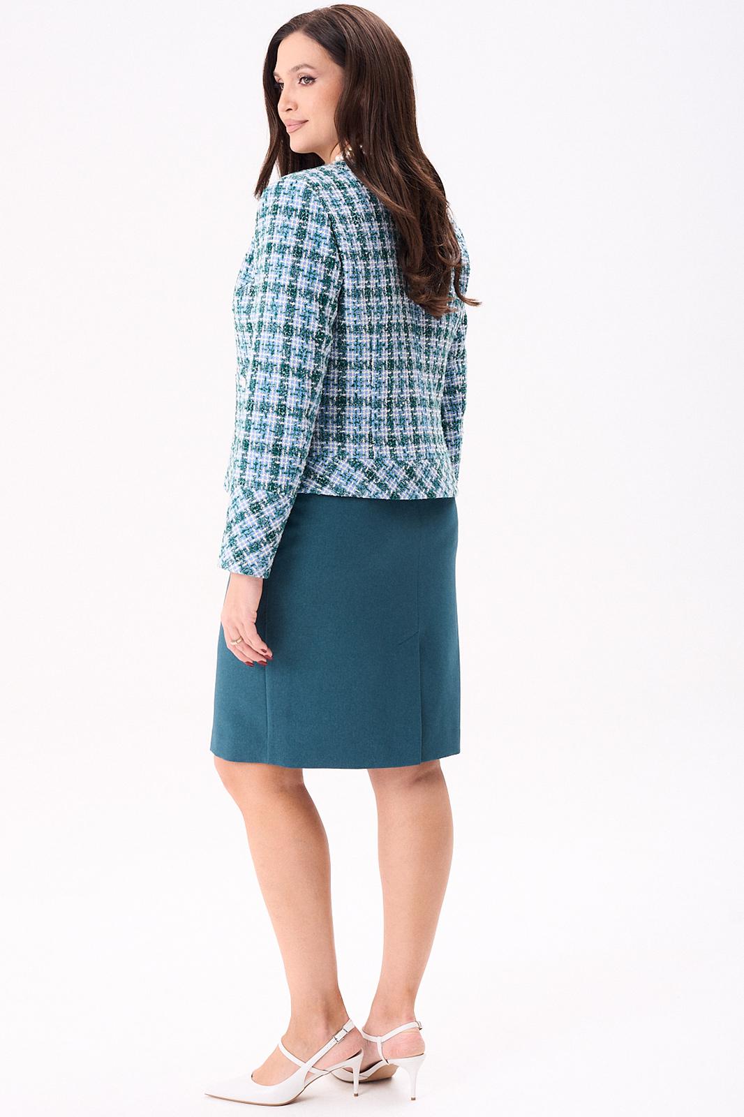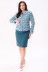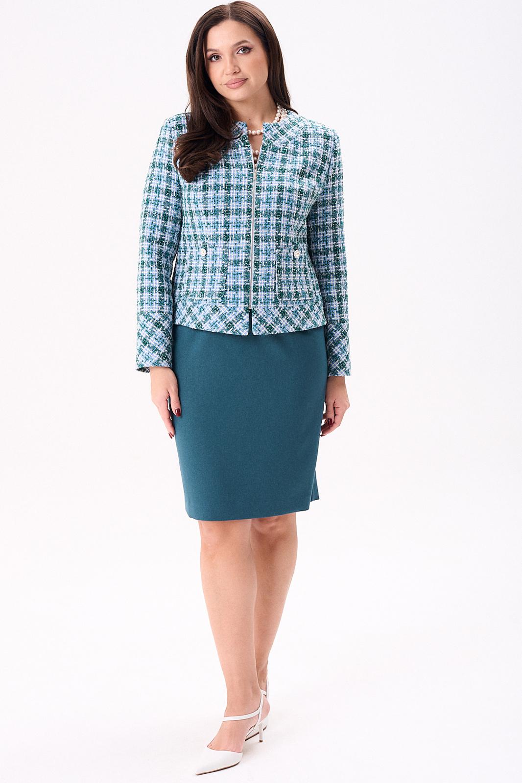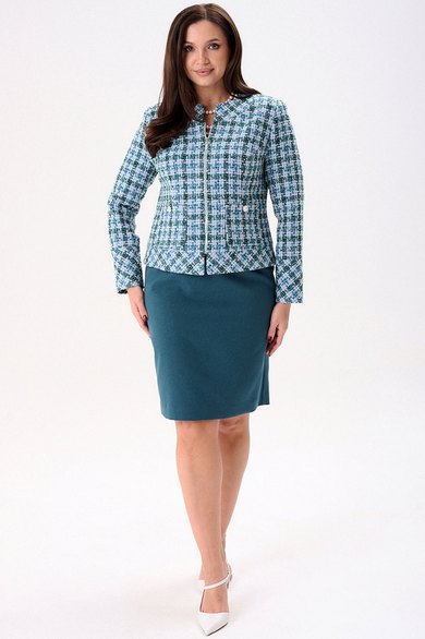Костюм женский полуприлегающего силуэта состоит из жакета и юбки. Жакет на подкладке. По переду нагрудные вытачки, накладные фигурные карманы, застёжка на тесьму молния. Спинка с талевыми вытачками и центральным швом. По горловине и низу жакета притачная планка. Горловина круглая. Рукава двухшовные втачные на широкой манжете. Юбка, слегка зауженная к низу, без пояса, на обтачке. По переду талевые вытачки. По спинке талевые вытачки. Застёжка потайная тесьма молния расположена в центральном шве спинки. Юбка на подкладке.