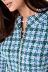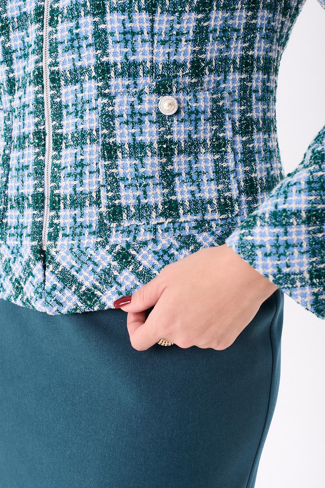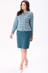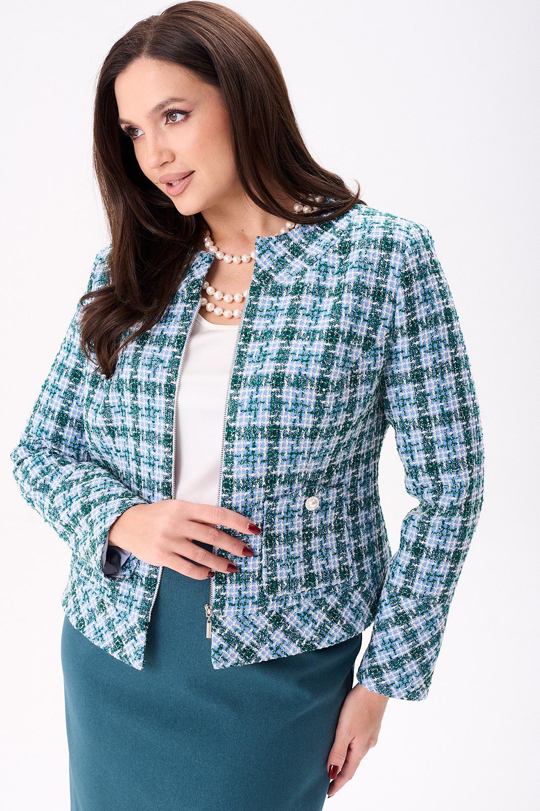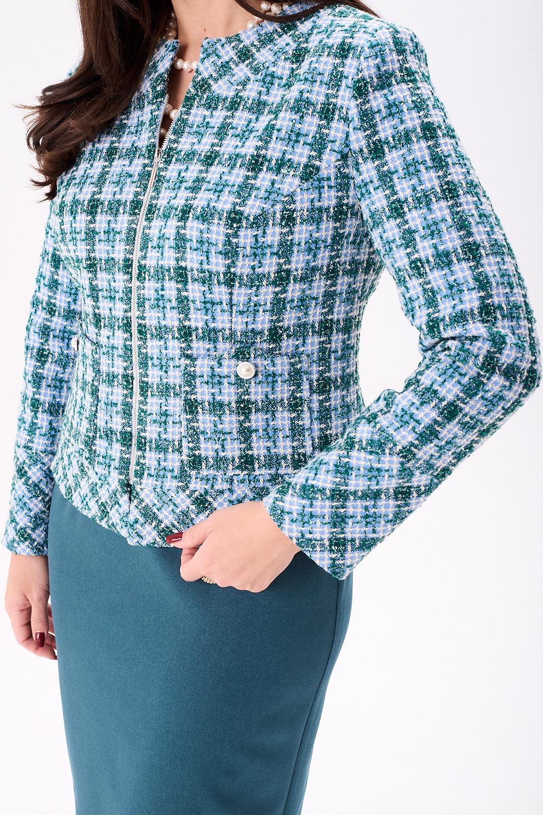 Костюм женский полуприлегающего силуэта состоит из жакета и юбки. Жакет на подкладке. По переду нагрудные вытачки, накладные фигурные карманы, застёжка на тесьму молния. Спинка с талевыми вытачками и центральным швом. По горловине и низу жакета притачная планка. Горловина круглая. Рукава двухшовные втачные на широкой манжете. Юбка, слегка зауженная к низу, без пояса, на обтачке. По переду талевые вытачки. По спинке талевые вытачки. Застёжка потайная тесьма молния расположена в центральном шве спинки. Юбка на подкладке.