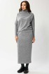 Костюм трикотажный женский состоит из джемпера и юбки на подкладке. Джемпер прямого силуэта со спущенным втачным рукавом. В боковых швах обработаны разрезы. Горловина - цельнокроенная стойка. Юбка миди. Зауженная к низу. Спинка со средним швом, заканчивающимся разрезом. Талия обработана притачным поясом на резинке.