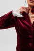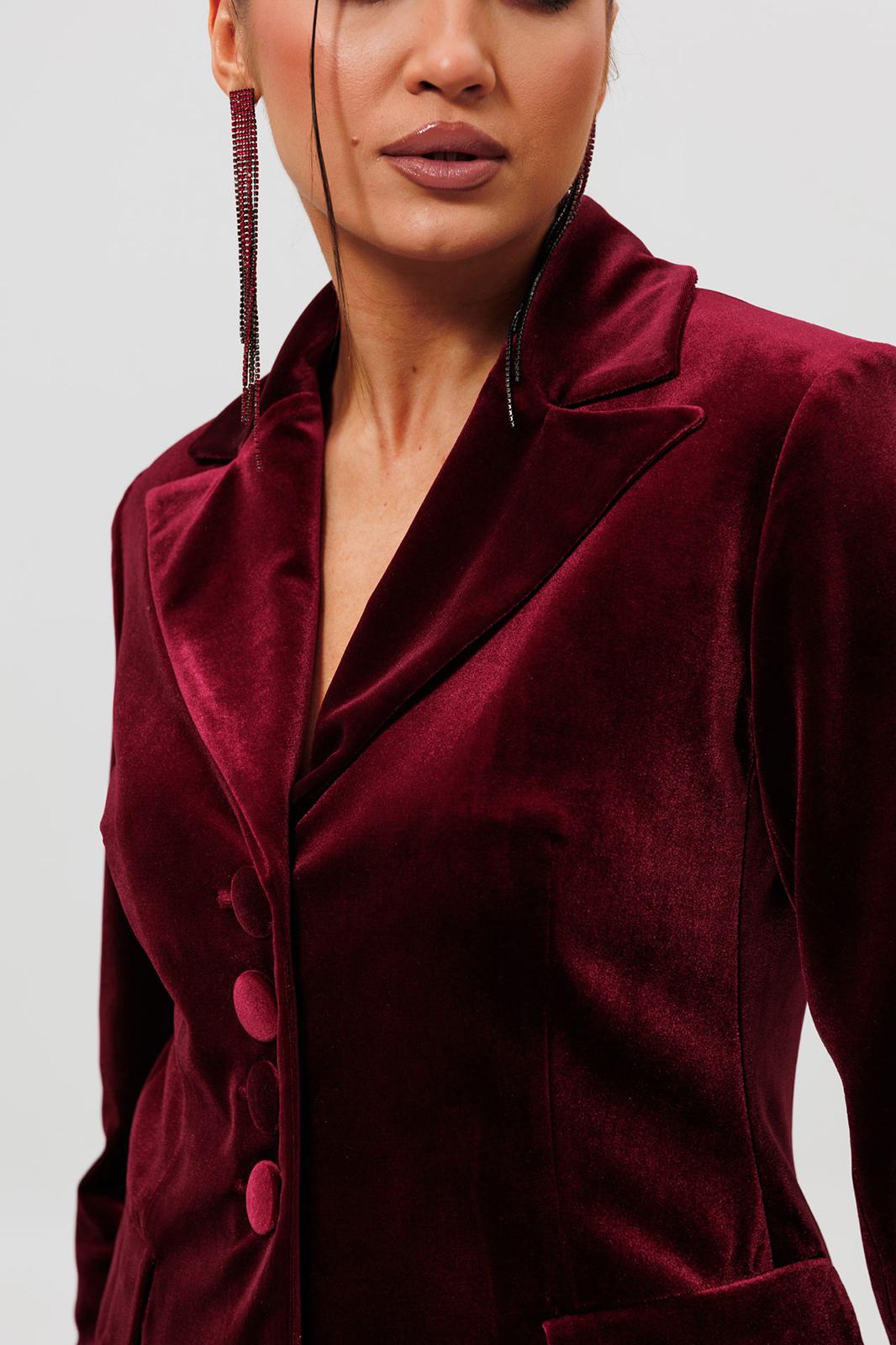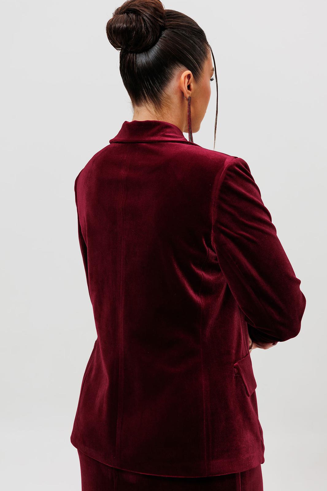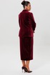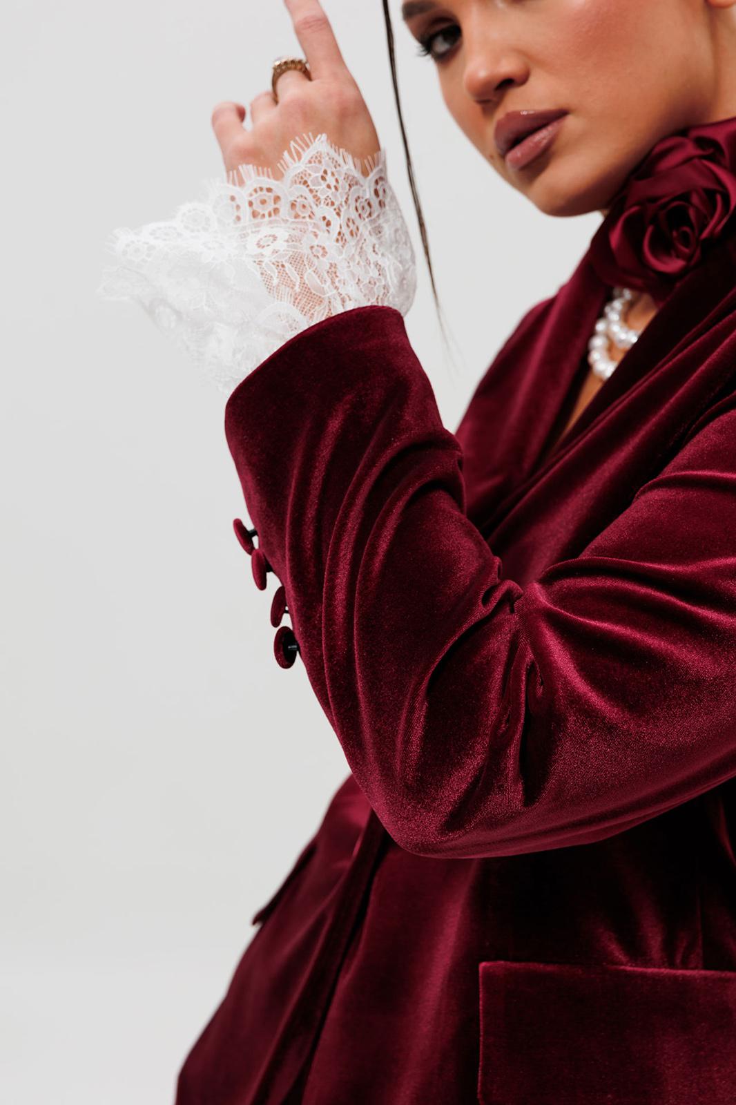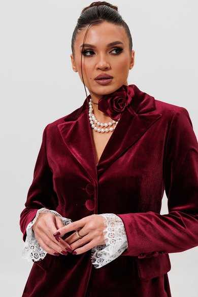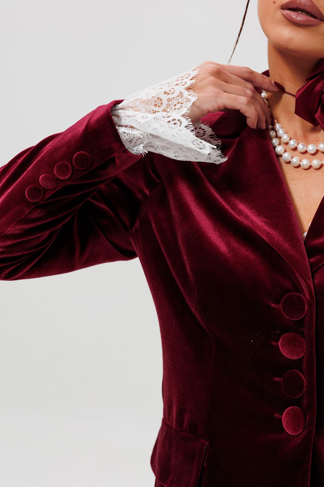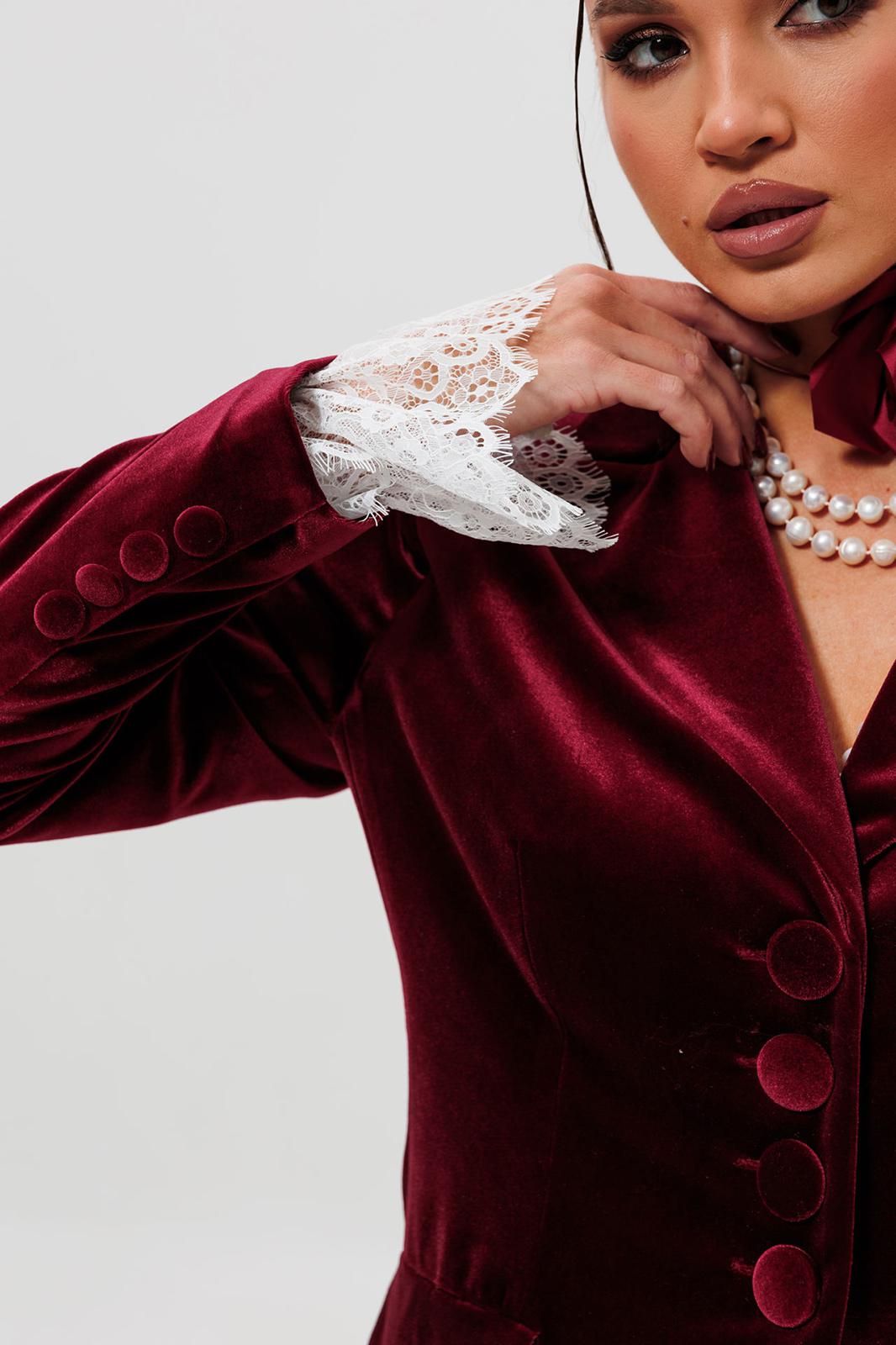 Бордовый костюм (жакет, кружевные манжеты и юбка-карандаш) станет основой вашего делового гардероба. Комплект из полуприлегающего жакета и классической юбки выполнен из качественного бархата, что добавляет образу статусности и стиля. Жакет на подкладке с отложным воротником и декоративными пуговицами легко комбинируется с другими вещами, а юбка-карандаш идеально подчеркивает фигуру, оставаясь комфортной для носки в течение всего дня. Данный костюм бордового цвета — прекрасный выбор для работы, деловых встреч, конференций или любого события, где важны безупречный вкус и элегантность. Дополняют модель кружевные манжеты, которые фиксируются по руке на резинку