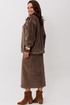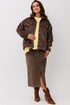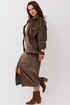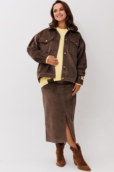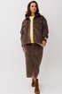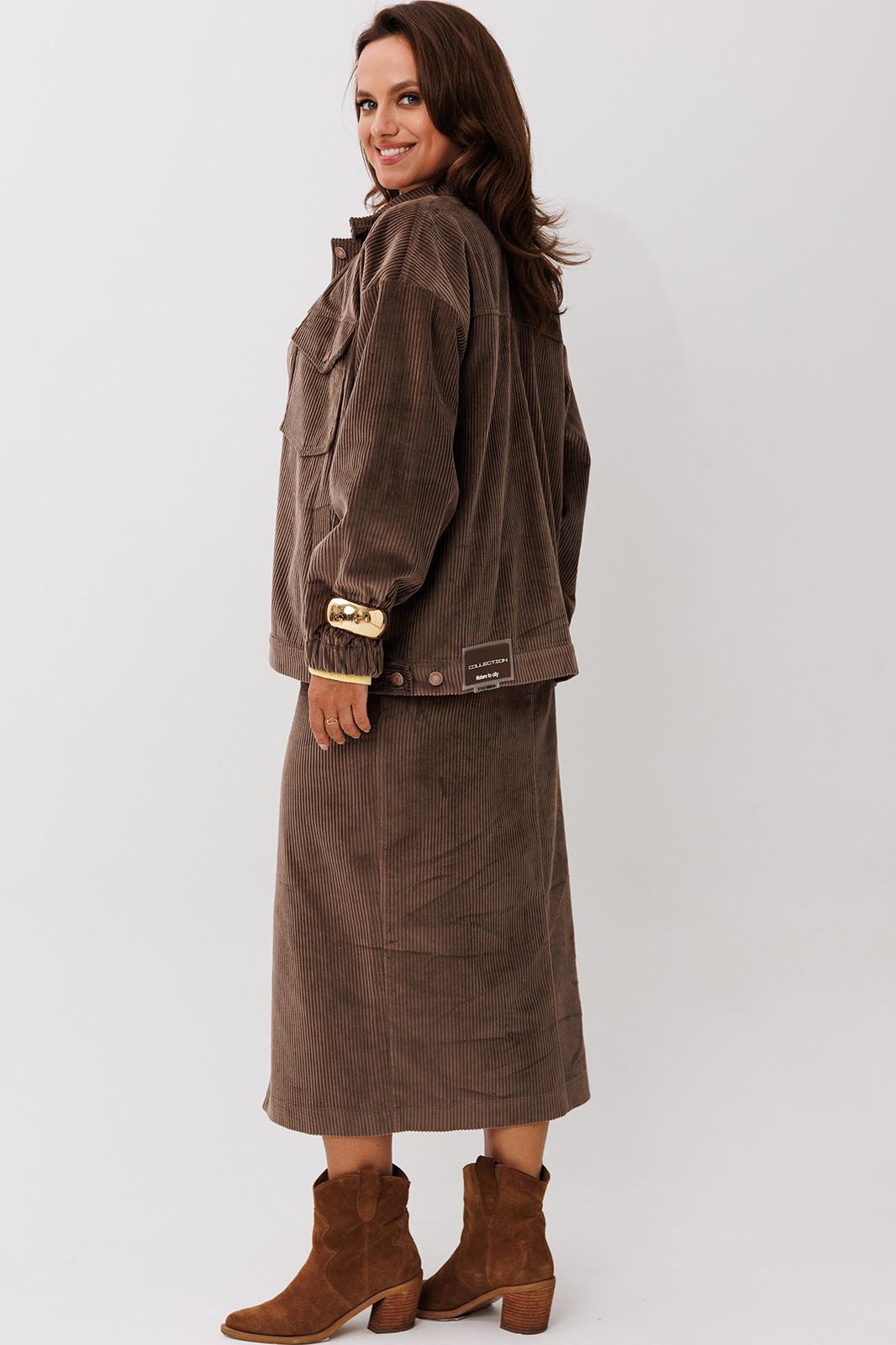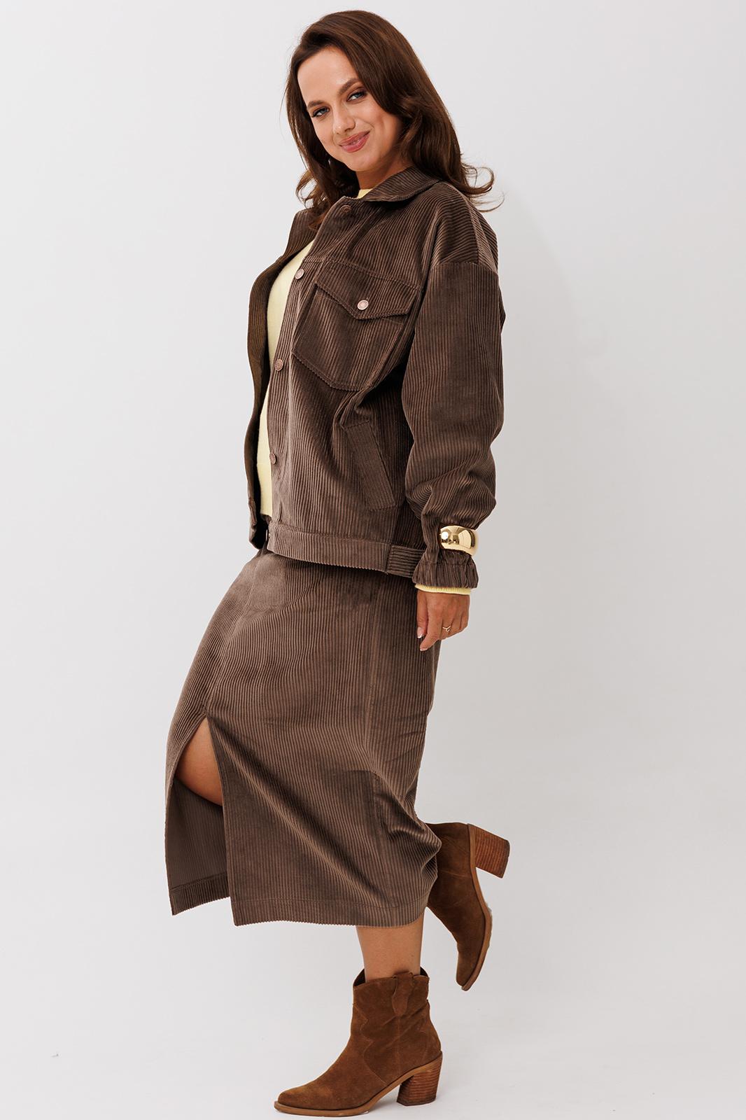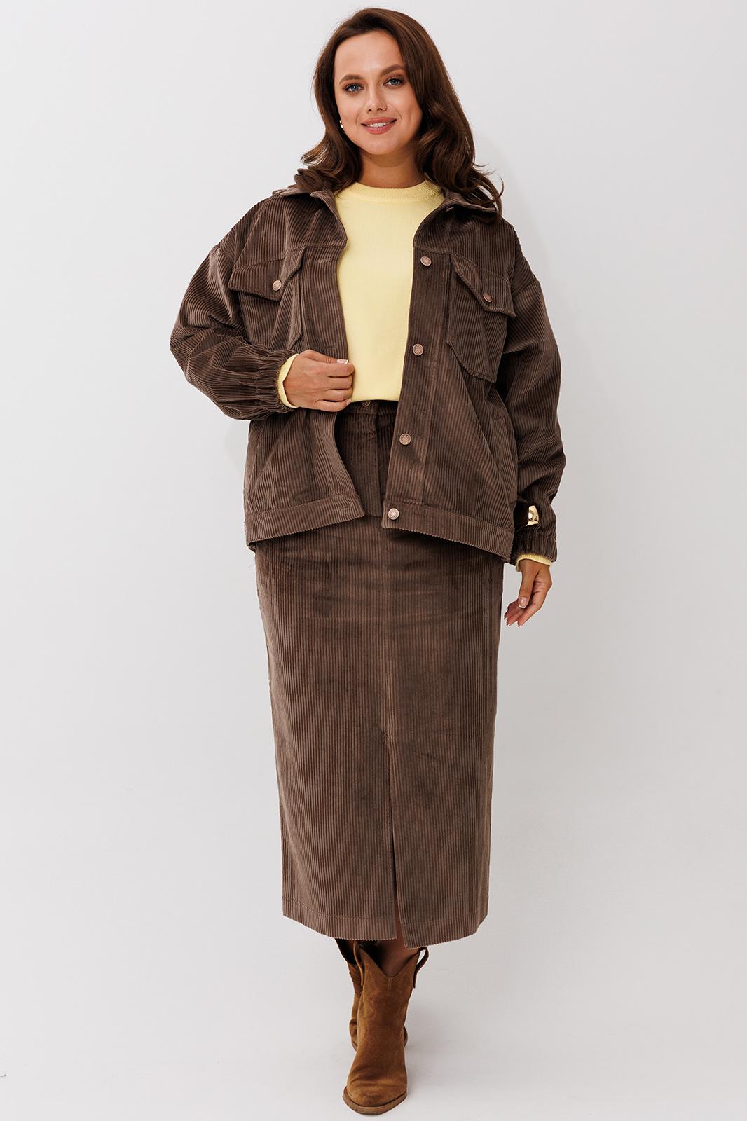 Комплект женский свободного силуэта состоит из бомбера и юбки. Бомбер со спущенными плечами застёгивается на прорезные петли и пуговицы. По переду прорезные карманы с широкой листочкой и накладные карманы с фигурными клапанами на застёжке. Воротник отложной. Рукава одношовные втачные на манжете. Юбка женская слегка зауженная к низу на притачном поясе со шлёвками, который застёгивается на прорезную петлю и пуговицу. По переду застёжка на молнию с гульфиком и откоском и карманы. По спинке центральный шов, заканчивающийся разрезом, кокетка и накладные карманы. Юбка и бомбер без подкладки.
