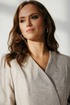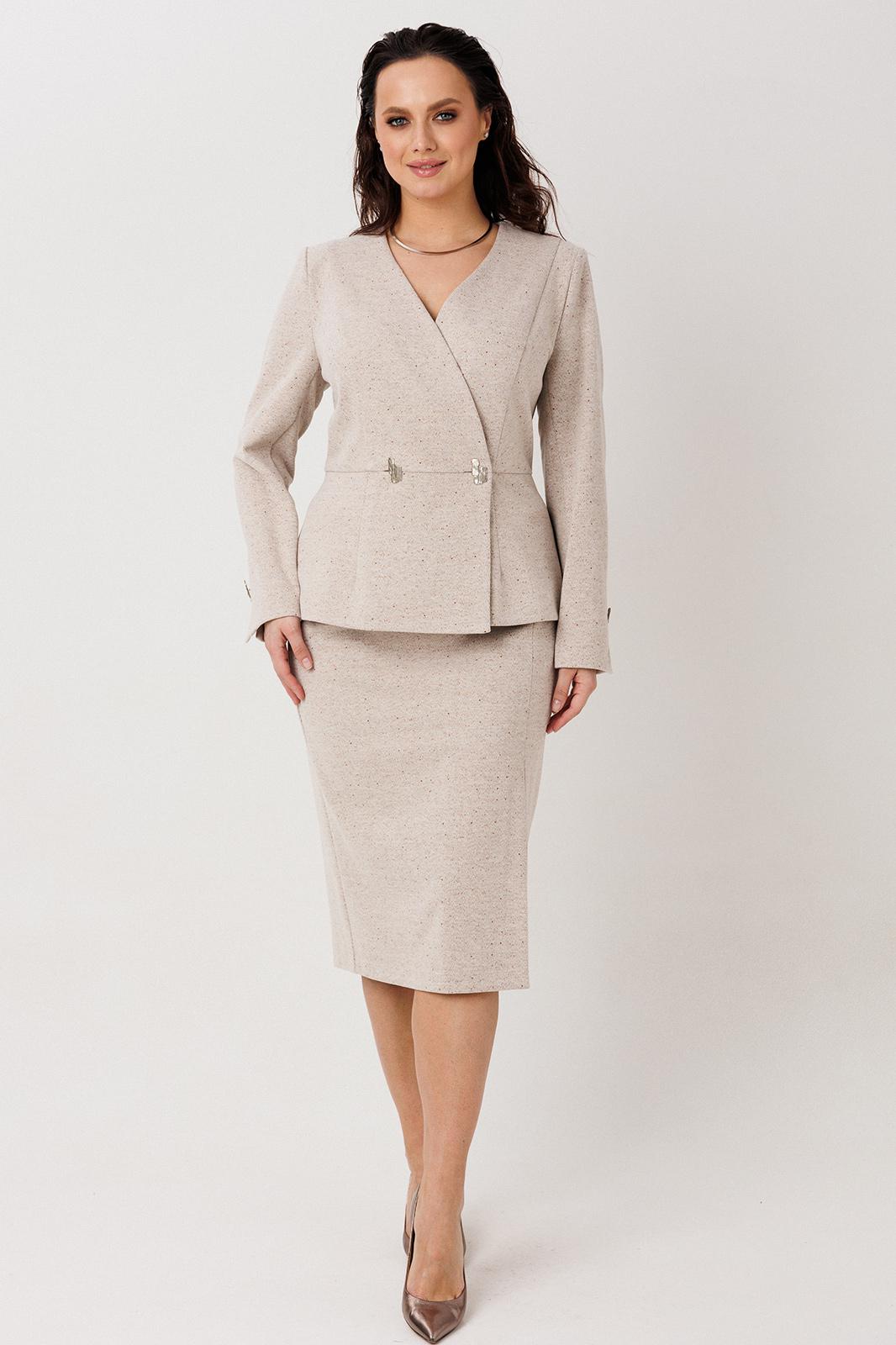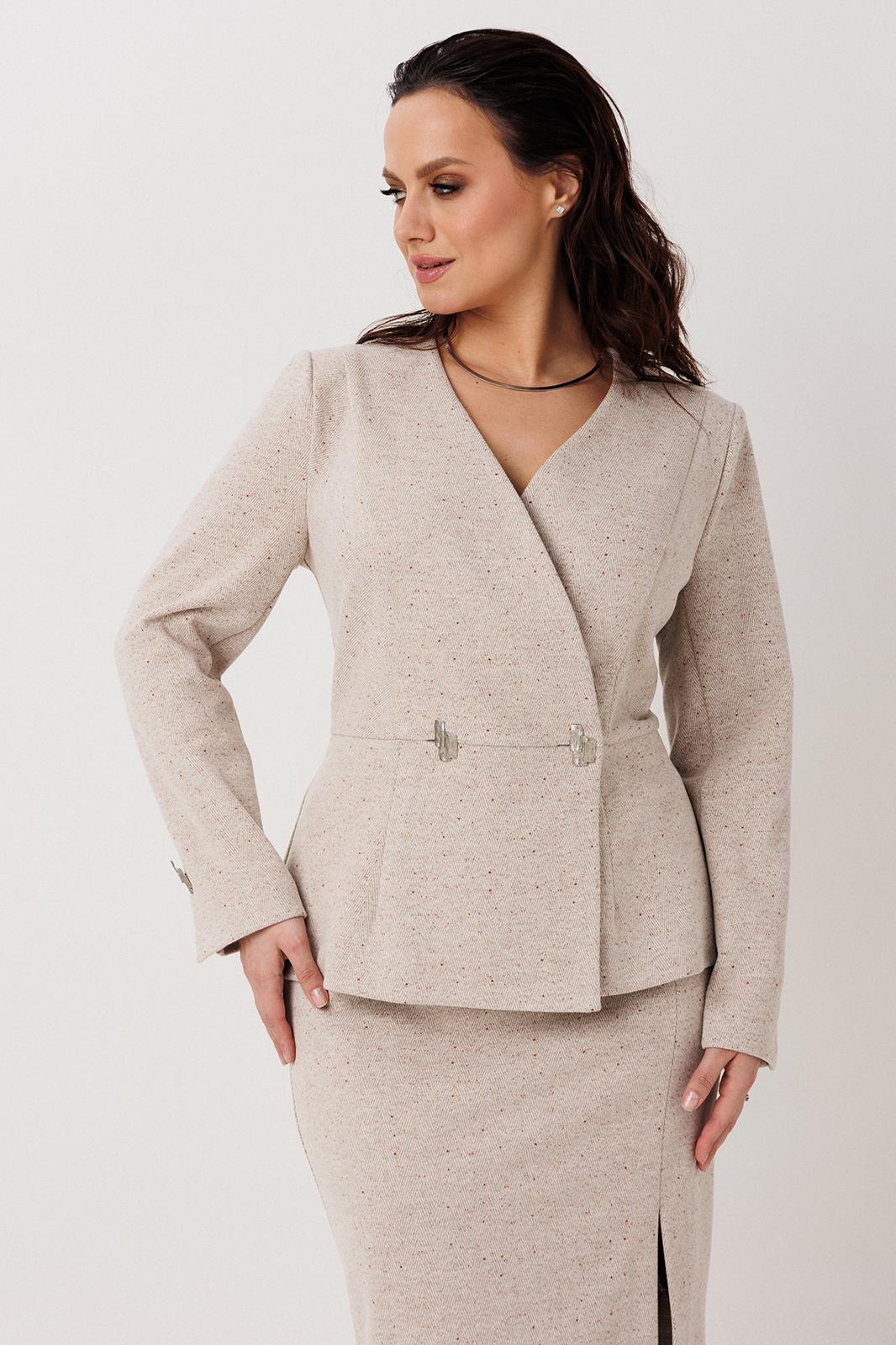 Элегантный костюм-двойка, выполненный из фактурной костюмной ткани, сочетает классику и современный крой. Двубортный жакет-запах с V-образным вырезом и запаховой конструкцией дополнен декоративной застежкой на уровне талии, создающей эффект приталенности. Жакет на подкладке.