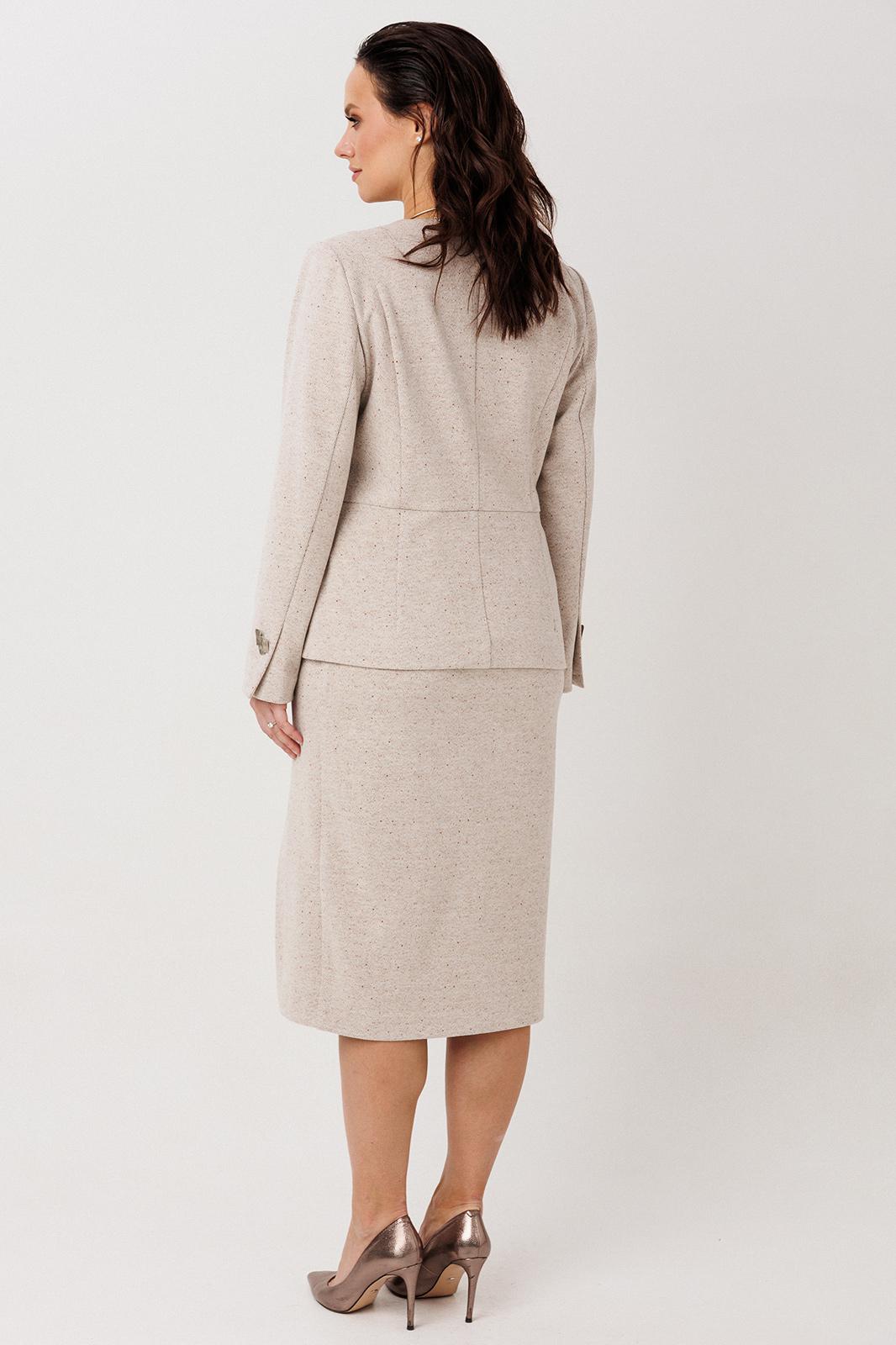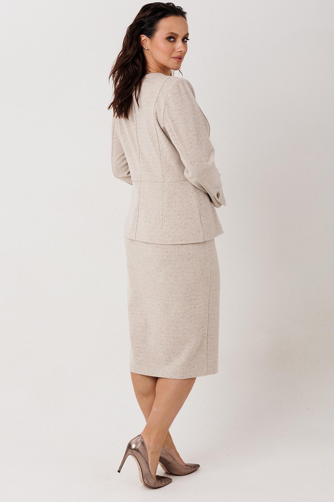 Конструктивные особенности: Костюмная ткань с добавлением эластана — сохраняет форму, устойчива к морщинам и износу. Приталенный силуэт жакета и юбка с эластичным поясом создают баланс между строгостью и комфортом.