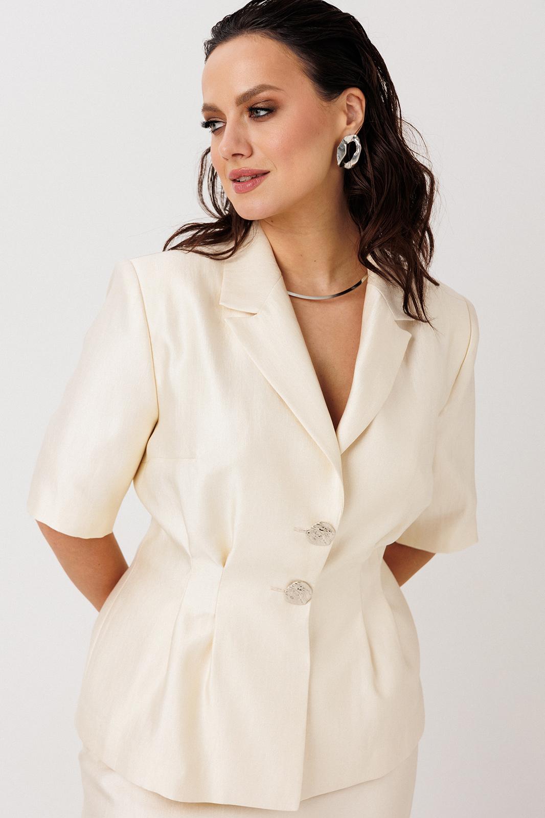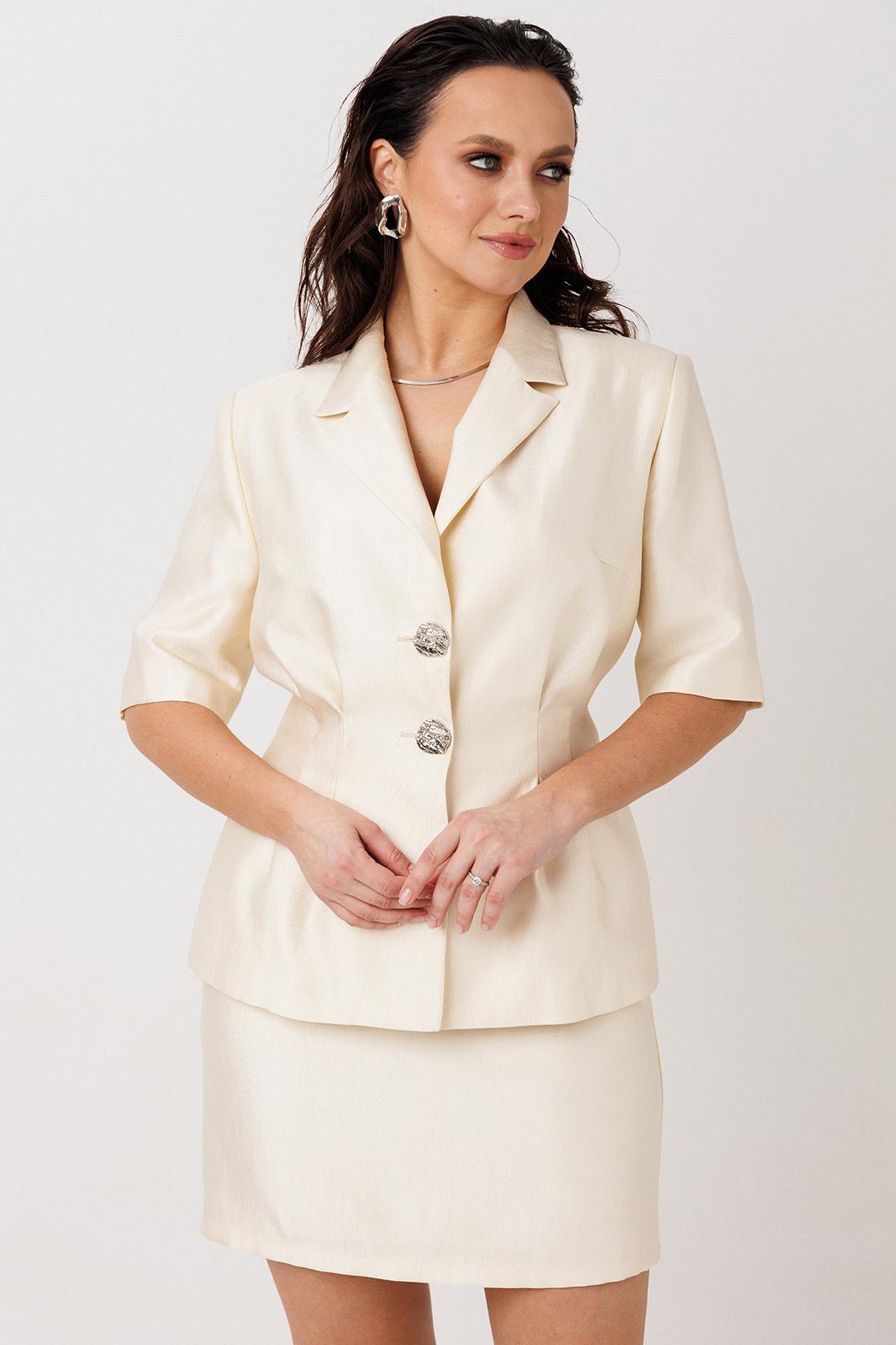 Элегантный костюм-двойка (жакет и юбка), выполненный из сатиновой костюмной ткани с легким сиянием, сочетает строгий деловой стиль с современными деталями. Жакет с V-образным вырезом и приталенным силуэтом застегивается на два декоративных пуговицы, формирующих акцент на талии. Короткие рукава с четкой структурной обработкой краев обеспечивают функциональность и лаконичность. Юбка с прямым кроем создают эффект легкости и изысканности, идеально дополняя силуэт. Застежка на тесьму -молнию в центральном шве. Пояс юбки на обтачке, частично вставлена резинка.