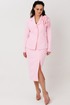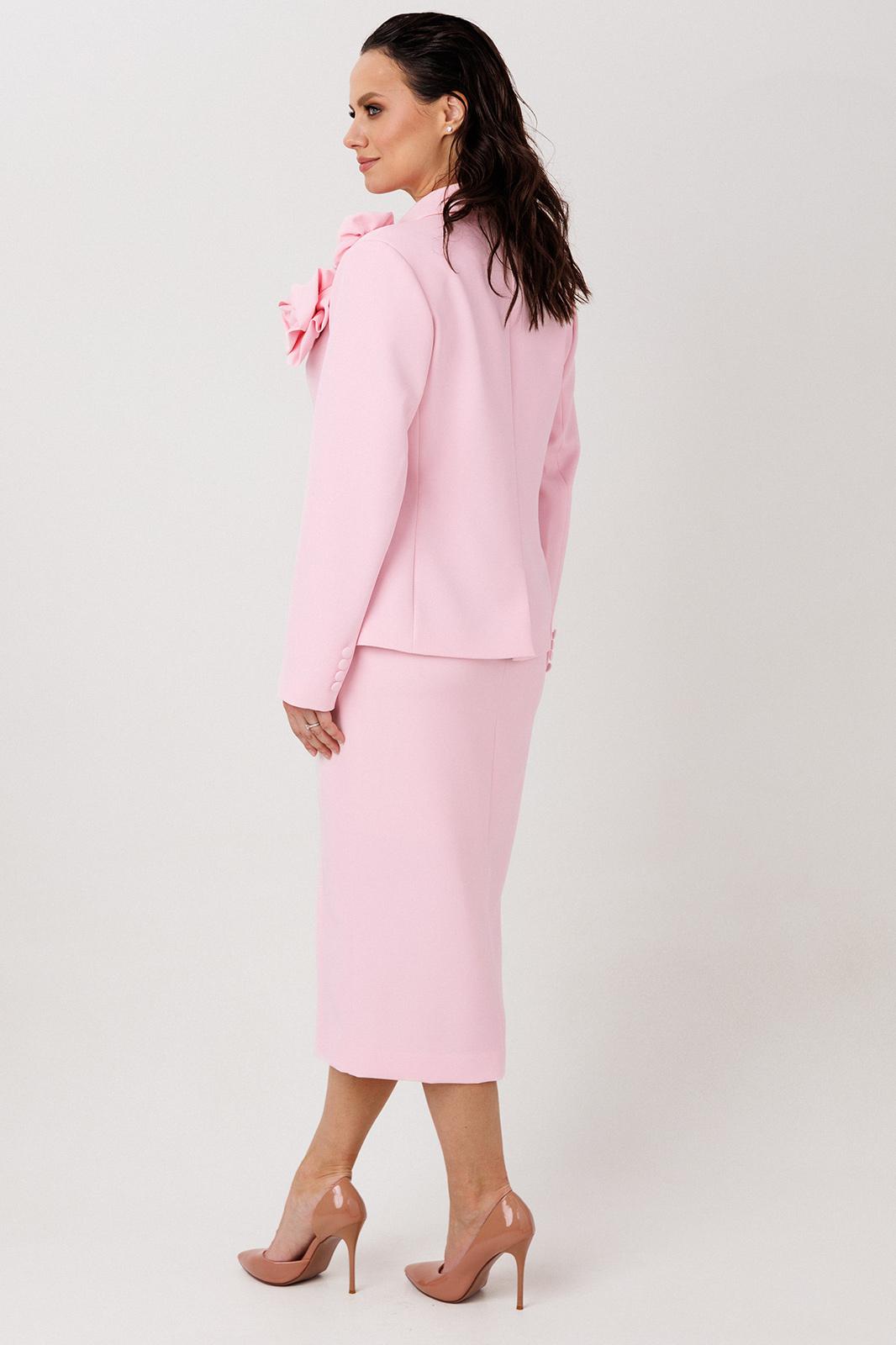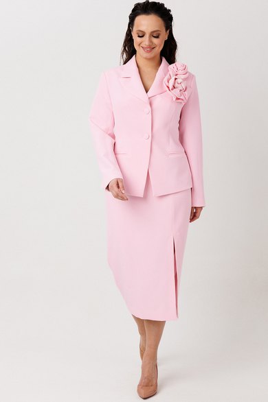 Элегантный женский костюм классического кроя. Комплект состоит из жакета и юбки-карандаш. Жакет полуприлегающего силуэта, спинка со средним швом, заканчивающимся шлицей. По конструкции предусмотрен воротник с лацканами. Застежка на две пуговицы. В передней части предусмотрены два прорезных кармана. Рукава втачные, двухшовные, со шлицей на пуговицах. Юбка длиной миди, слегка зауженная к низу. Застежка на молнию в центральном шве. В левой боковой части юбки размещен разрез от колена до низа, что обеспечивает свободу движения и добавляет элегантности. Жакет и юбка на подкладке. Жакет дополняет декоративная съемная брошь.