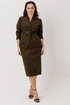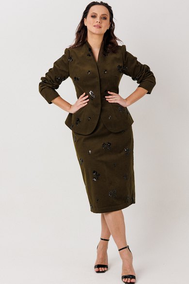 Элегантный костюм-двойка (жакет и юбка), выполненный из штруксовой ткани с декоративной вышивкой пайетками в виде цветочных мотивов, создающих эффект люминесценции при движении. Жакет на подкладке, с приталенным силуэтом застегивается на две потайные кнопки, обеспечивающие аккуратный внешний вид и скрытую застежку. Юбка-карандаш чуть ниже колена, с задней шлицей гарантирует свободу движений и подчеркивает строгий крой. Пояс юбки на обтачке, застежка на молнию, частичная резинка по талии. Задняя шлица юбки — функциональный элемент, обеспечивающий удобство при ходьбе и соответствующий стандартам костюмного кроя. Юба на подкладке.