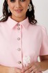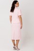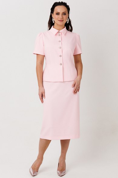 Элегантный женский костюм классического кроя. Комплект состоит из жакета и юбки-карандаш. Жакет полуприлегающего силуэта, спинка со средним швом. По конструкции предусмотрена центральная застежка на 8 пугович. воротник стоячий отложной. Рукава втачные, со сборкой по окату. Юбка длиной миди, слегка зауженная к низу со шлицей. Пояс юбки на обтачке, застежка на тесьму-молнию, пояс частично на резинке по бокам. Жакет и юбка на подкладке.
