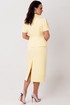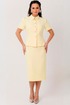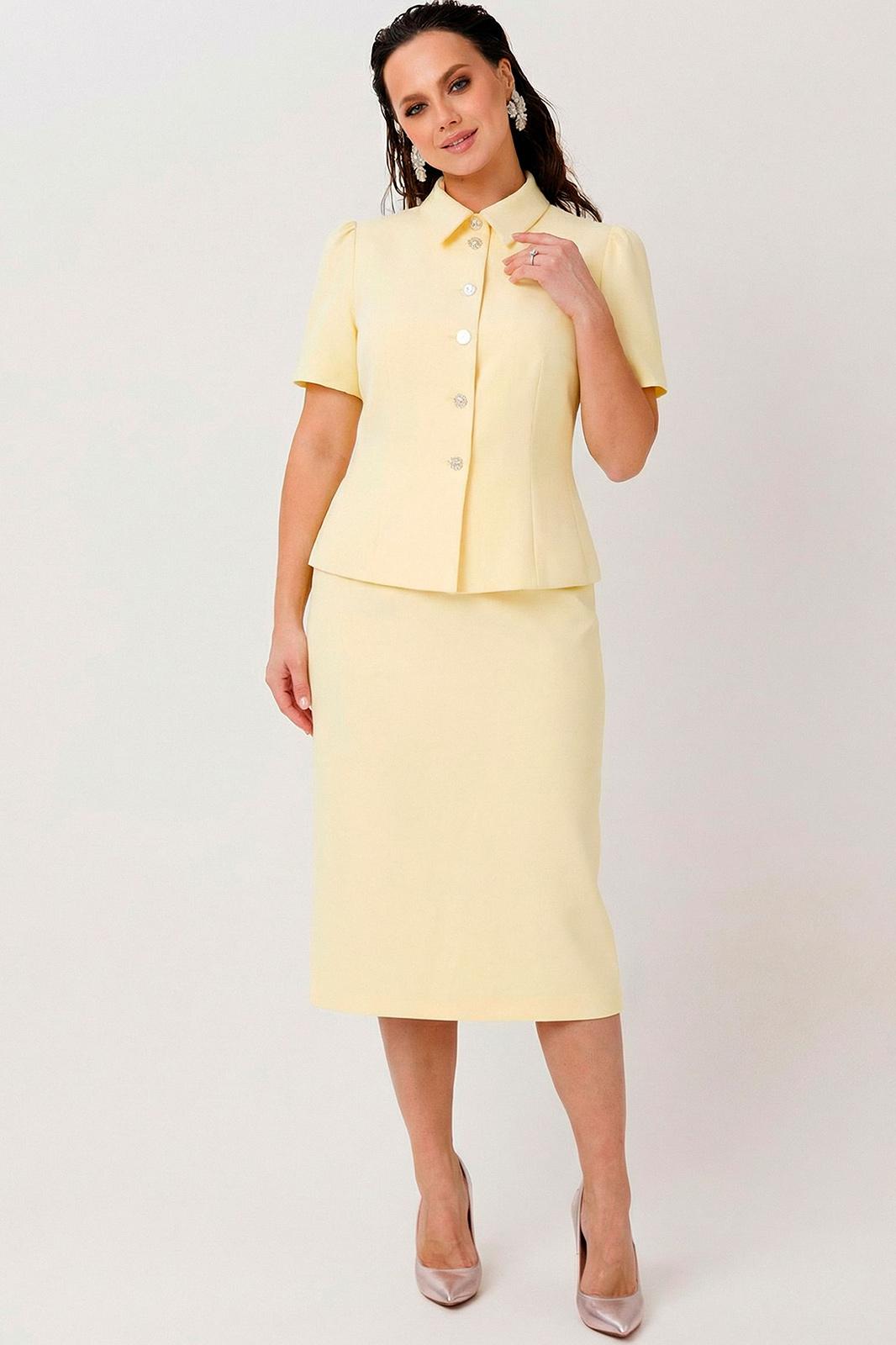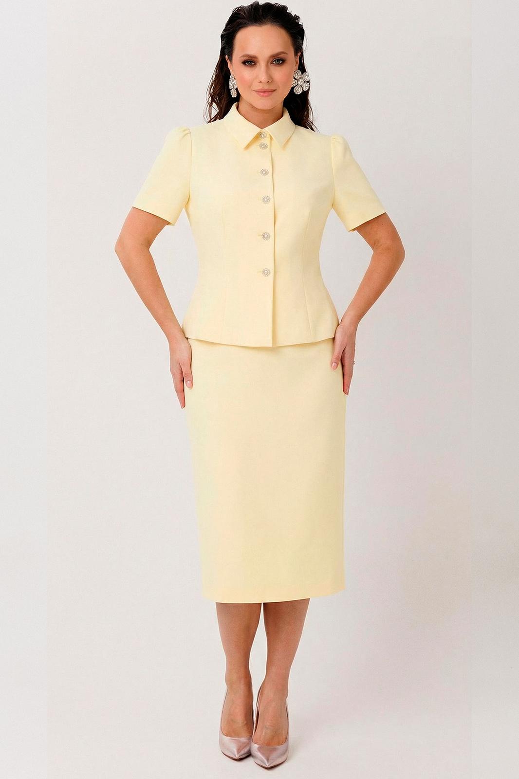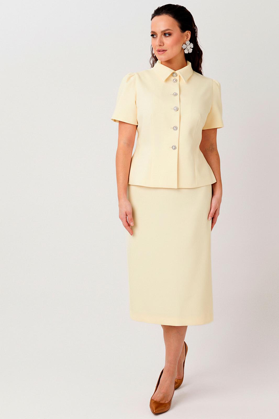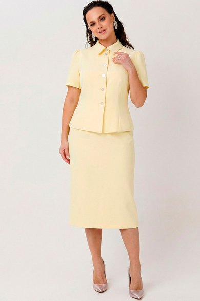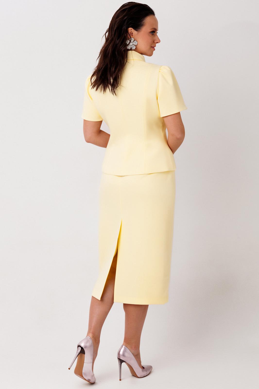 Элегантный женский костюм классического кроя. Комплект состоит из жакета и юбки-карандаш. Жакет полуприлегающего силуэта, спинка со средним швом. По конструкции предусмотрена центральная застежка на 8 пугович. воротник стоячий отложной. Рукава втачные, со сборкой по окату. Юбка длиной миди, слегка зауженная к низу со шлицей. Пояс юбки на обтачке, застежка на тесьму-молнию, пояс частично на резинке по бокам. Жакет и юбка на подкладке.