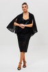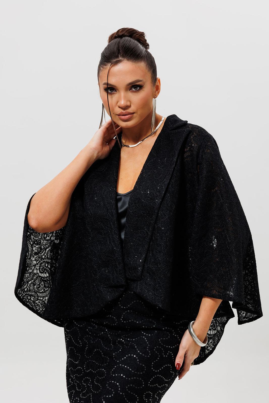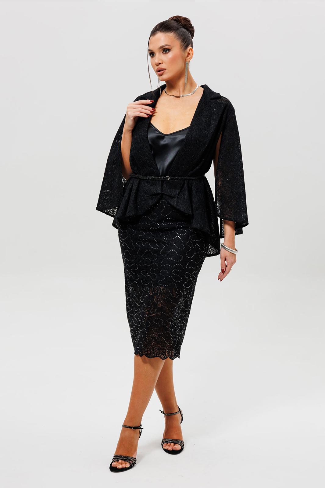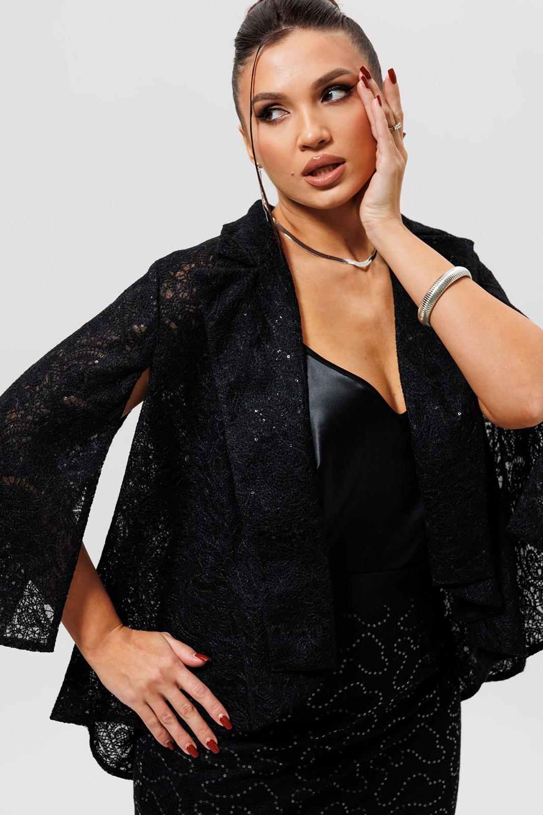 Костюм (жакет, топ, юбка) выполнен из кружевной ткани на основе сетки. На ткани кейпа и юбки пришиты пайетки, которые придают лёгкое мерцание. В кейпе низ изделия и низ рукава фигурные. Силуэт прямой, расширен к низу. Воротник пиджачного типа. Рукав пришит только по окату верхней части, что придаёт эффект отлетного рукава. Всё изделие обработано сеткой в цвет ткани с изнаночной стороны. Юбка на подкладке, прямого силуэта, заужена к низу. На переднем полотнище юбки обработаны талиевые вытачки. На заднем полотнище юбки есть средний шов, который заканчивается разрезом. Обработаны талиевые вытачки. Топ выполнен из атласной ткани. Изделие прямого силуэта с нагрудными вытачками. Перед фигурный, обработан окантовкой, так же, как и низ изделия. Бретели регулируются. Представляем готовый костюм с кейпом, блузой и юбкой, создающий целостный и невероятно эффектный образ для самого особого случая. В комплект входит черный кружевной кейп (Арт. 1278) с мерцающей изнутри отстрочкой-«змейкой» и соответствующая ему кружевная юбка, где та же самая декоративная отстрочка с пайетками выведена на внешнюю сторону, создавая перекликающиеся акценты. Такой костюм с накидкой — идеальное решение для свадьбы в качестве наряда для гостей, торжественного выхода в театр или романтического ужина. Юбка с пайетками и лаконичный кейп вместе создают гармоничный и запоминающийся ансамбль, подчеркивающий ваш утонченный вкус.