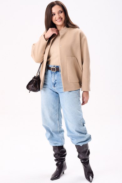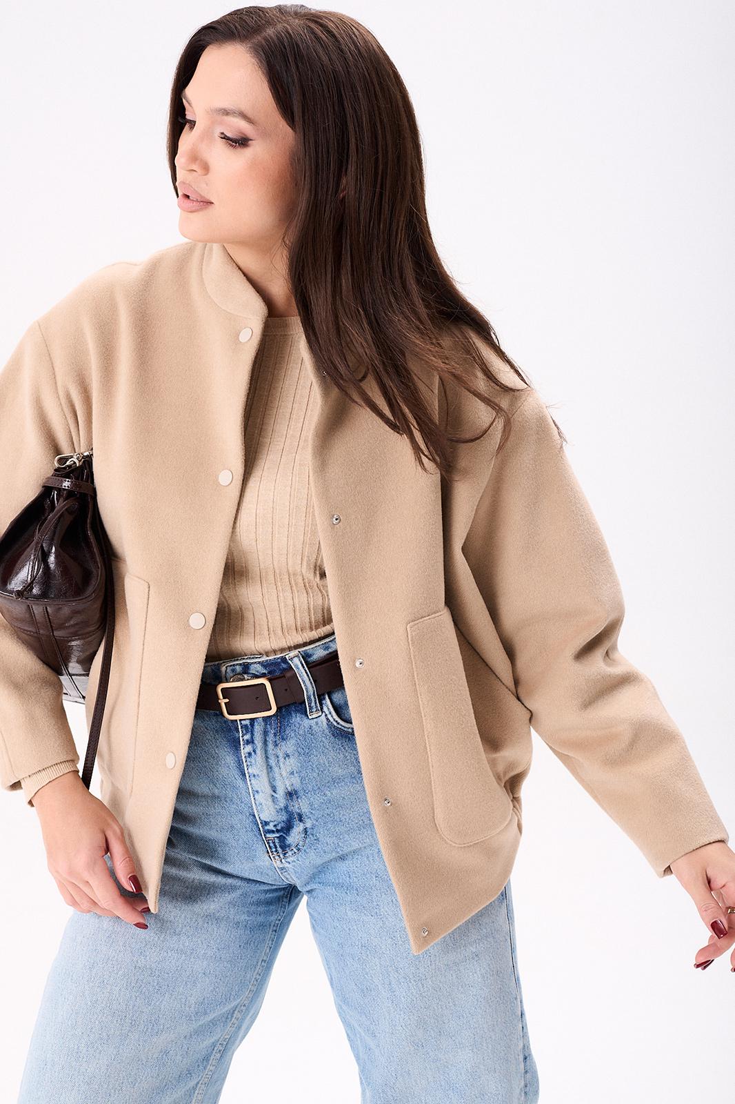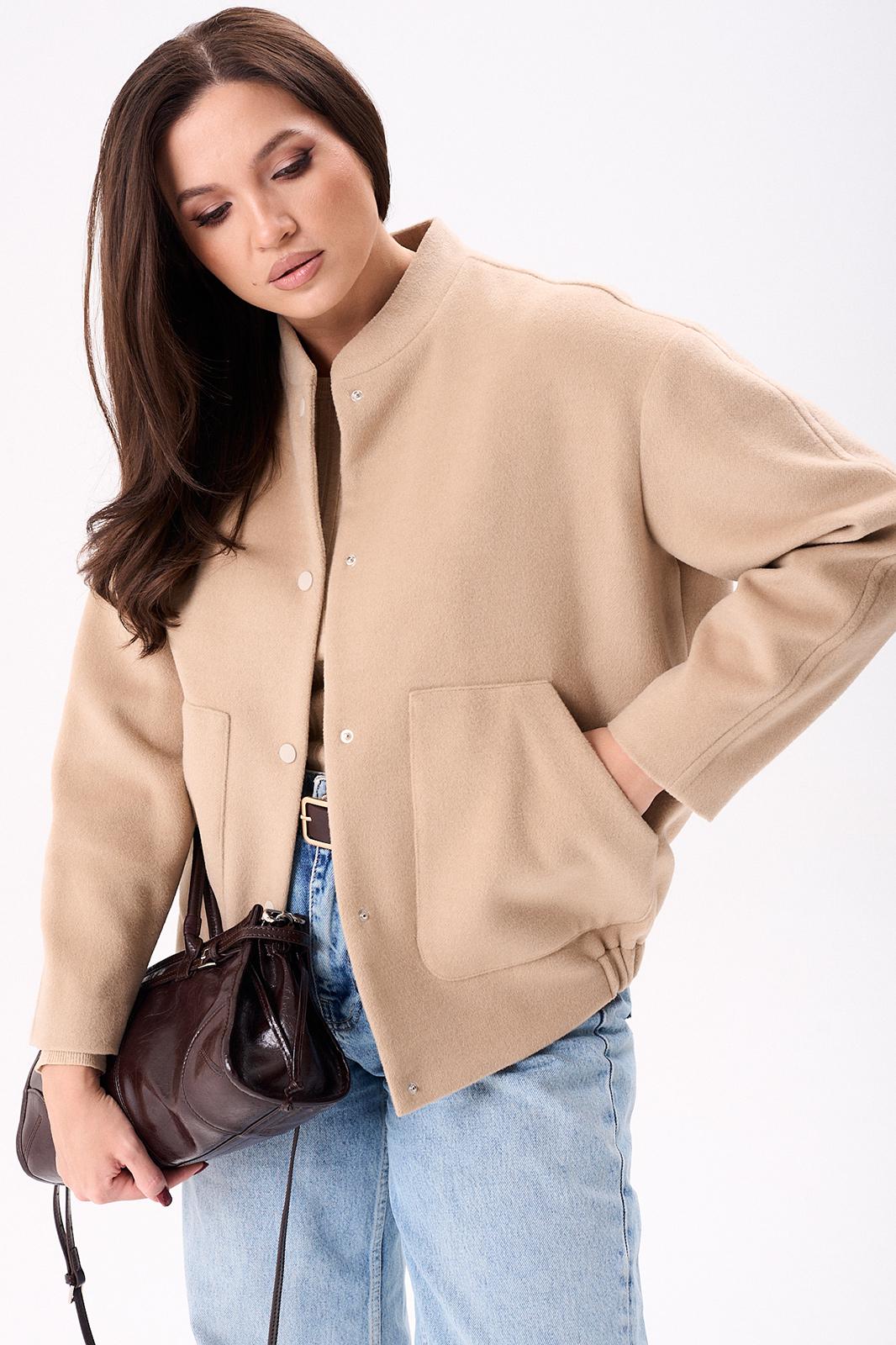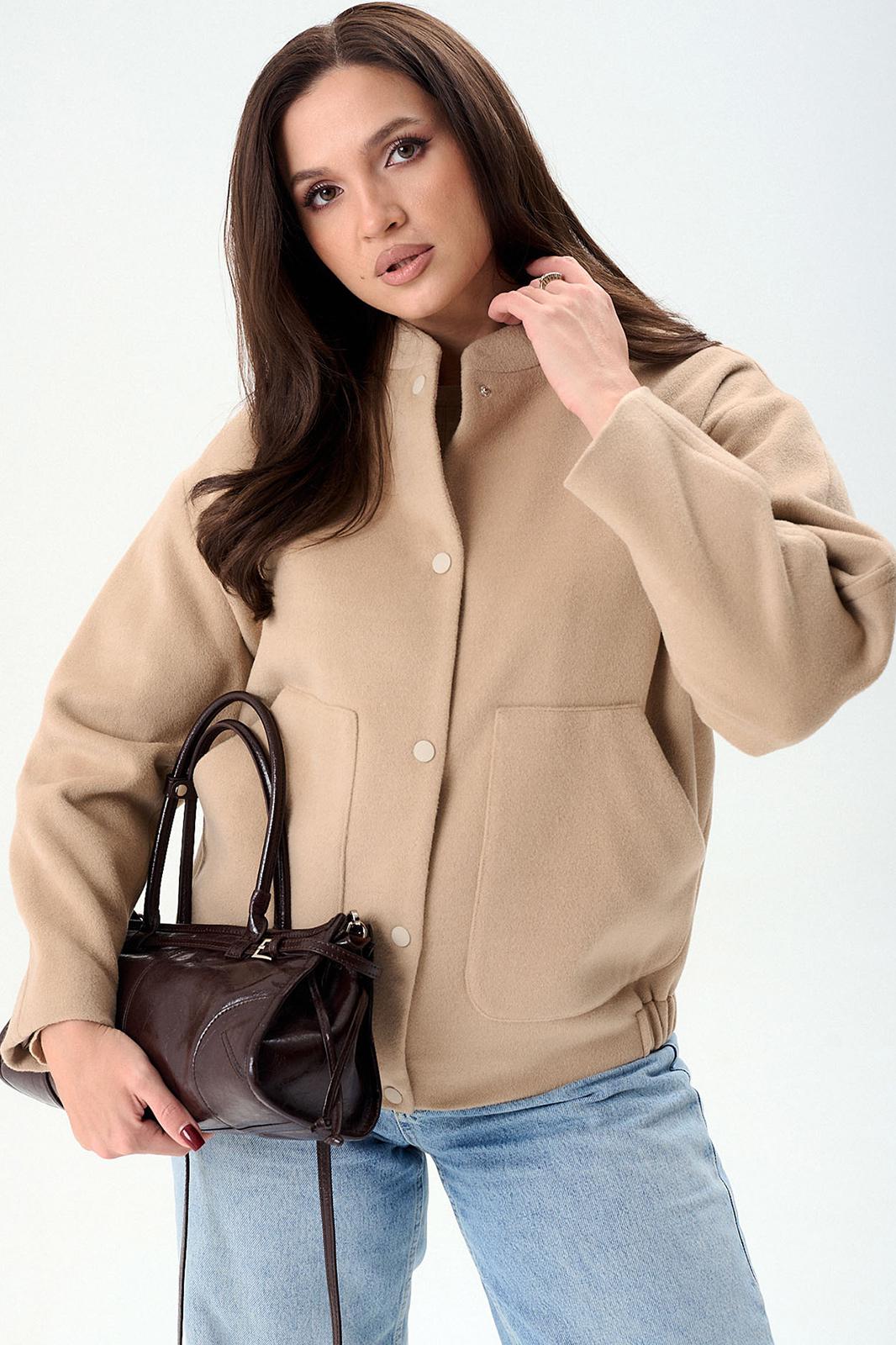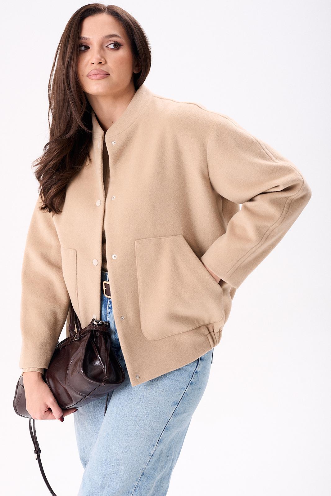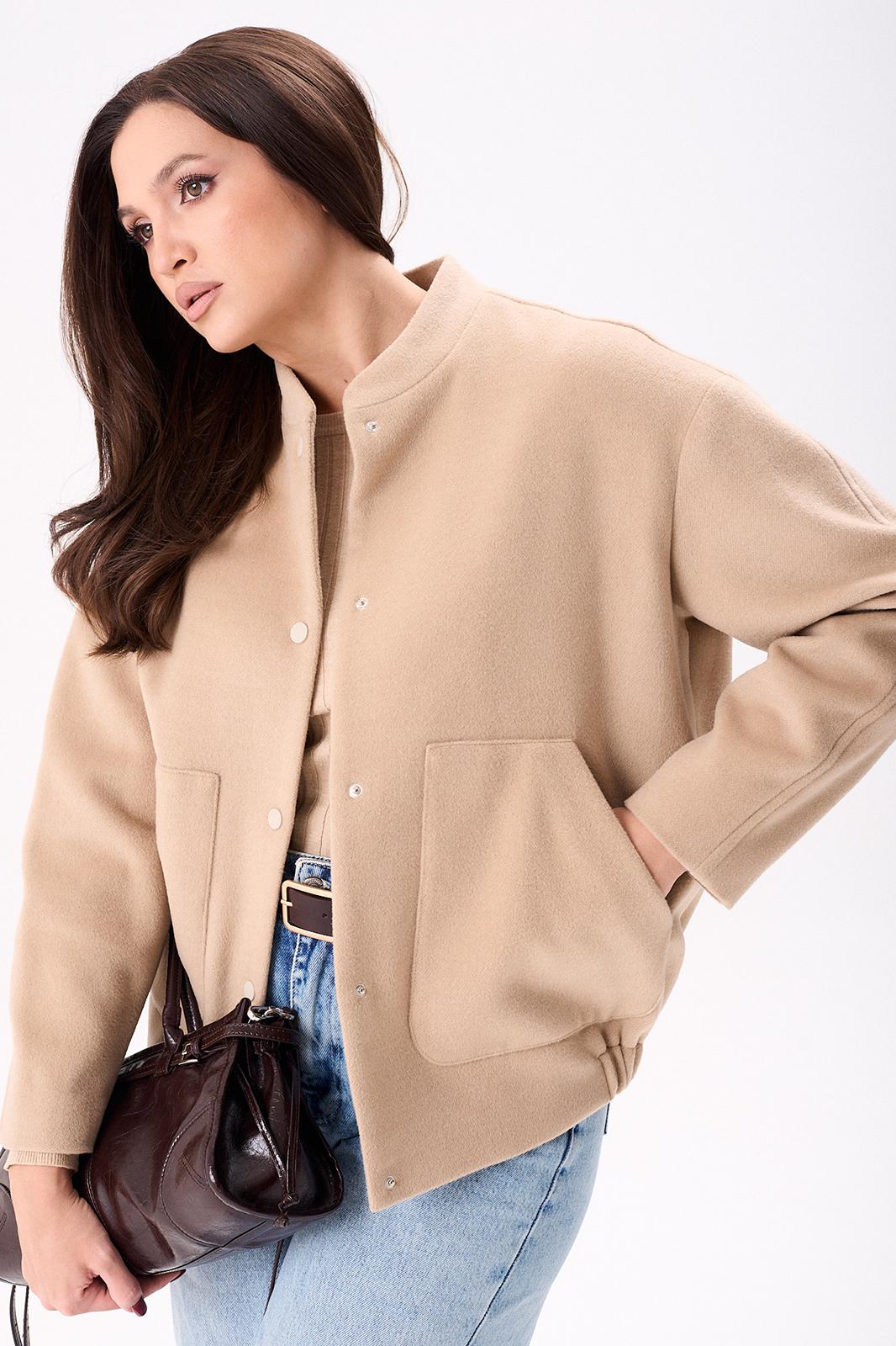 Женский жакет выполнен из мягкой, пальтовой ткани что придаёт изделию универсальность и комфорт. Воротник-стойка. Застёжка: на пробивные кнопки. Рукава со спущенной проймой втачной, двухшовный. В изделии предусмотрены накладные карманы на передней части. Эластичная резинка по нижнему краю жакета создаёт лёгкую сборку, что подчёркивает силуэт и обеспечивает дополнительное удобство. Жакет на подкладке.