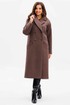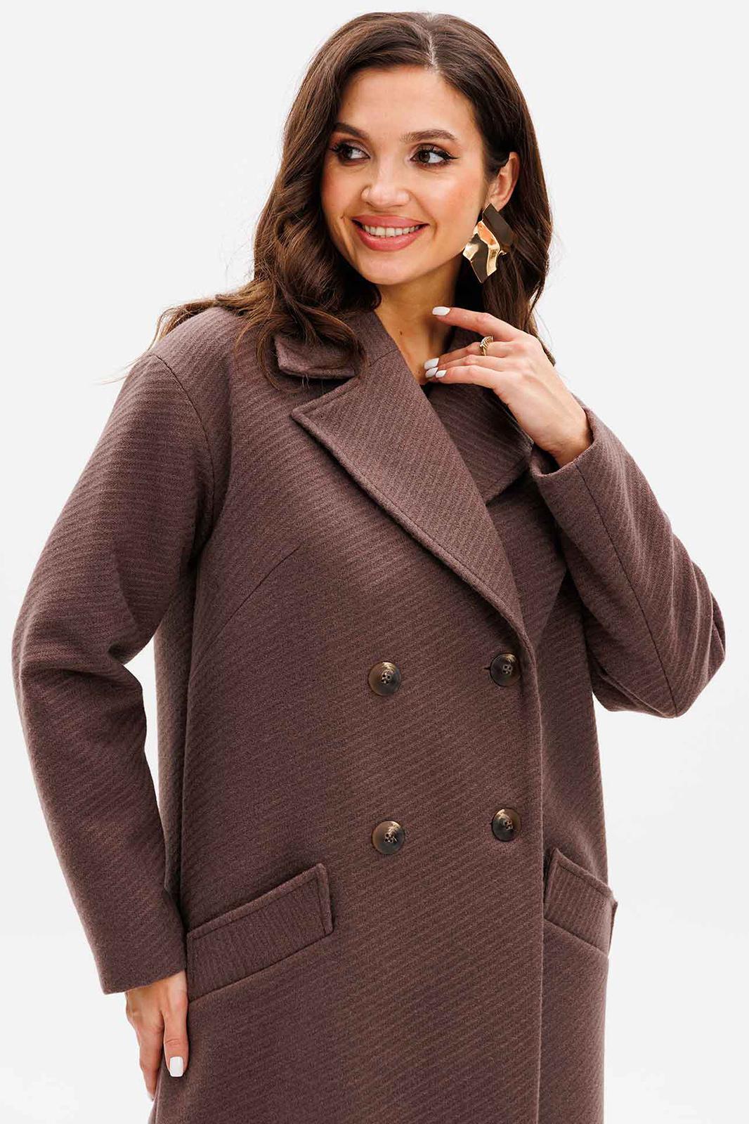 Пальто женское прямого силуэта, выполнено из пальтовой фактурной ткани. По переду нагрудные вытачки, застежка центральная двубортная на четыре прорезные петли и пуговицы, карманы прорезные с клапанами. Рукава двух шовные втачные со спущенным плечом. Центральный шов спинки заканчивается шлицей.