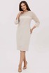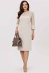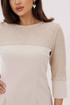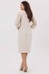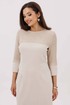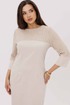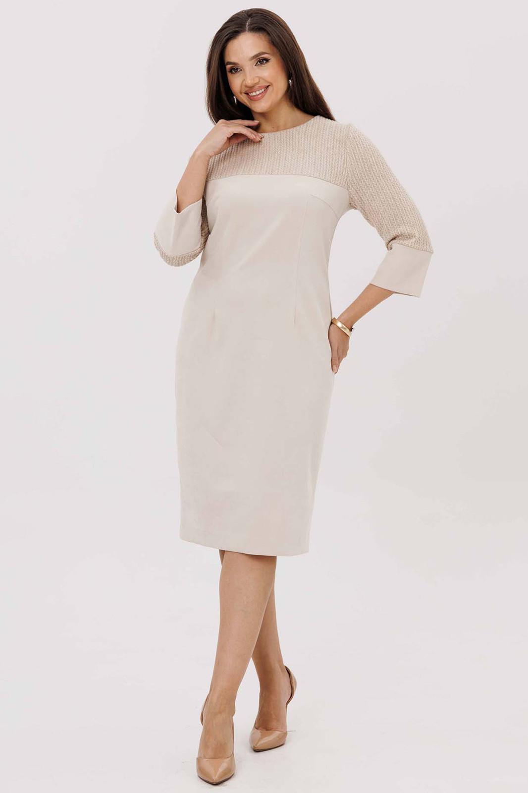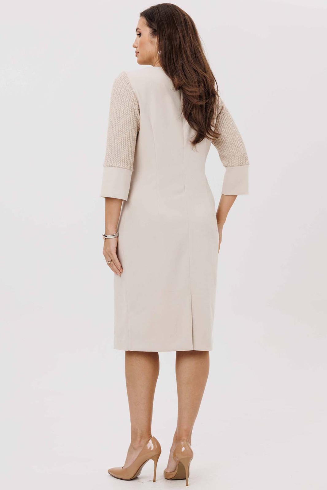 Платье полуприлегающего силуэта. Перед с отрезной кокеткой из отделочной ткани и с нагрудными и талиевыми вытачками. Спинка со средним швом, в который вставлена тесьма-молния). На спинке талиевые вытачки. Средний шов заканчивается шлицей.Рукав одношовный втачной из отделочной ткани с притачным манжетом из основной ткани.
