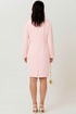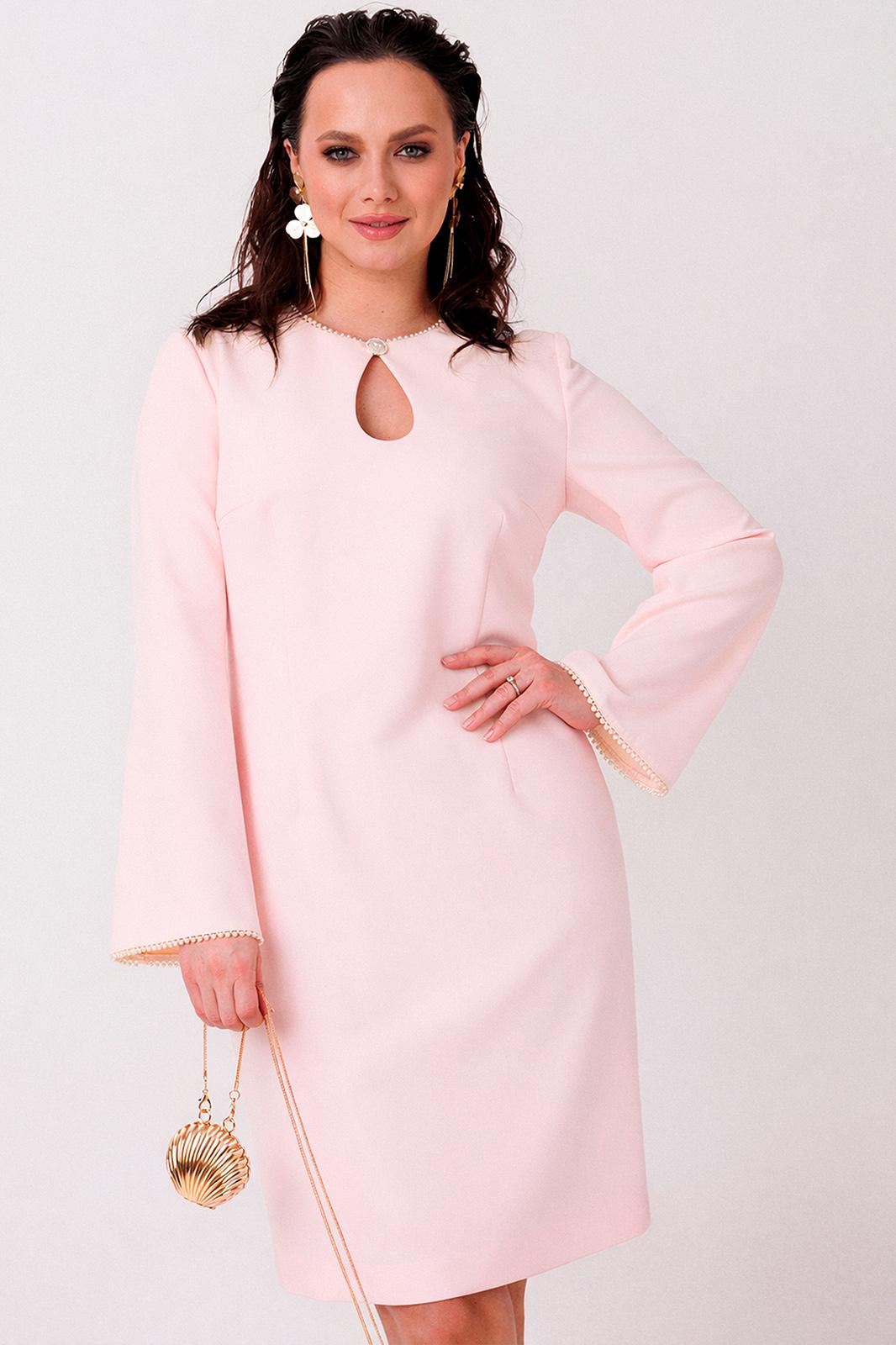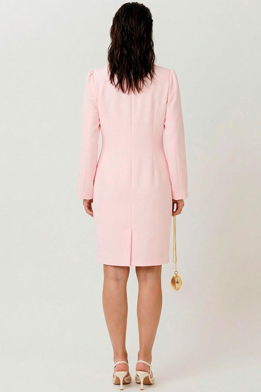 Элегантное платье-футляр, выполненное из плотной плательной ткани на подкладке. Дизайн акцентирован декоративной бейкой с жемчужным оформлением на горловине и манжетах рукавов — технически точная обработка краев, обеспечивающая долговечность и эстетику. Центральная деталь — пуговица-застежка на горловине, формирующая изысканный вырез-капель с эффектом глубины.