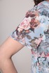 Платье женское прямого силуэта, на подкладке, тесьма-молния в левом боковом шве. Перед с диагональными подрезами: начинается слева от проймы до правого бокового шва, 5 ярусов, соединены по верхнему срезу с подкладкой, низ отлетной. Спинка со средним швом, без вытачек. Рукав втачной, одношовный. Горловина форма лодочка, по горловине спинки пришиты завязки, завязаны на бантик. Длина изделия 102см, рукав 19см.