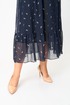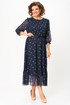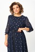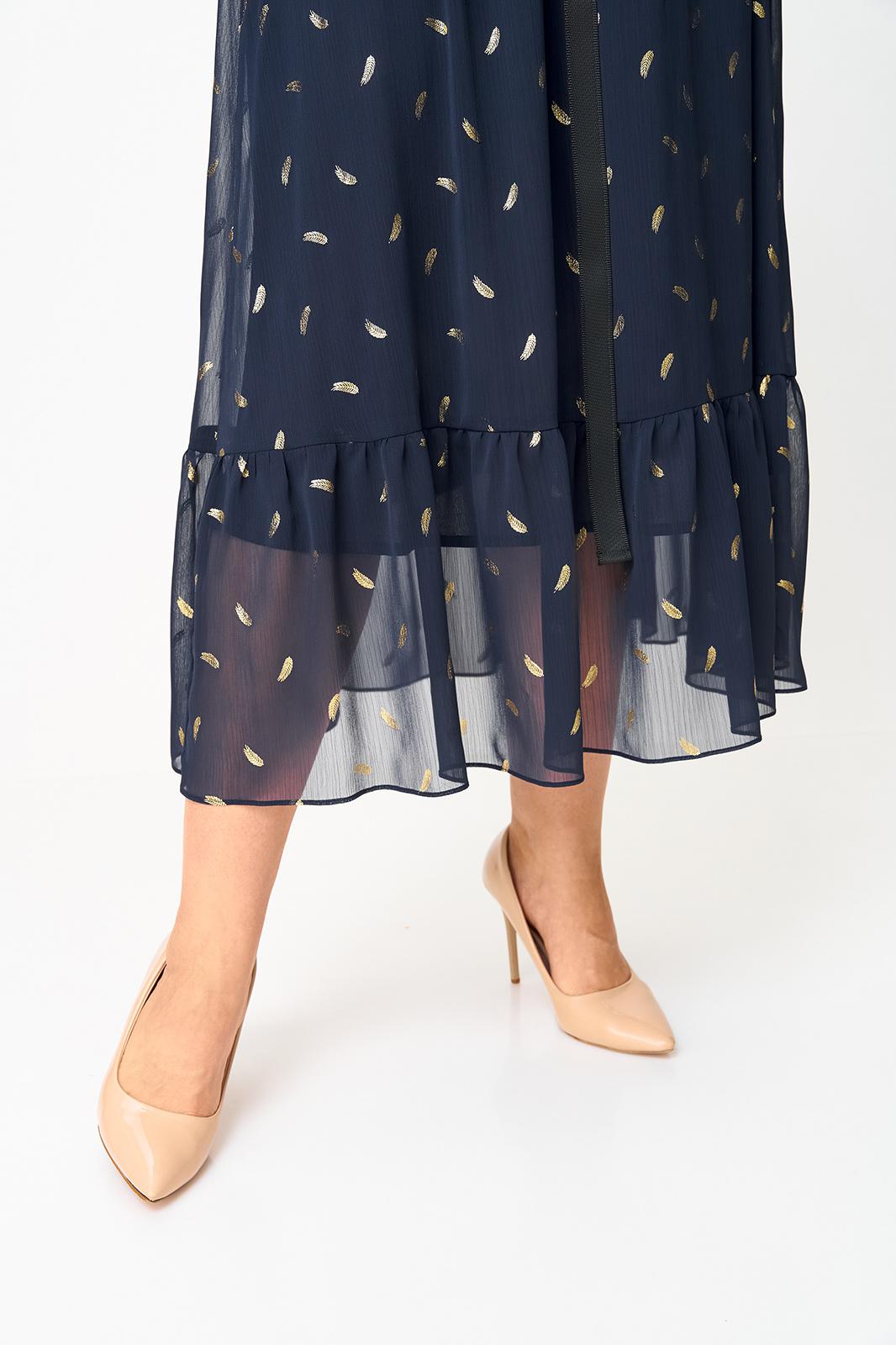 Платье женское А силуэта, на подкладке, без застежки. Перед с нагрудными вытачками. Спинка со средним швом. По низу платья пришит присобраный волан. Рукав свободный, одношовный, втачной, по окату заложена сборка, по низу присобран на эластичную тесьму в 2 ряда, образует манжету. Горловина обработана обтачкой. В дополнении пояс, застегивается на пряжку.