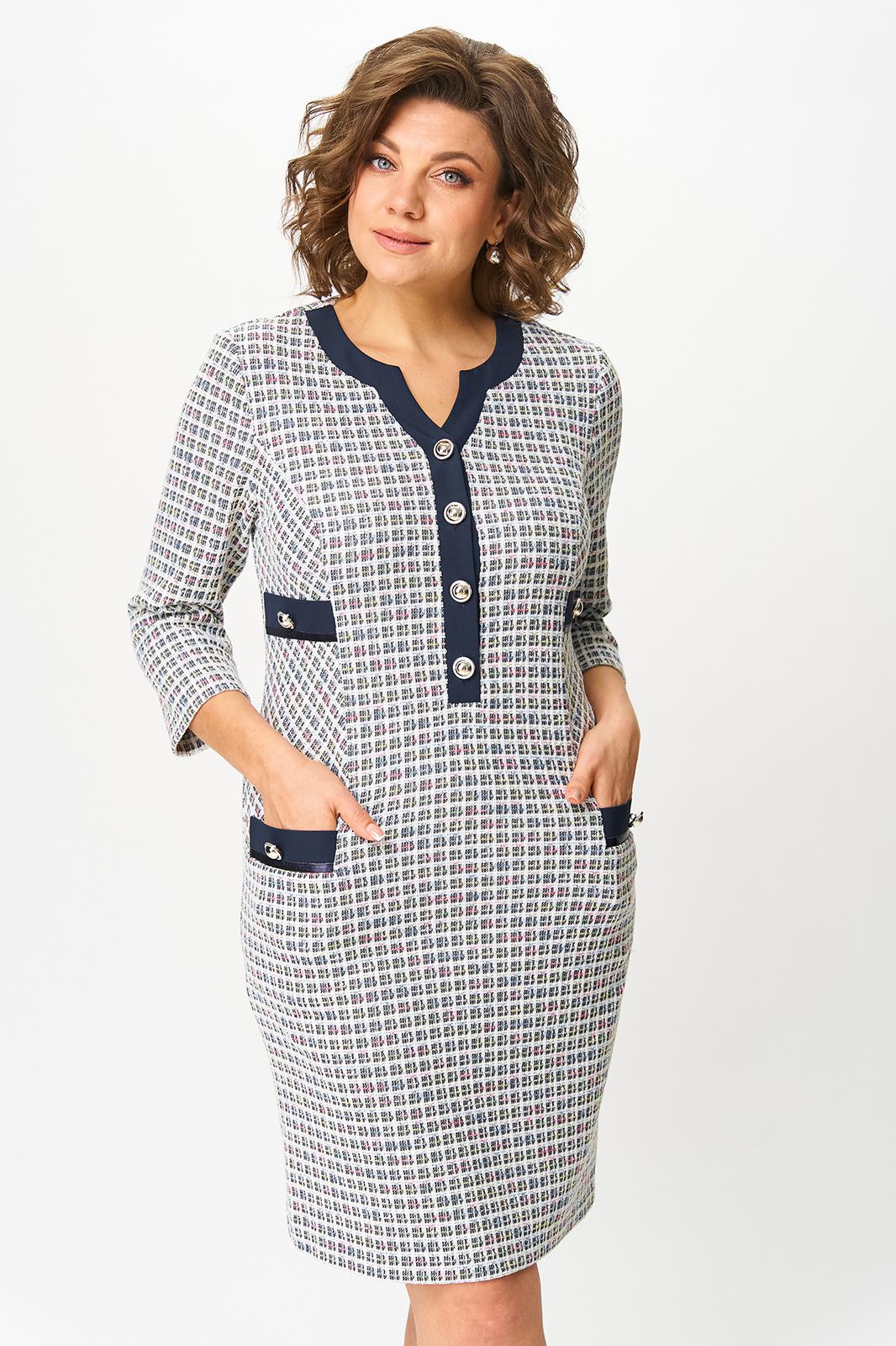 Платье женское полуприлегающего силуэта, без подкладки, тесьма-молния в среднем шве спинки, планка по переду застегивается на петли и пуговицы. Перед с рельефами от проймы, переходят в боковой шов, ниже линии талии, в шве обработан карман с клапаном. На боковую часть переда ниже линии груди пришит клапан. По низу клапанов боковой части переда и клапана кармана, настрочена отделочная тесьма, по центру клапана пришита пуговица. Спинка со средним швом, переходящим в шлицу, талиевые вытачки. Горловина спинки обработана обтачкой. Горловина переда обработана планками и подбортом. Рукав одношовный, втачной.