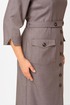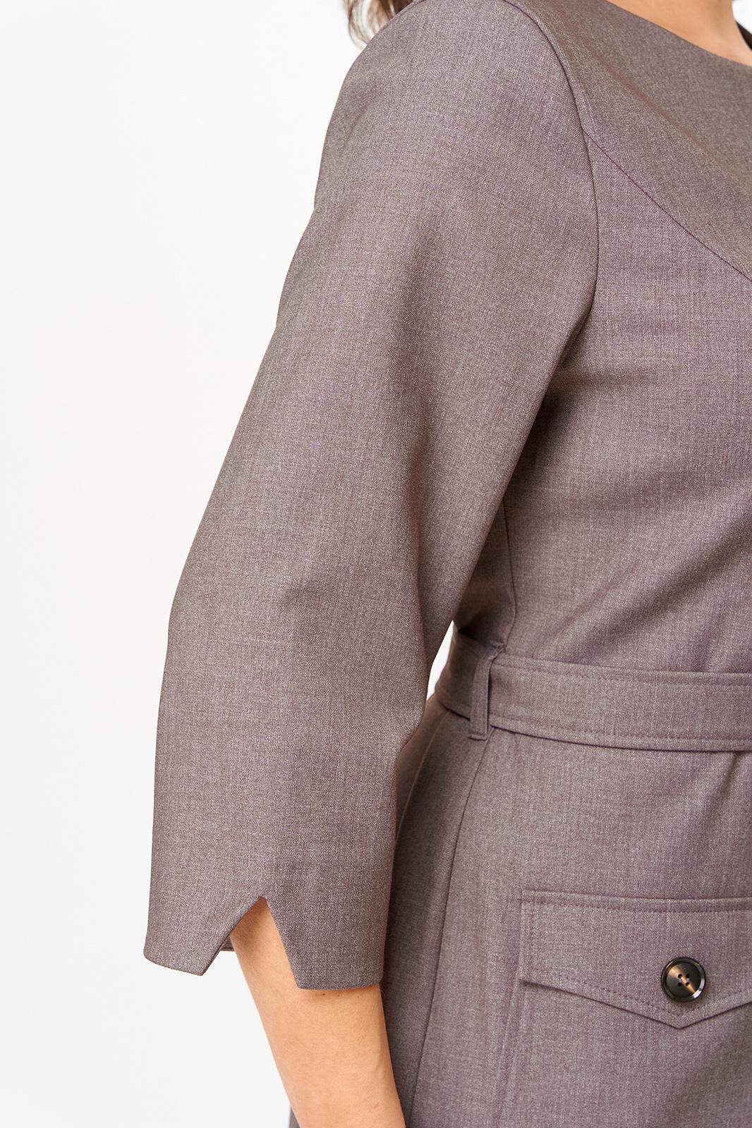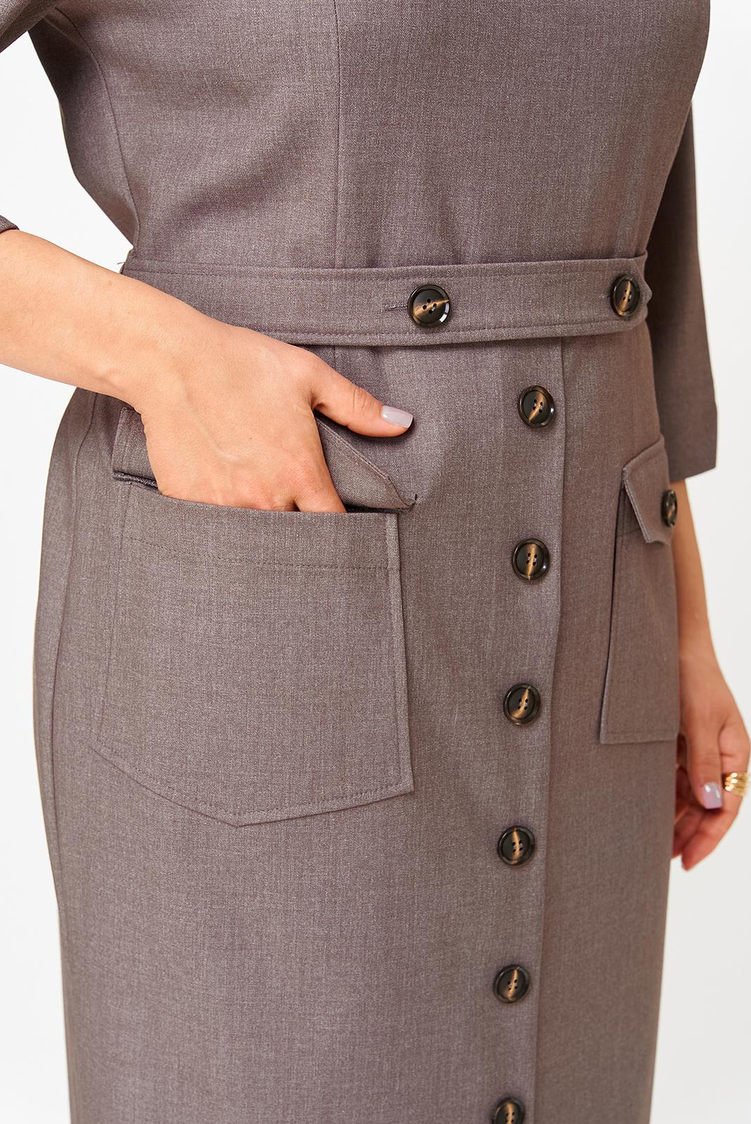 Платье женское полуприлегающего силуэта, без подкладки, тесьма-молния в среднем шве спинки. Перед отрезной по линии талии, рельефы от проймы переходят в талиевые вытачки на нижней части переда, на уровне ниже линии талии пришиты накладные карманы с клапанами, застегиваются на петлю и пуговицу. Нижняя часть переда с планкой, закреплена пуговицами. Спинка со средним швом, переходящим в шлицу, талиевые вытачки. Рукав одношовный, по низу рукава обработан разрез. Горловина обработана обтачками. На уровне линии талии по боковому шву настрочены шлевки, для пояса. В дополнении пояс из основной ткани, застегивается на две петли и пуговицы.