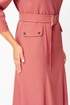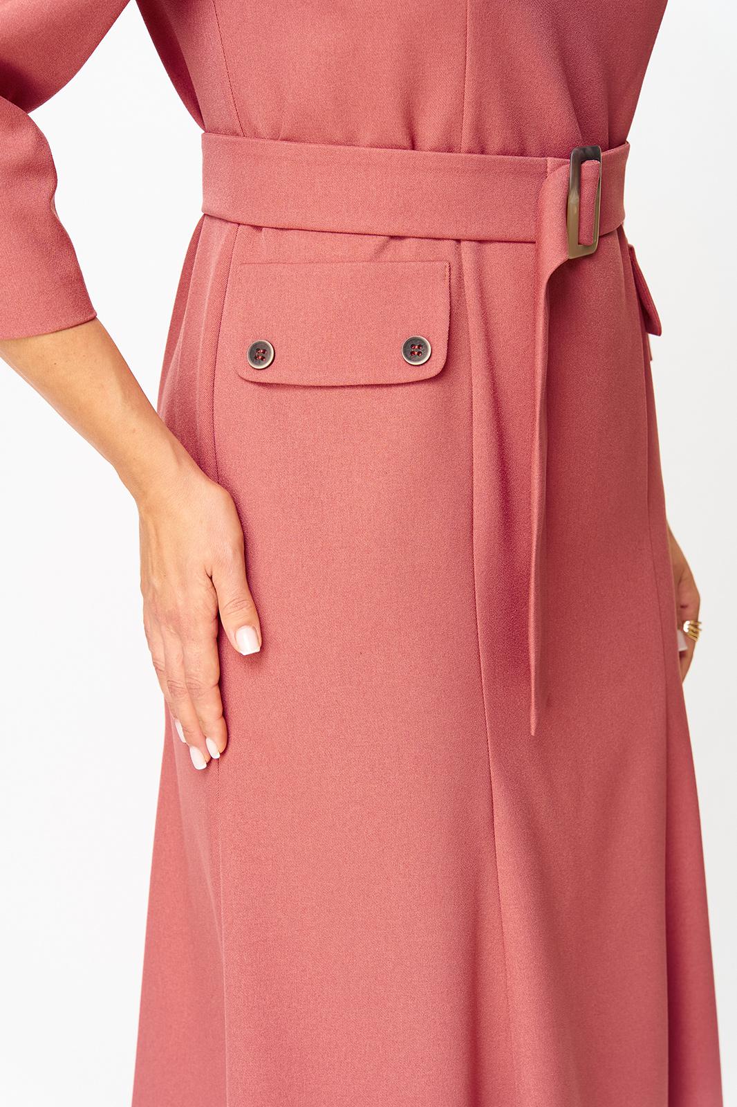 Платье женское полуприлегающего силуэта, без подкладки, тесьма-молния в среднем шве спинки. Перед отрезной по линии талии, рельефы от проймы переходят в талиевые вытачки на нижней части переда, на уровне ниже линии талии пришиты накладные карманы с клапанами, застегиваются на петлю и пуговицу. Нижняя часть переда с планкой, закреплена пуговицами. Спинка со средним швом, переходящим в шлицу, талиевые вытачки. Рукав одношовный, по низу рукава обработан разрез. Горловина обработана обтачками. На уровне линии талии по боковому шву настрочены шлевки, для пояса. В дополнении пояс из основной ткани, застегивается на две петли и пуговицы.