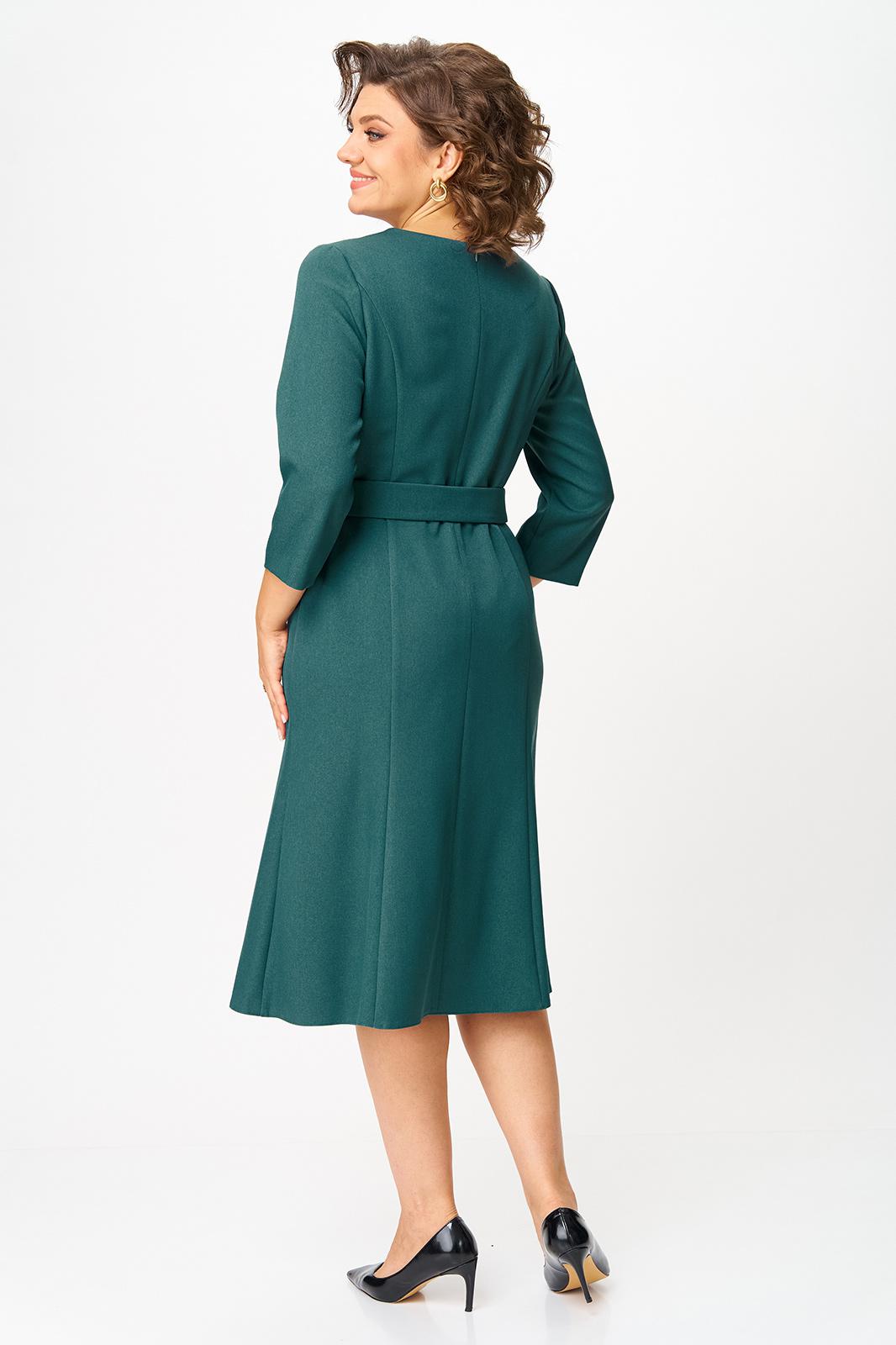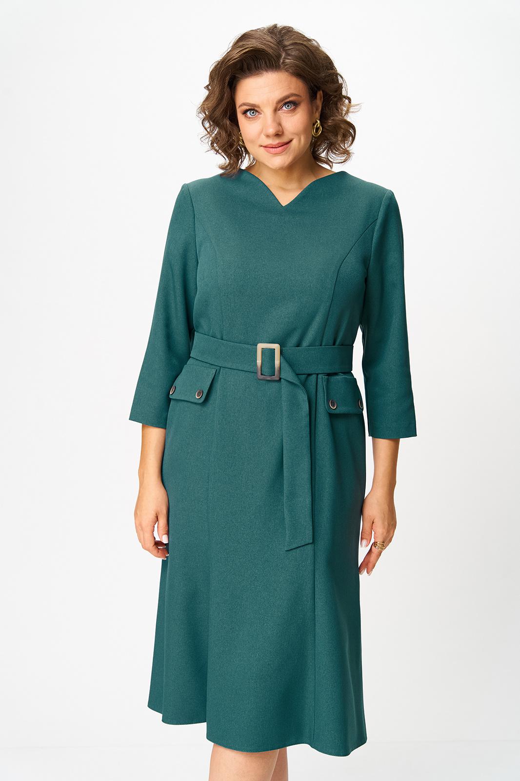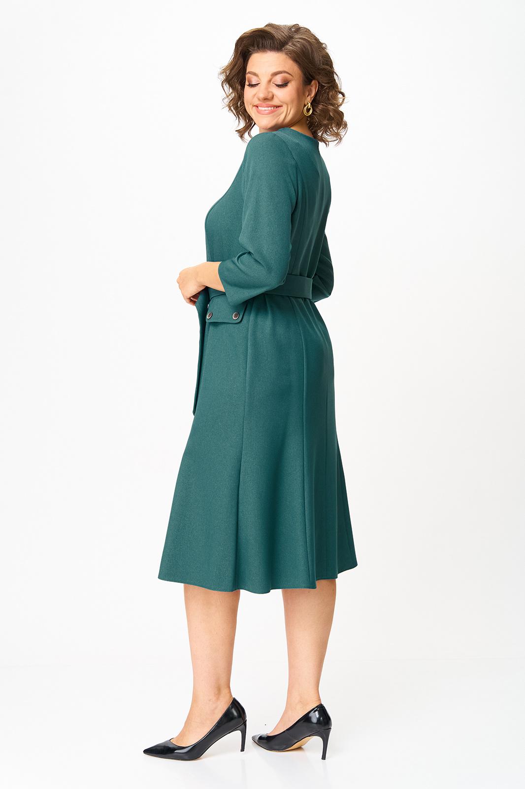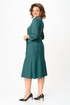 Платье женское полуприлегающего силуэта, без подкладки, тесьма-молния в среднем шве спинки. Перед отрезной по линии талии, рельефы от проймы переходят в талиевые вытачки на нижней части переда, на уровне ниже линии талии пришиты накладные карманы с клапанами, застегиваются на петлю и пуговицу. Нижняя часть переда с планкой, закреплена пуговицами. Спинка со средним швом, переходящим в шлицу, талиевые вытачки. Рукав одношовный, по низу рукава обработан разрез. Горловина обработана обтачками. На уровне линии талии по боковому шву настрочены шлевки, для пояса. В дополнении пояс из основной ткани, застегивается на две петли и пуговицы.