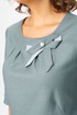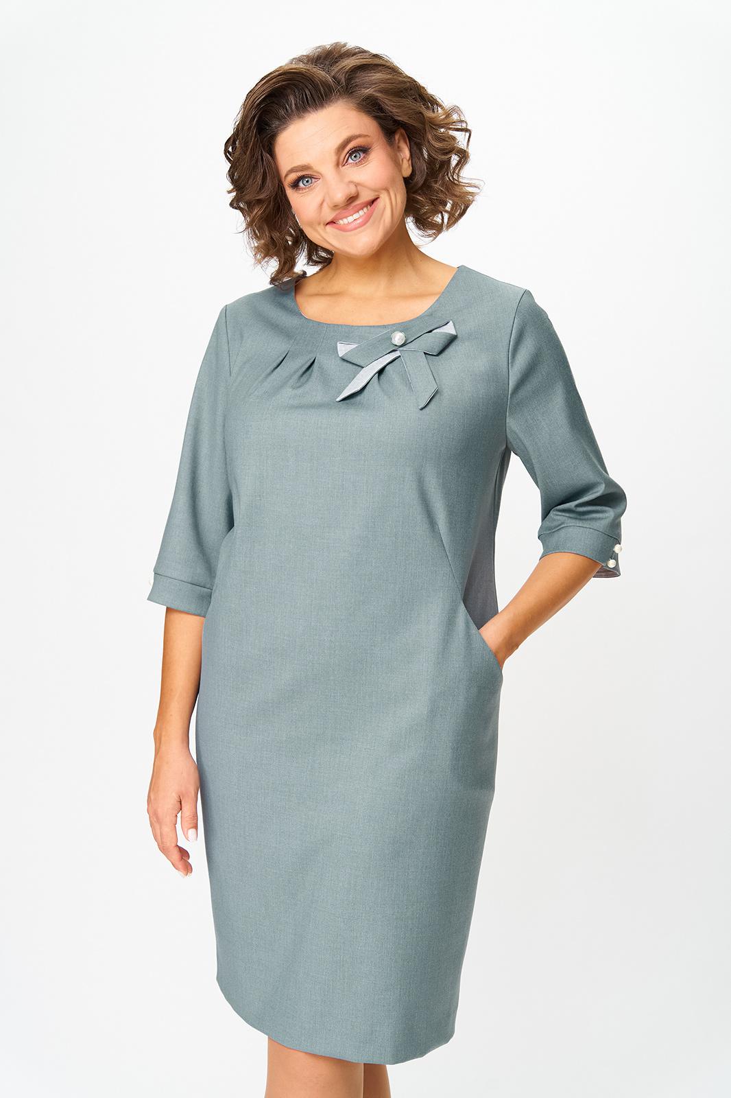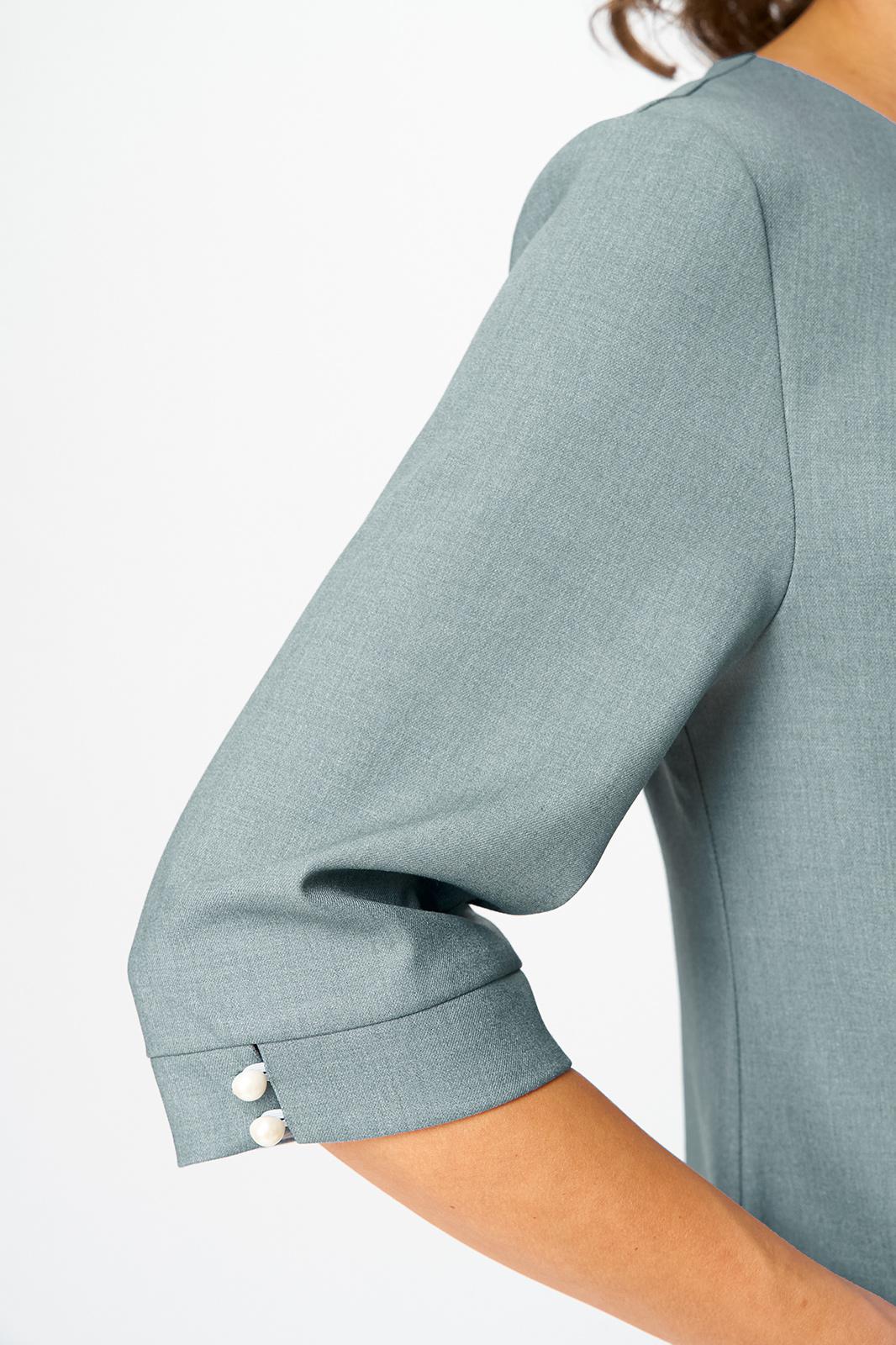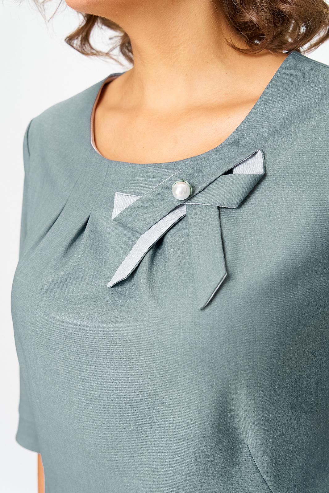 Платье женское прямого силуэта, без подкладки, тесьма-молния в среднем шве спинки. По горловине переда застрочены 4 встречные складки. По переду обработан подрез от бокового шва, переходящий в вытачку, в шов вставлен боковой карман. Спинка со средним швом, переходящим в шлицу, талиевые вытачки. Горловина обработана обтачкой. Рукав одношовный, втачной, притачная манжета с разрезом, застегивается на две навесные петли и пуговицы. Слева по горловине переда пришит бант. Обтачка горловины переда и спинки, нижняя часть банта, нижняя часть хвостиков банта, нижняя часть манжеты из отделочной ткани. В качестве отделки по центру банта пришито украшение.