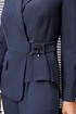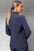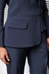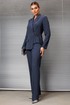 Двухпредметный комплект, который состоит из жакета и брюк. Жакет полуприлегающего силуэта с ассиметричной полочкой, на которой выполнен карман в рамку. Рукав втачной, двухшовный. Спинка со средним швом и талиевыми вытачками. Воротник пиджачной формы. Жакет на подкладке. Брюки прямые, по низу с манжетой, сверху на притачном поясе-кокетке, по бокам с карманами. Застежка на тесьму-молнию в среднем шве.