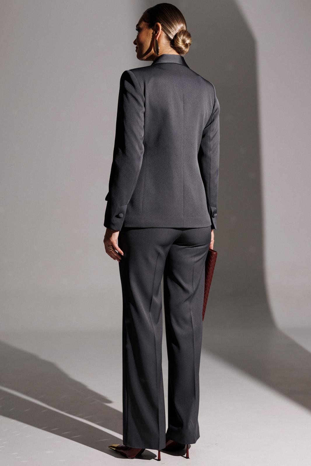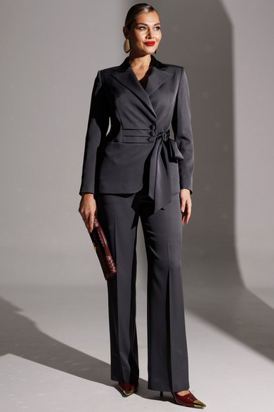 Брюки классические,со стрелками,с притачным поясом-сзади частично на резинке для удобства и комфортной посадки. На поясе имеются пять шлёвок. На передних половинках присутствуют карманы. Застёжка на молнию и пуговицу. Костюм выполнен из качественной костюмной ткани с отделкой из атласа.