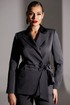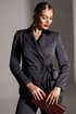 Жакет полуприлегающего силуэта с двухбортной застежкой на три обтяжные из атласной ткани пуговицы и одной потайной. Край борта овальной формы, что придаёт жакету утонченность. По переду обработаны фигурные рельефы из проймы, также имеется горизонтальный подрез,в котором расположены карманы. На правой центральной части полочки - три складки, параллельные подрезу. Дополнительно с левой стороны завязывается атласный бант,что придает нарядность и особый шарм. Одна часть банта крепиться на пуговицу, другая в боковом шве. Спинка со средним швом и вертикальными рельефами из проймы. Воротник пиджачного типа из атласной ткани с пикообразными лацканами. Рукава двухшовные, со шлицей в локтевом шве на одну пуговицу, также обтяжную из атласа. Жакет на подкладке.