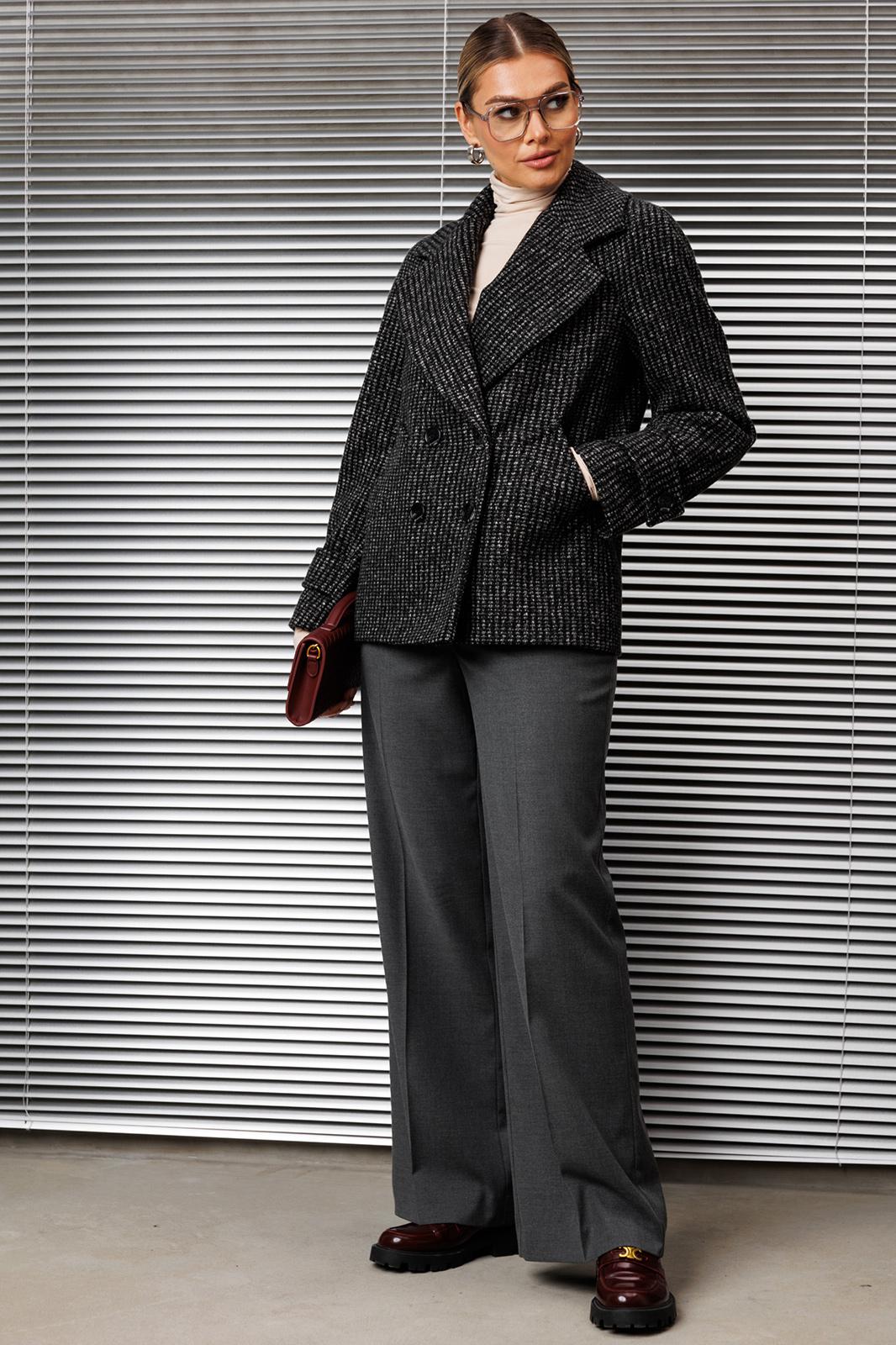 Благородные оттенки серого созданы для осени. Теплое полупальто, надетое на уютный свитер - самая нужная вещь в гардеробе современной модницы. Полупальто прямого силуэта, на полочках обработаны карманы с листочкой. Рукав реглан, двухшовный, с локтевой вытачкой. Воротник пиджачного типа. Жакет на подкладке. Брюки прямые, спереди со складками и карманами на притачном поясе, с настрочными шлевками. Застежка спереди на тесьму-молнию.