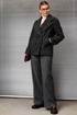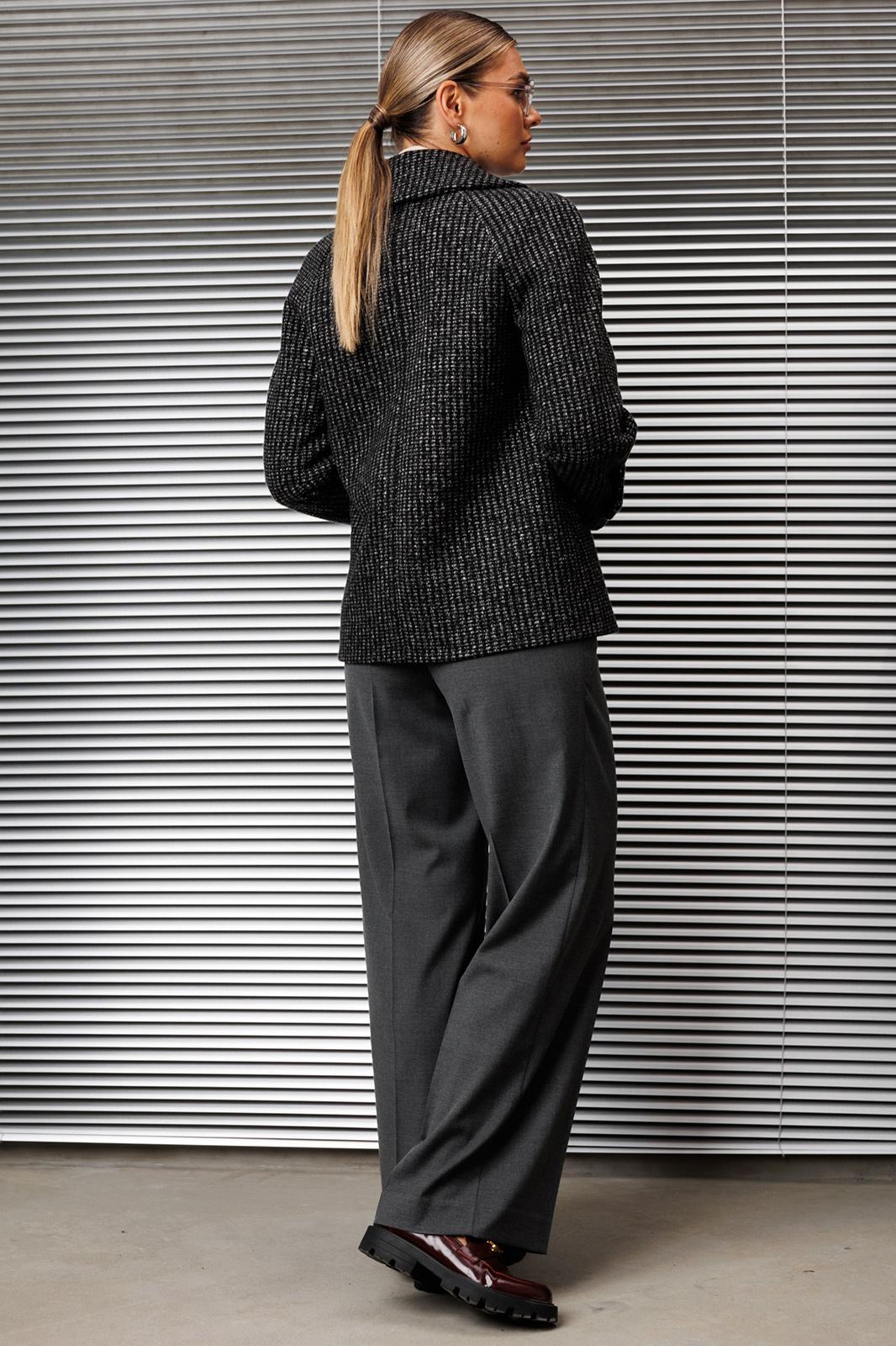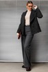 - Тип ткани: Жакет: полиамид 73%, вискоза 22,5%, спандекс 4%, люрекс 0,5%. Брюки: полиэстер 96%, спандекс 4%.