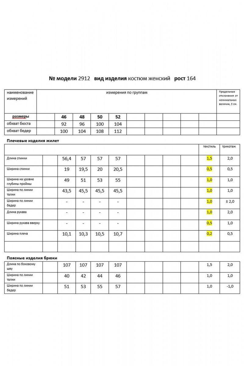 Комплект женский, состоящий из брюк и жилета. Жилет полуприлегающего силуэта с рельефами по переду и спинке, отрезной по линии талии. Низ жилета ассиметричной формы. На баске с одной стороны обработаны прорезные карманы в рамку, один из которых функциональный. Застежка двубортная на петли-пуговицы и декоративную пату. Жилет на подкладке. Брюки прямые, сверху на притачном поясе, сзади с резинкой. На передних половинках обработаны карманы. Застежка на тесьму-молнию. Данный комплект можно дополнить блузой, что позволит Вам создать разные образы.