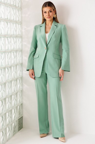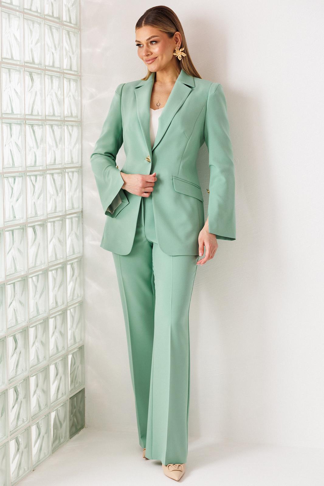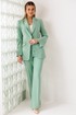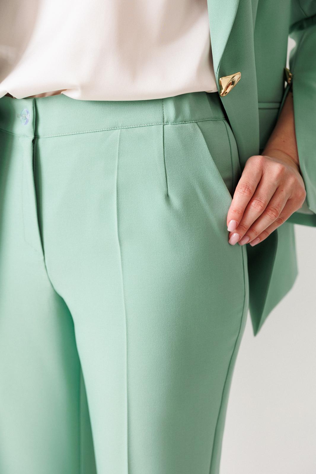 Деловой комплект, состоящий из жакета и брюк. Жакет - воплощение стильной трансформации. Его классический крой выполнен из безупречной костюмной ткани, но в деталях скрывается своенравный характер. Жакет полуприлегающего силуэта. Модель отличается аккуратным кроем и стильными деталями. На передней части жакета обработаны вертикальные рельефы, идущие от проймы до уровня кармана и от кармана до низа, что придаёт силуэту выразительность и стройность. Воротник пиджачного типа добавляет классической элегантности. Застёжка центральная бортовая на петлю-пуговицу. Карманы в рамке с клапанами, гармонично расположены на передней части жакета. Спинка с центральным швом и вертикальными рельефами, идущими от проймы. Рукава двухшовные с отрезной деталью по окату и разрезами внизу добавляют свободы движению и делают модель более интересной. Жакет на подкладке. Брюки с высокой посадкой, по линии талии – притачной пояс, в боковых швах резинка. Застежка на молнию.